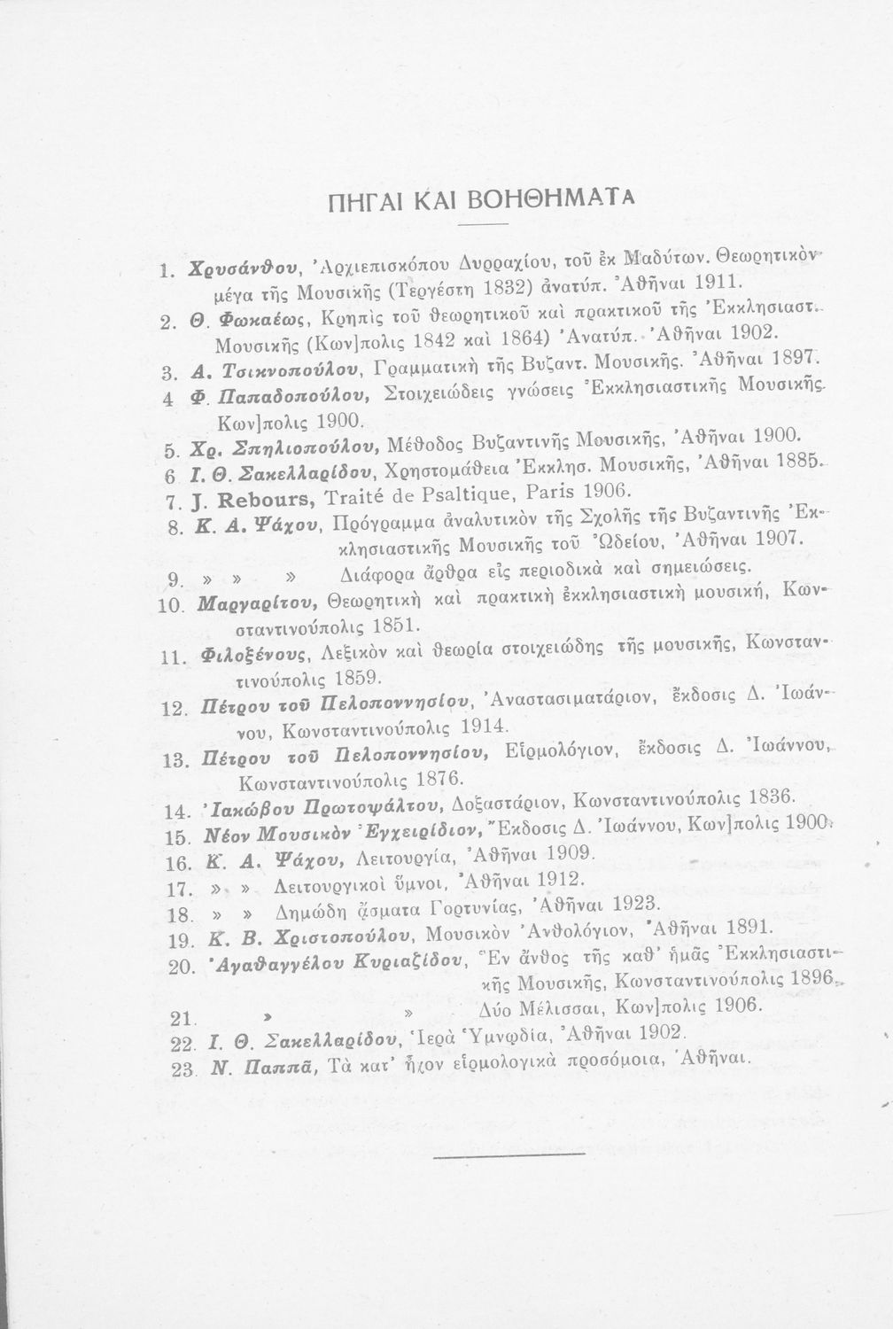 Σχολικό εγχειρίδιο Μουσικής για Ιερατικές σχολές, Διδασκαλεία και Ωδεία. Περιλαμβάνει στοιχεία Βυζαντινής Μουσικής. Ο συγγραφέας υπήρξε καθηγητής της Ριζαρείου Εκκλησιαστικής Σχολής και του Μουσικού Λυκείου Αθηνών.