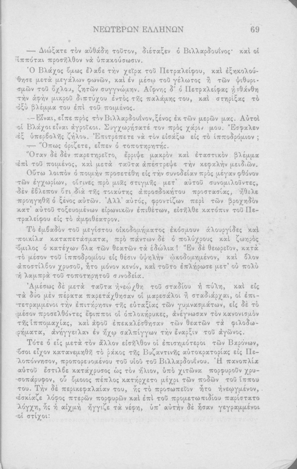 Βαθμίδα εκπαίδευσης: Δευτεροβάθμια Τάξη: Β' Ελληνικού Σχολείου Μάθημα: Νέα Ελληνικά Γλώσσα: Καθαρεύουσα Παρουσίαση περιεχομένου: Σχολικό εγχειρίδιο Νέων Ελληνικών Β' Ελληνικού Σχολείου που περιέχει πεζά και ποιήματα με θεματολογία από τη θρησκευτική, ιστορική και κοινωνική ζωή του τόπου καθώς και βιογραφίες των συγγραφέων. |