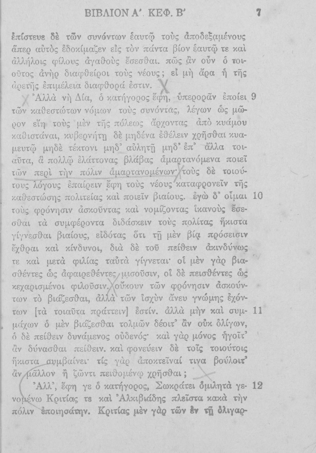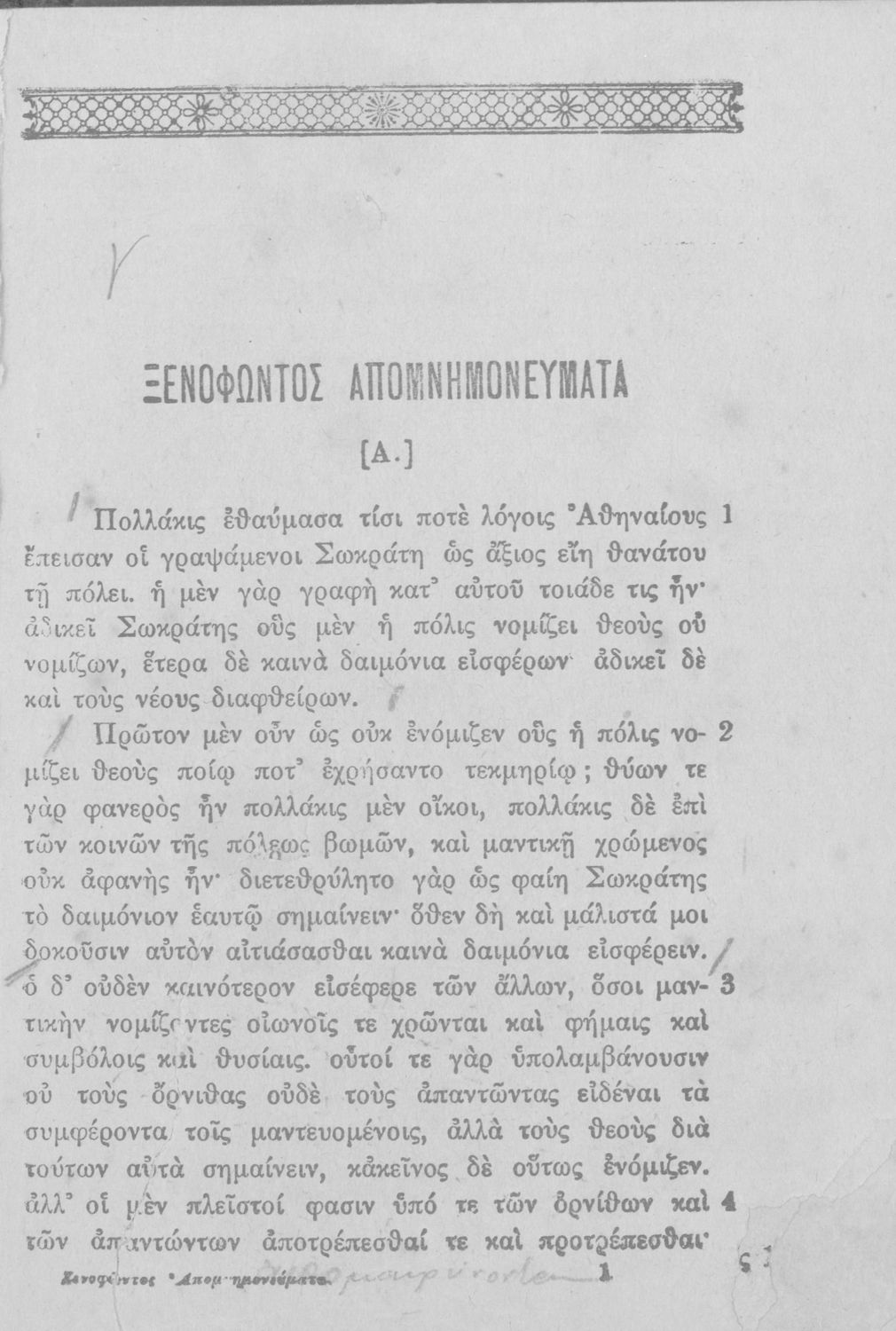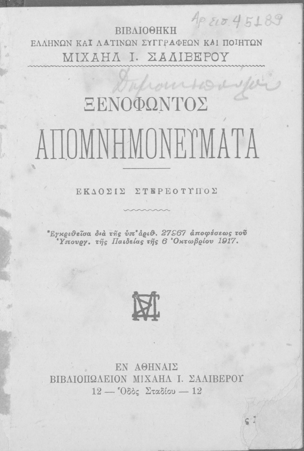 Σχολικό εγχειρίδιο Αρχαίων Ελληνικών για τη Δευτεροβάθμια Εκπαίδευση που περιέχει τα Απομνημονεύματα του Ξενοφώντα.