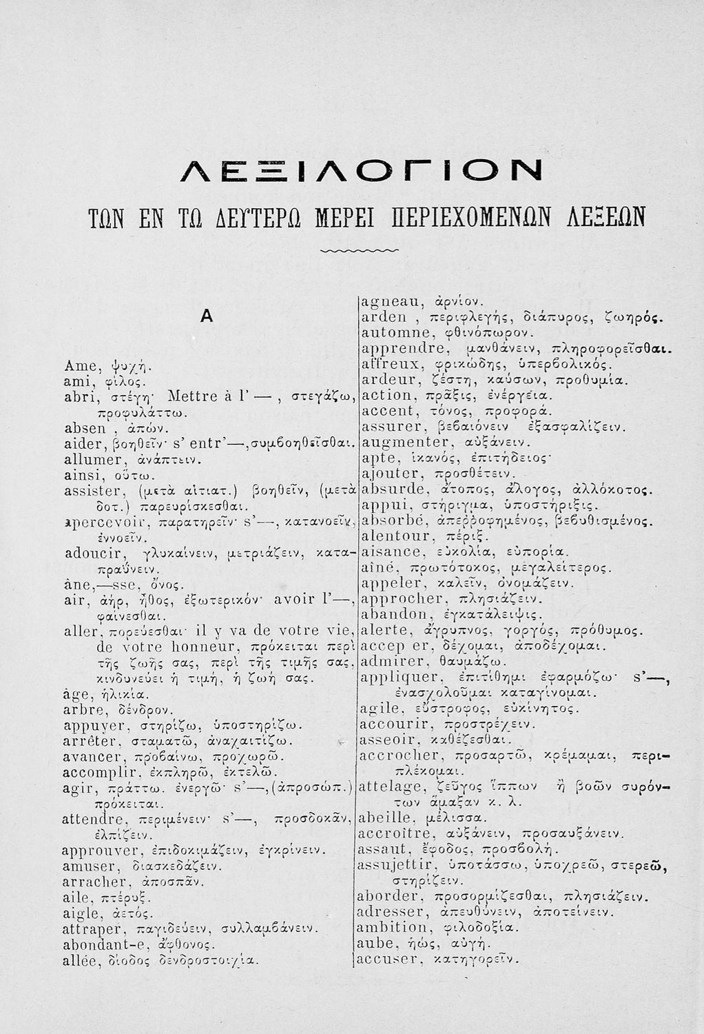 Αναγνωστικό Γαλλικών που περιλαμβάνει κείμενα στα γαλλικά και ελληνικά, θεωρία και λεξιλόγιο.