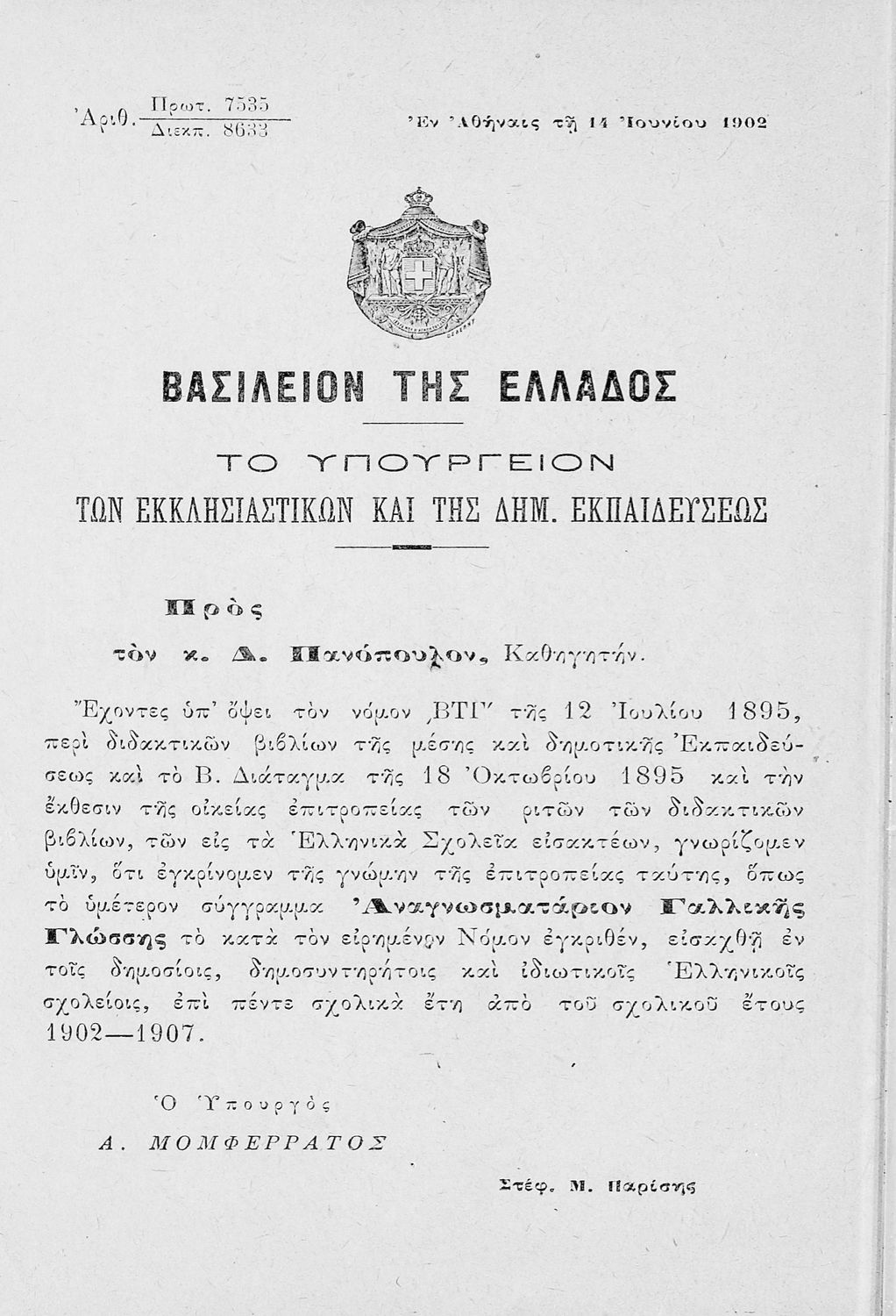 Υπουργική απόφαση / Σύμβαση: 7535/14-6-1902
