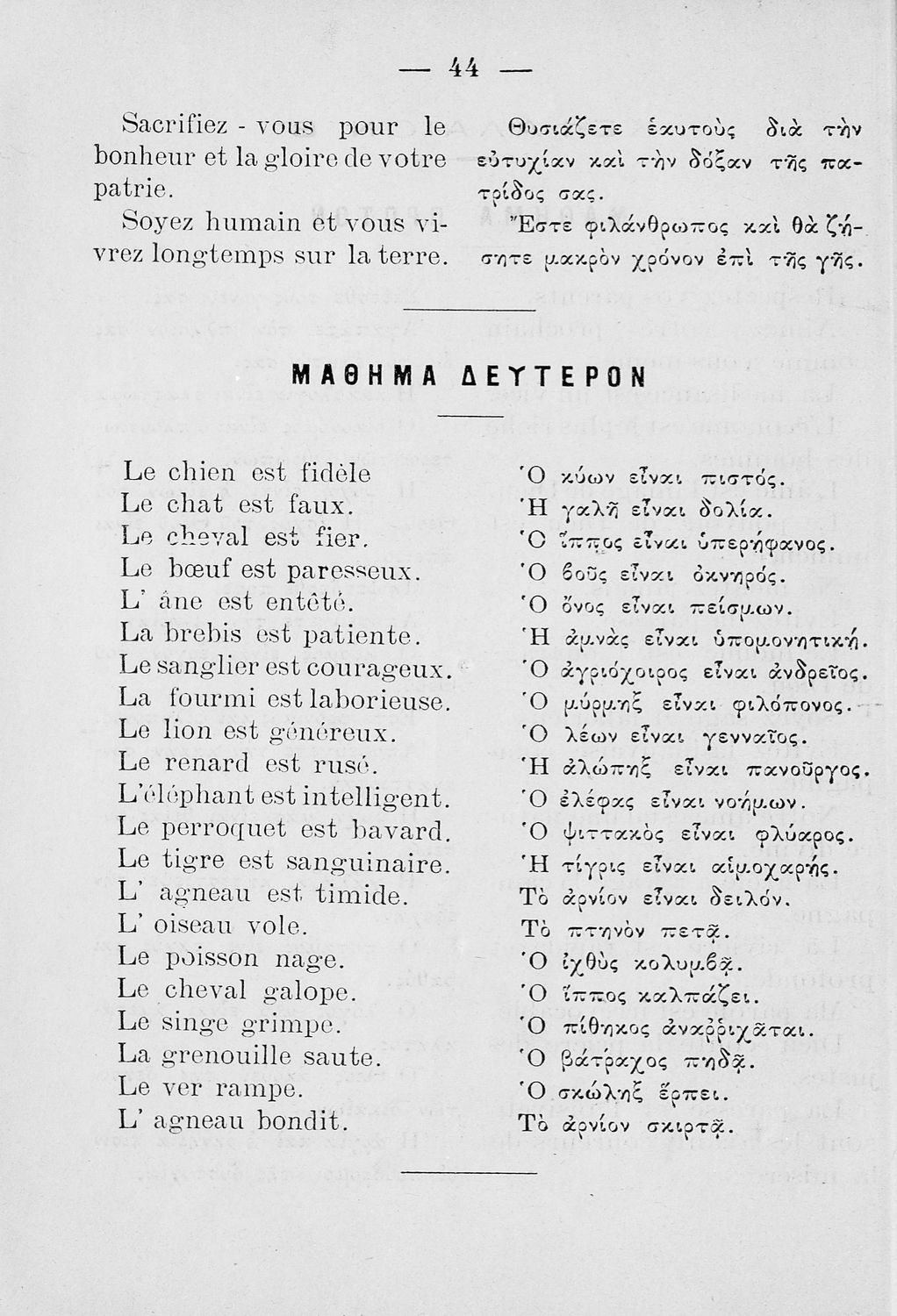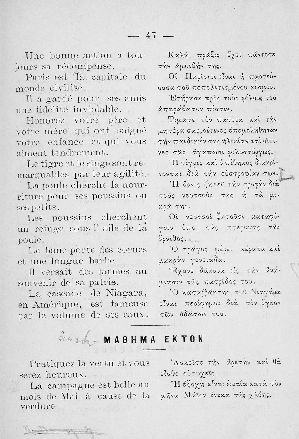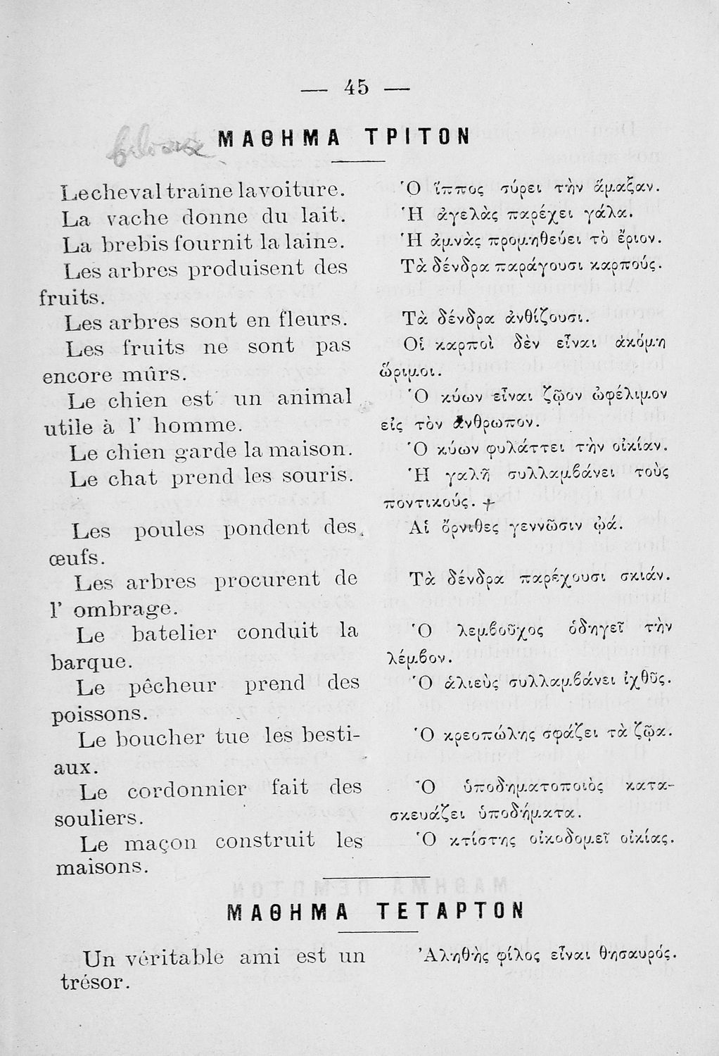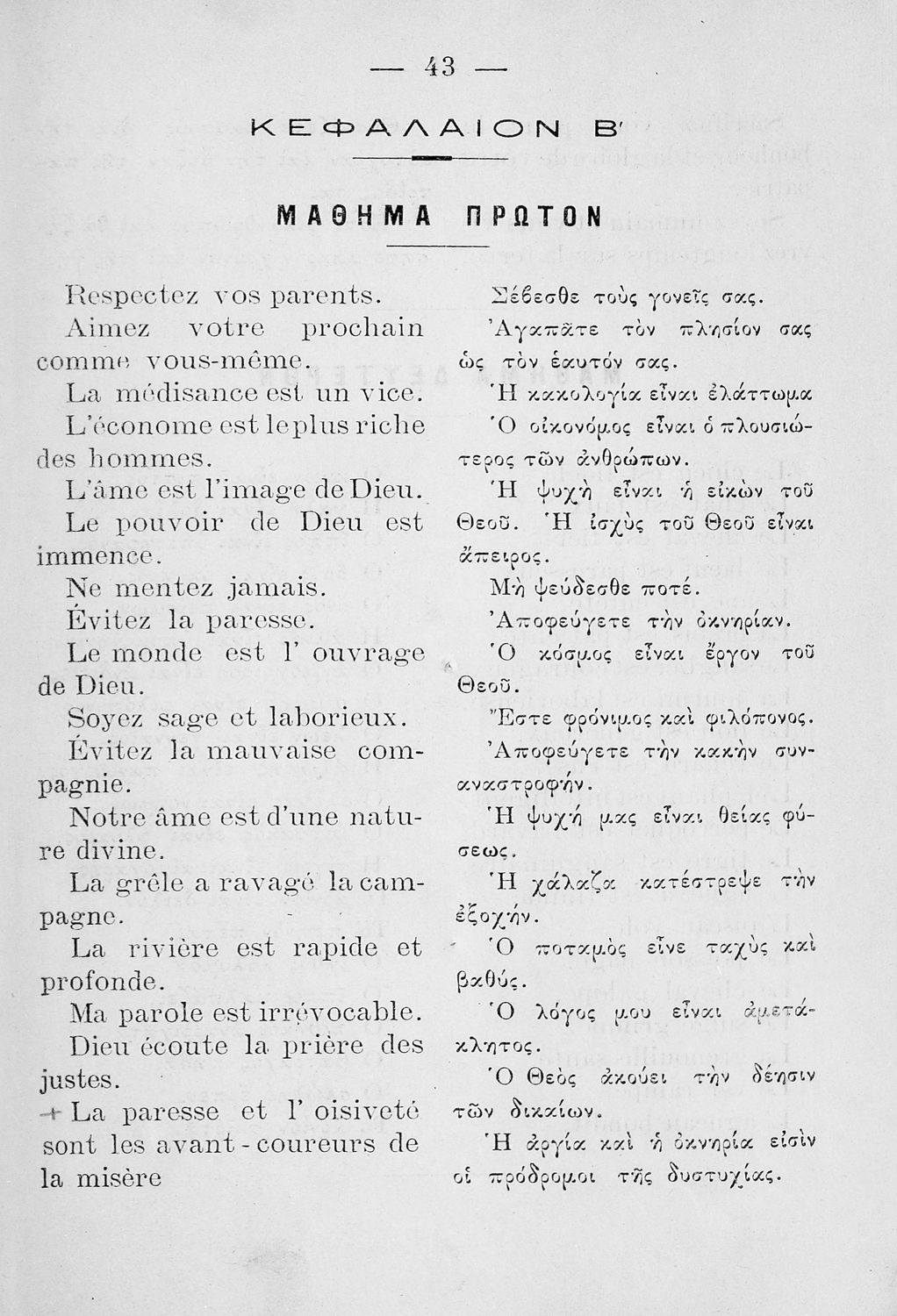 Αναγνωστικό Γαλλικών που περιλαμβάνει κείμενα στα γαλλικά και ελληνικά, θεωρία και λεξιλόγιο.