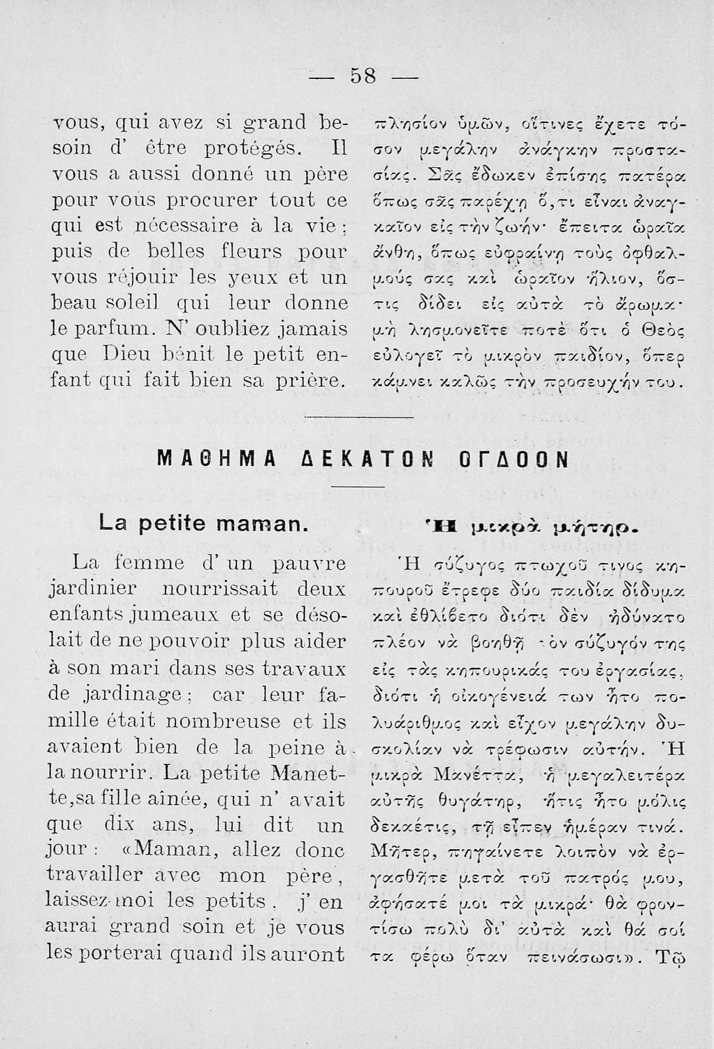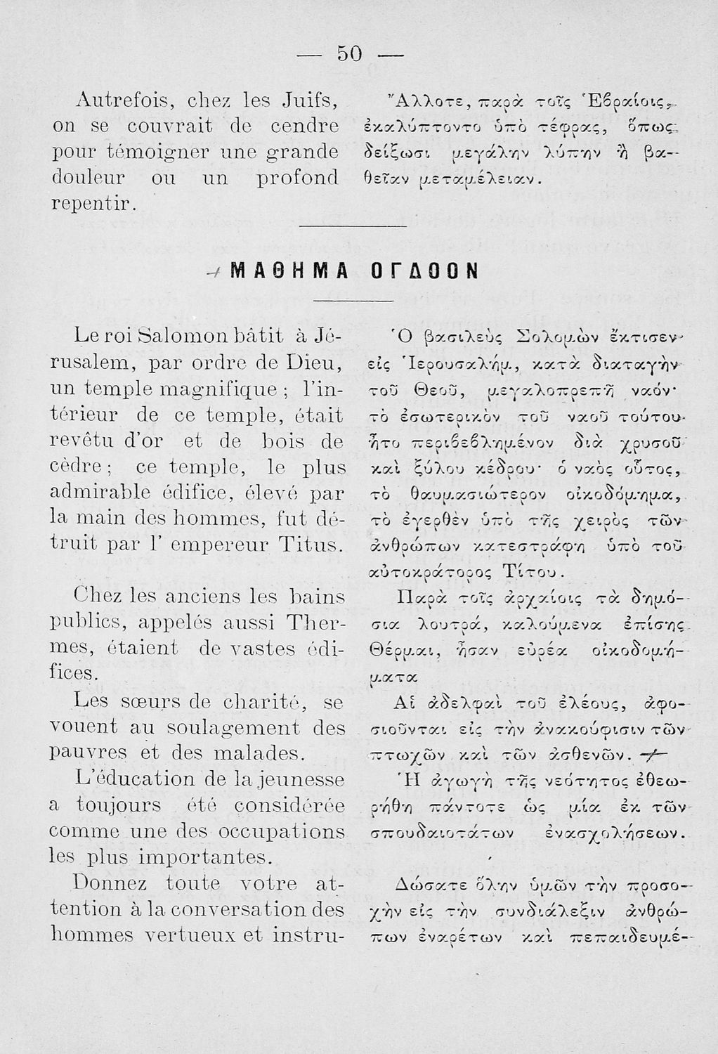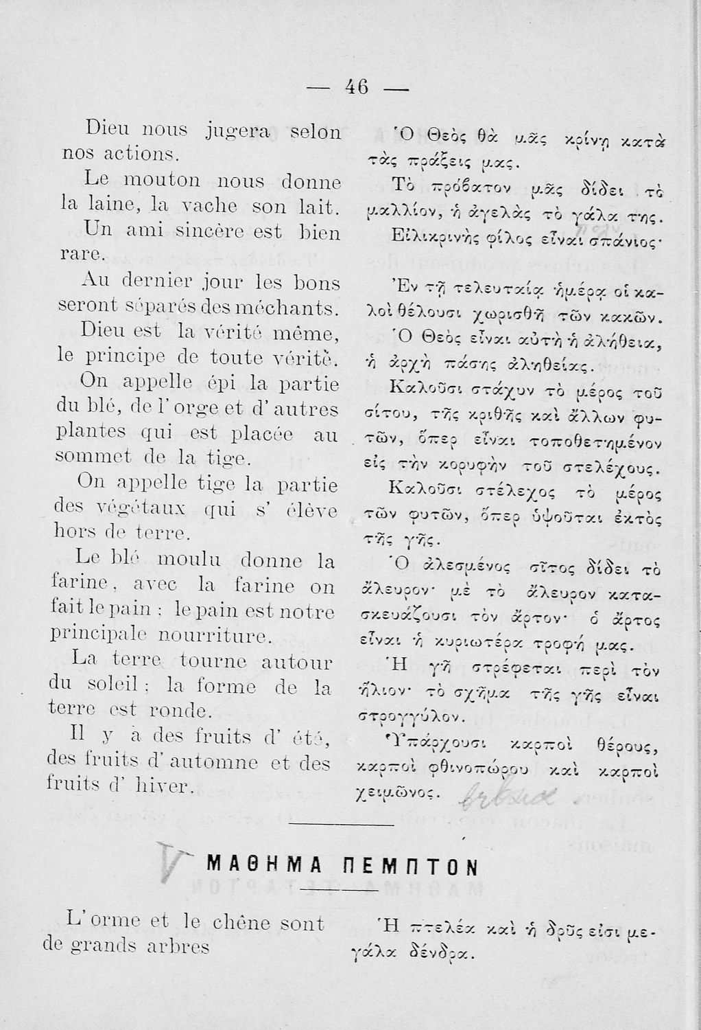 Αναγνωστικό Γαλλικών που περιλαμβάνει κείμενα στα γαλλικά και ελληνικά, θεωρία και λεξιλόγιο.