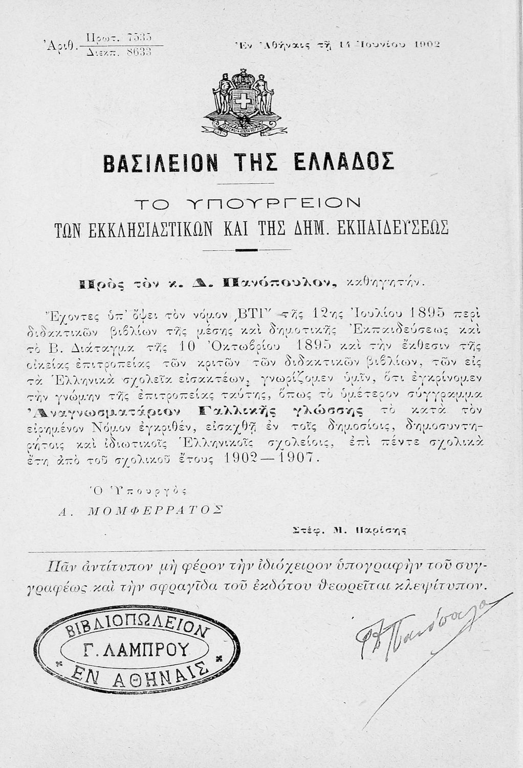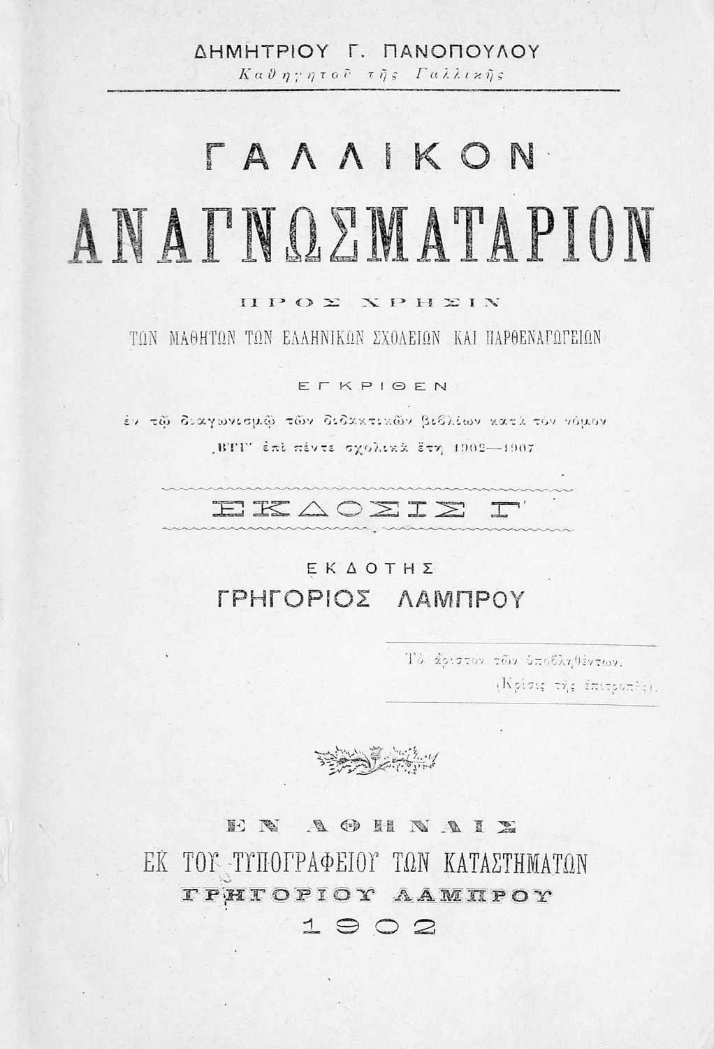 Εκδότης: Γρηγόριος Λάμπρου Έτος έκδοσης: 1902 Τόπος έκδοσης: Αθήνα Έκδοση: 3η Υπουργική απόφαση / Σύμβαση: 7535/14-6-1902 Έτος έγκρισης: 1902 |