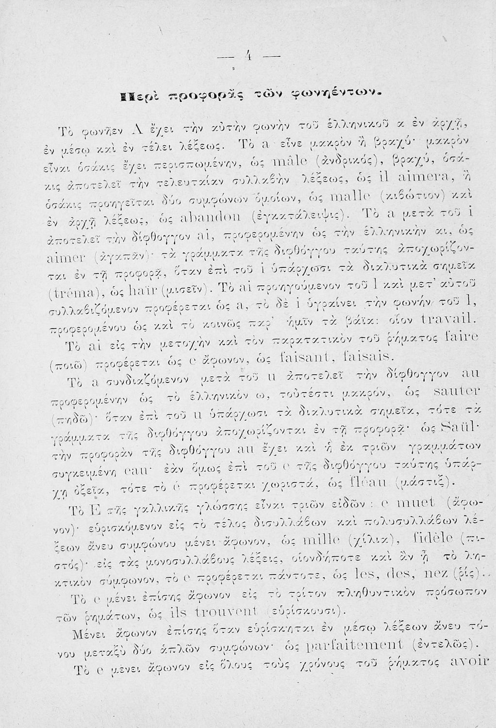 Βαθμίδα εκπαίδευσης: Δευτεροβάθμια Τάξη: Ελληνικό Σχολείο / Παρθεναγωγείο Μάθημα: Γαλλικά Γλώσσα: Απλή καθαρεύουσα Παρουσίαση περιεχομένου: Αναγνωστικό Γαλλικών που περιλαμβάνει κείμενα στα γαλλικά και ελληνικά, θεωρία και λεξιλόγιο. |