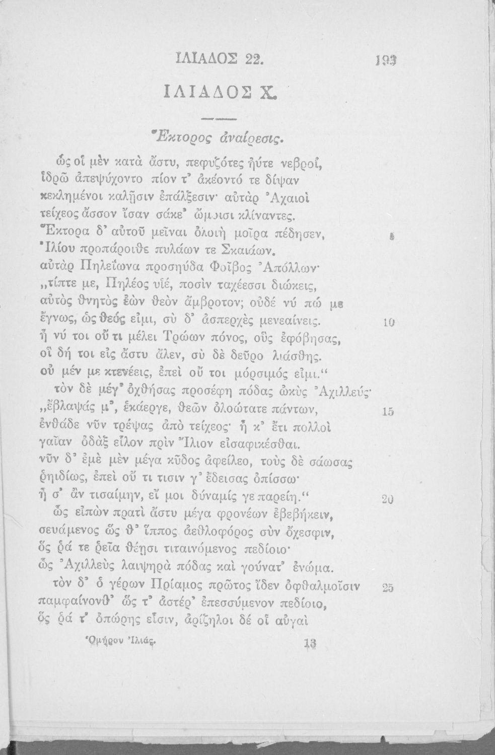 Παιδαγωγικό βοήθημα Αρχαίων Ελληνικών. Περιέχει την Ιλιάδα του Ομήρου με ερμηνεία του Γυμνασιάρχη Α. Ξ. Καραπαναγιώτη. Περιέχει την ραψωδία Γ'.