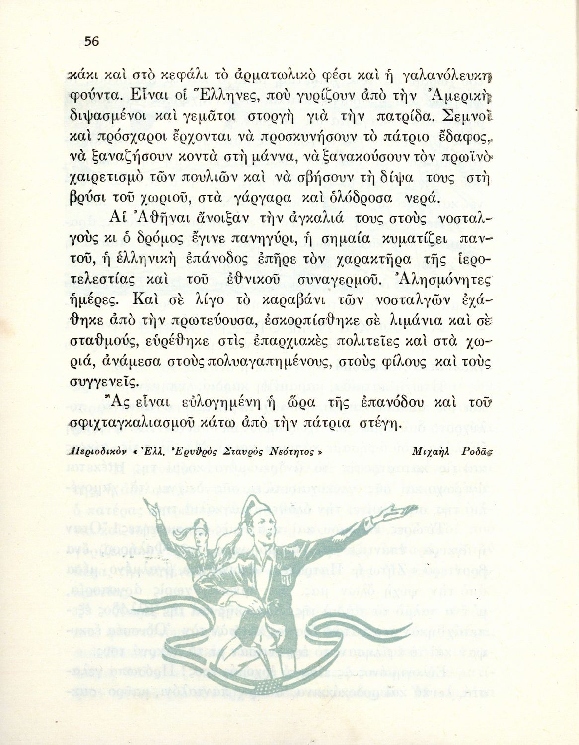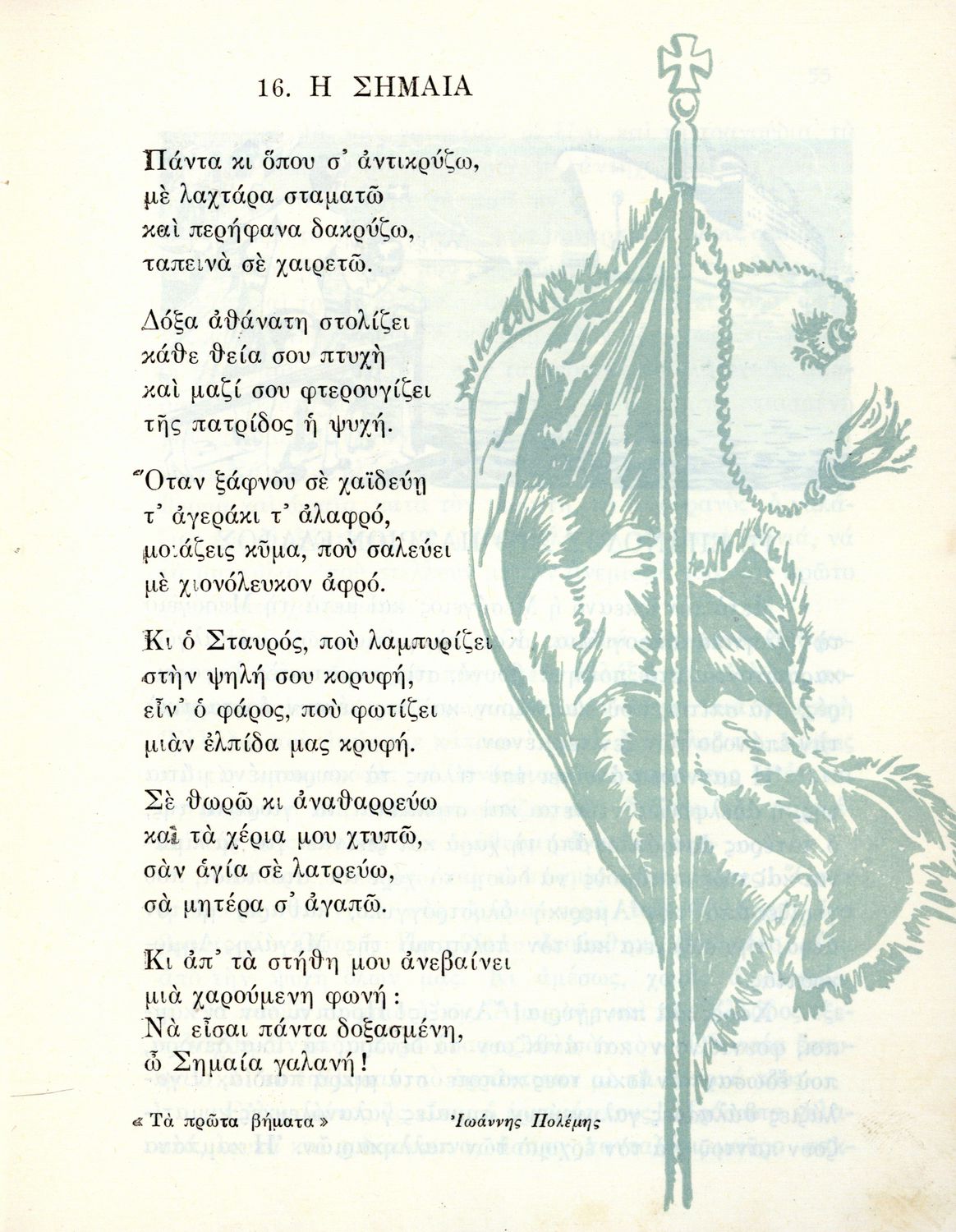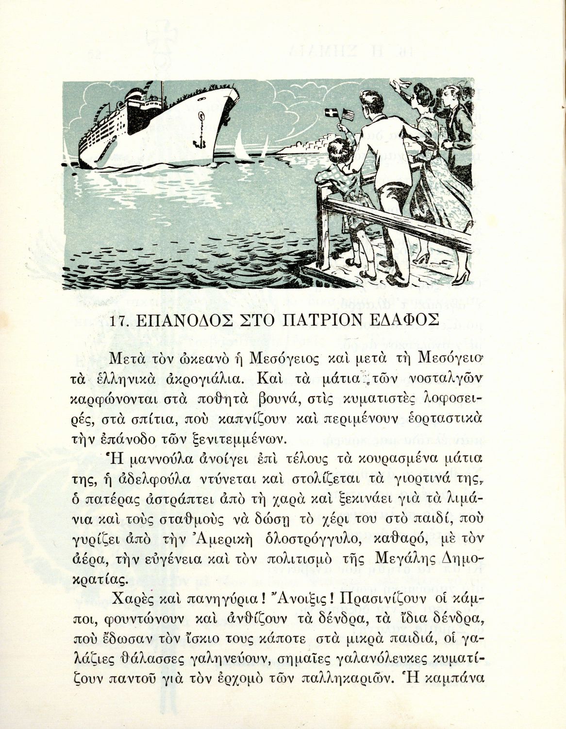 Αναγνωστικό Ε΄ Δημοτικού που περιέχει κείμενα εμπνευσμένα από την εθνική, κοινωνική και οικογενειακή ζωή και την ελληνική φύση, μυθολογία και ιστορία. Φέρει το σύμβολο της δικτατορίας.