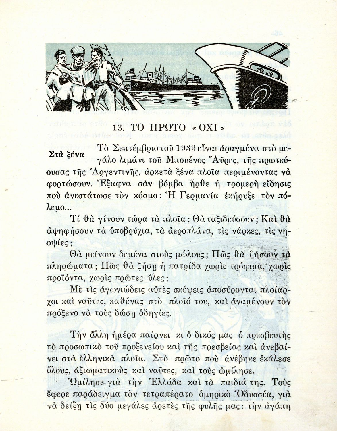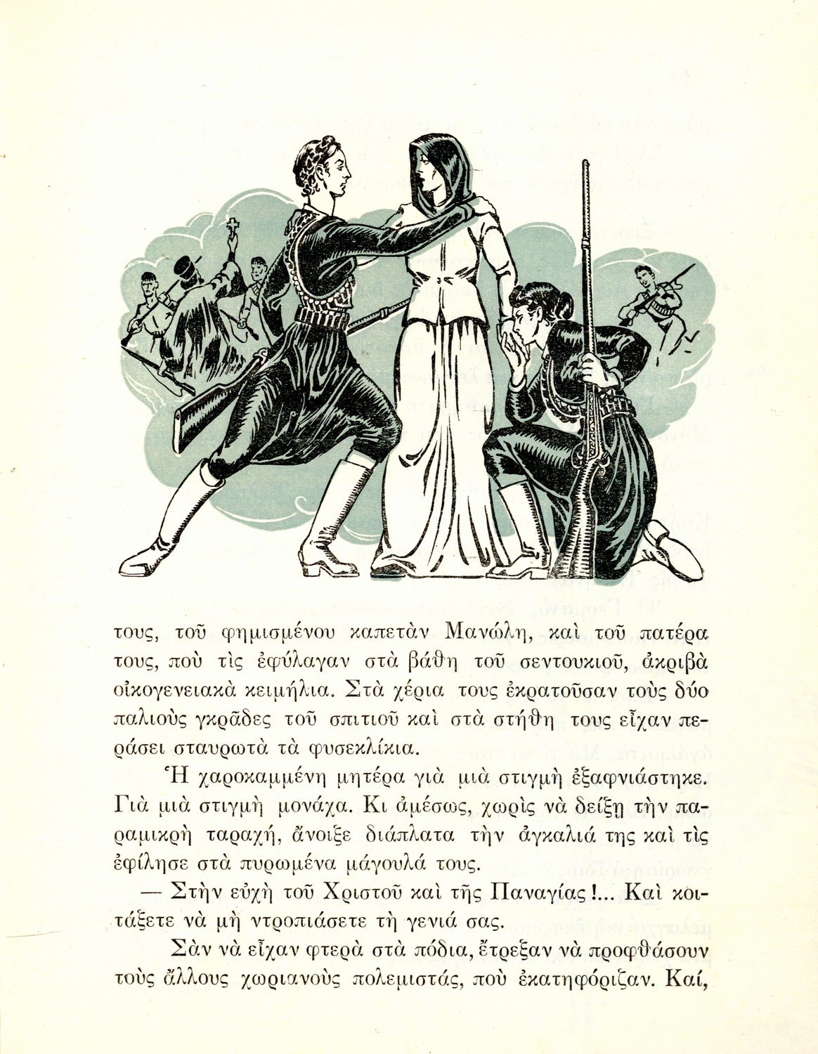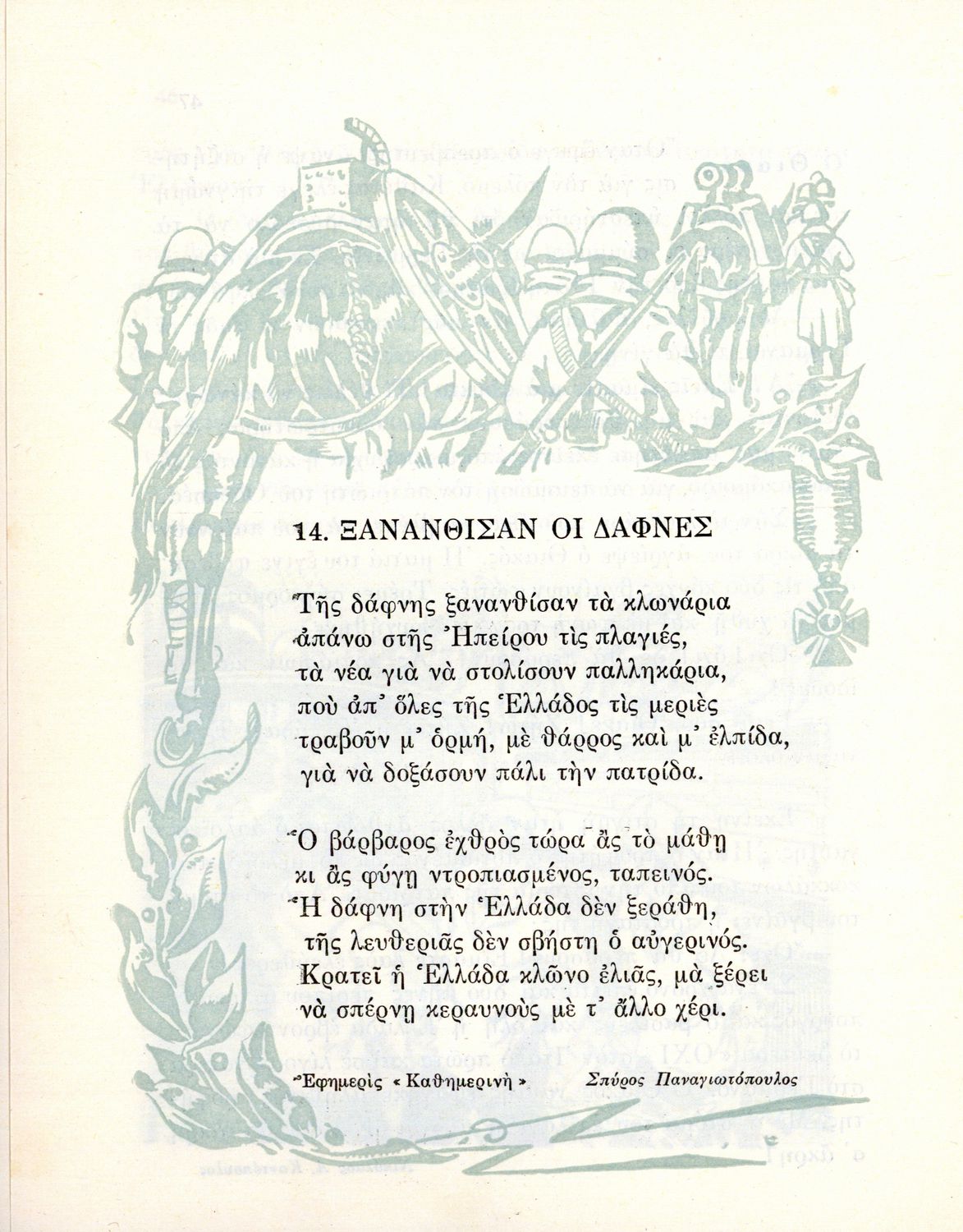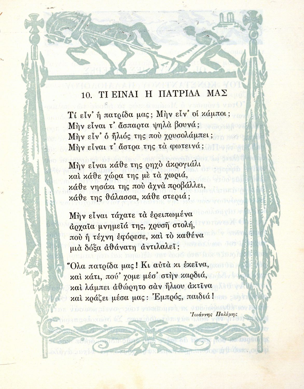 Αναγνωστικό Ε΄ Δημοτικού που περιέχει κείμενα εμπνευσμένα από την εθνική, κοινωνική και οικογενειακή ζωή και την ελληνική φύση, μυθολογία και ιστορία. Φέρει το σύμβολο της δικτατορίας.
