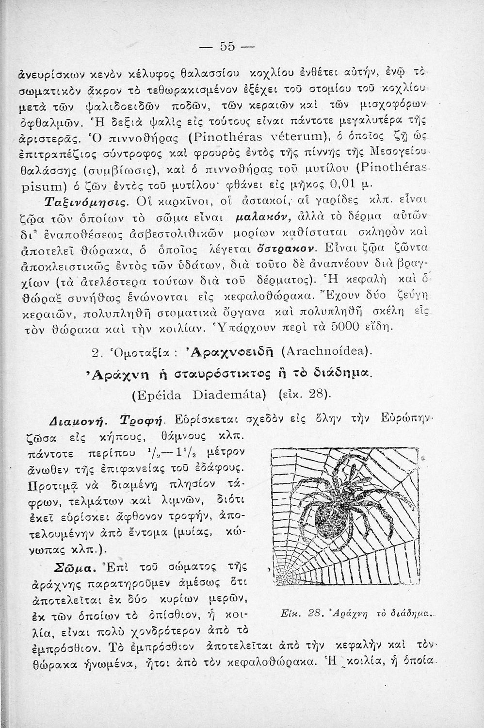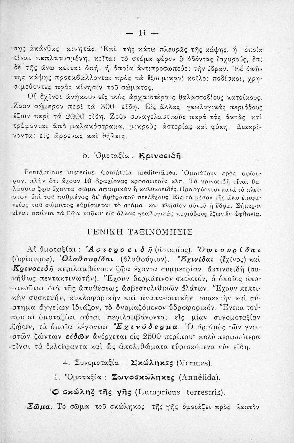 Βαθμίδα εκπαίδευσης: Δευτεροβάθμια Τάξη: Γ’ Γυμνασίου Μάθημα: Ζωολογία Γλώσσα: Καθαρεύουσα Παρουσίαση περιεχομένου: Σχολικό εγχειρίδιο Ζωολογίας Γ΄ Γυμνασίου που παρουσιάζει τα διάφορα ζώα ανάλογα με την συνομοταξία στην οποία ανήκουν. |