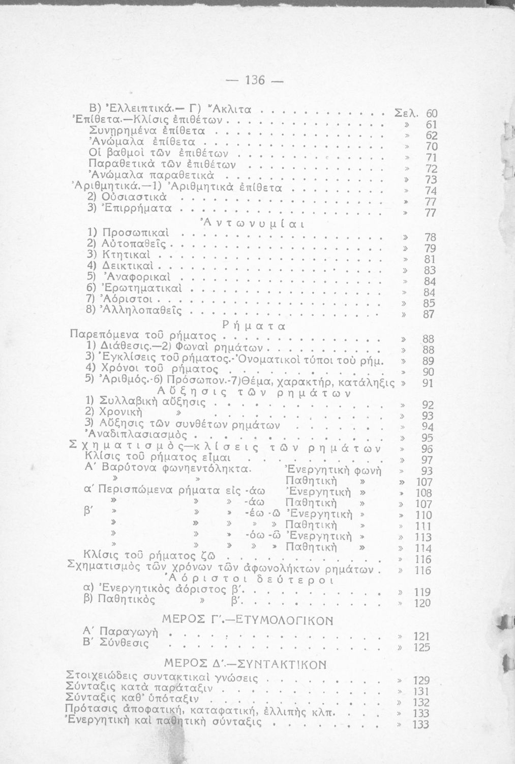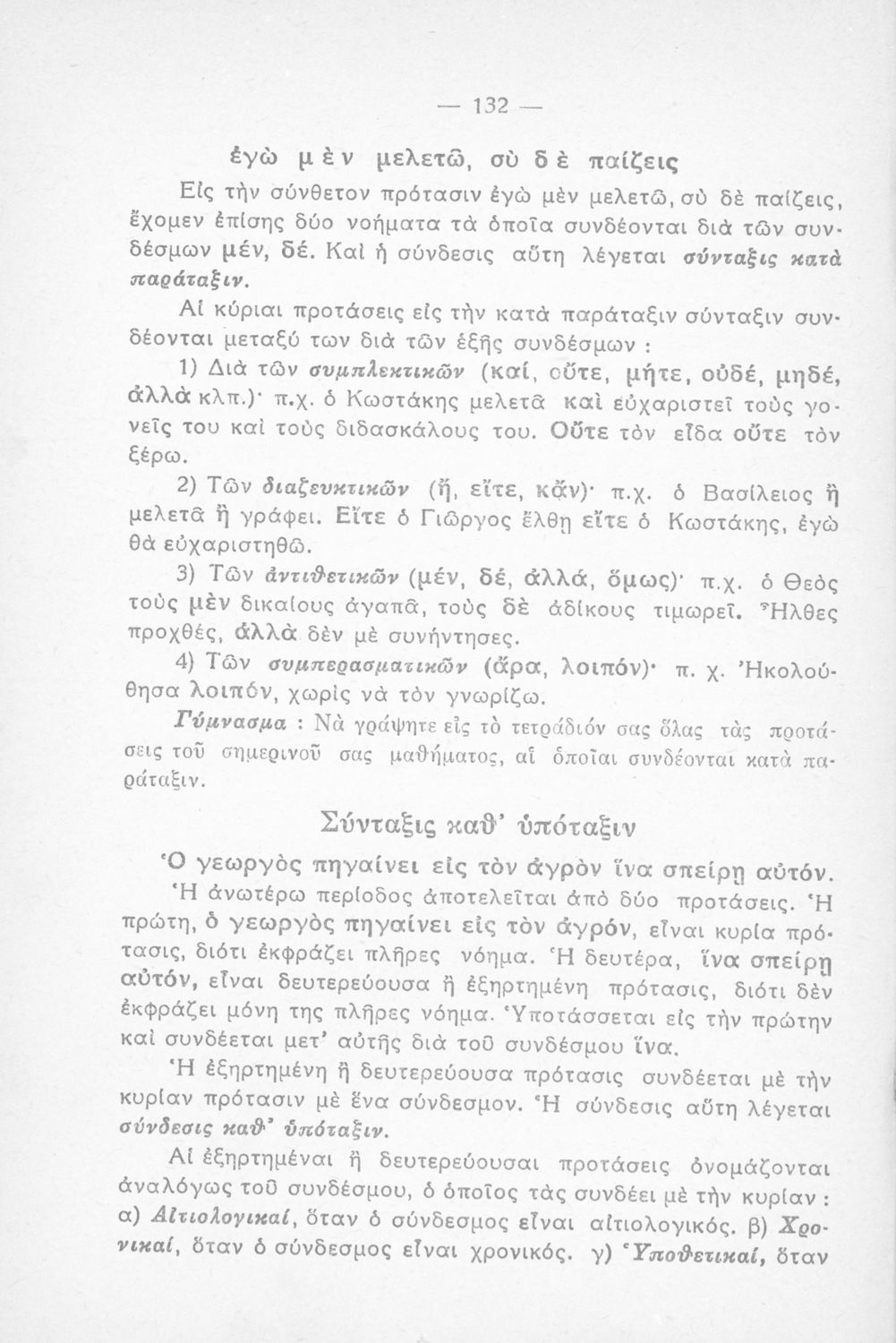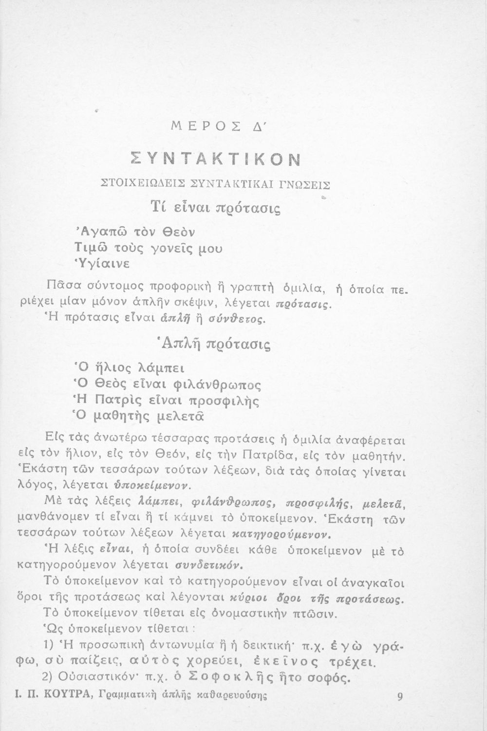 Κωδικός αναγνώρισης: 01-45198 Τίτλος: Γραμματική της απλής καθαρευούσης δια την Ε' και ΣΤ' τάξιν των δημοτικών Σχολείων Συγγραφέας: Ιω. Π. Κούτρας Μέγεθος και υπόστρωμα: Μαθητικό βοήθημα, 20εκ., μαλακό εξώφυλλο, 136 σελίδες. |