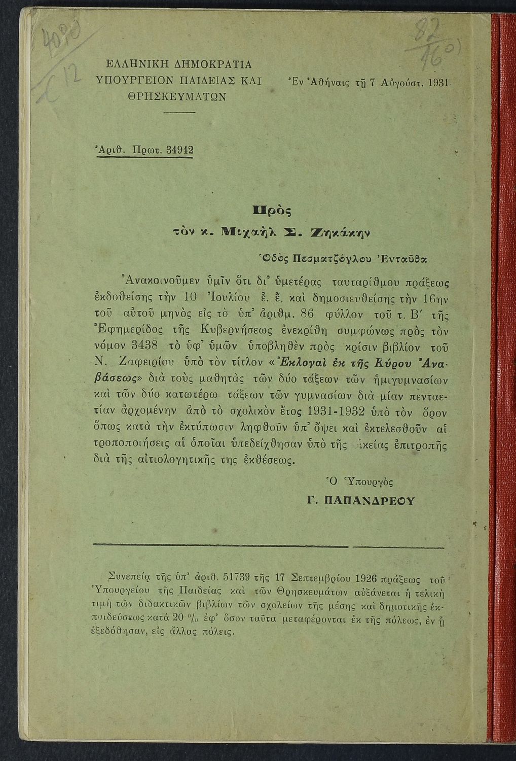 Υπουργική απόφαση / Σύμβαση: 34942/7-8-1931