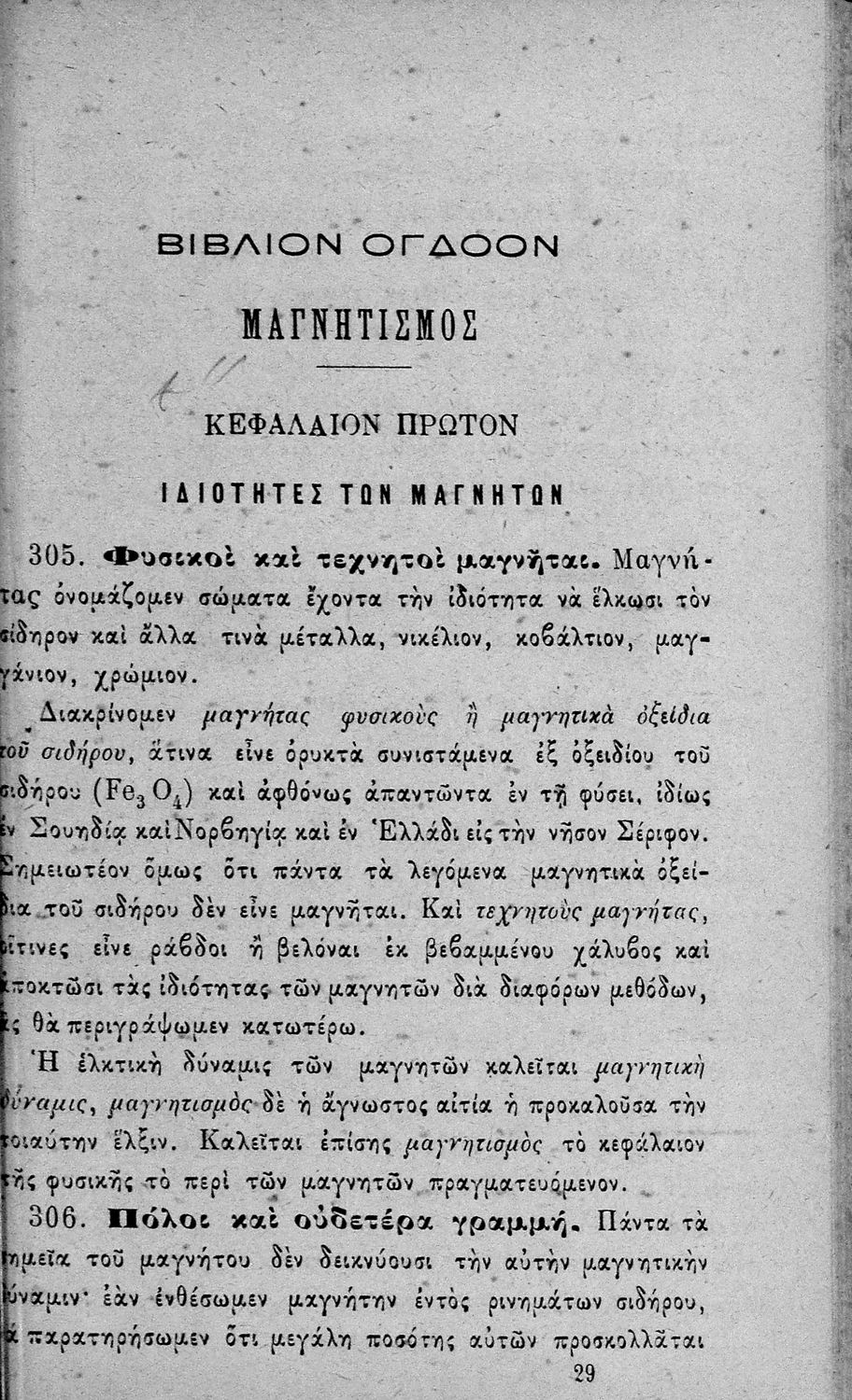 Βαθμίδα εκπαίδευσης: Δευτεροβάθμια Τάξη: Γυμνάσιο / Διδασκαλείο Μάθημα: Φυσική Γλώσσα: Καθαρεύουσα Παρουσίαση περιεχομένου: Σχολικό εγχειρίδιο για τις Τάξεις του Γυμνασίου και Διδασκαλείων για το μάθημα της Φυσικής στην Δευτεροβάθμια Εκπαίδευση. Παρέχει βασικές γνώσεις της φυσικής επιστήμης και αναλύει τις ιδιότητες των σωμάτων, καθώς και της θερμότητας, του ηλεκτρισμού και του μαγνητισμού, τις δυνάμεις, την πίεση. Περιέχει εικόνες και σχεδιαγράμματα τα οποία βοηθούν τη διδασκαλία. |