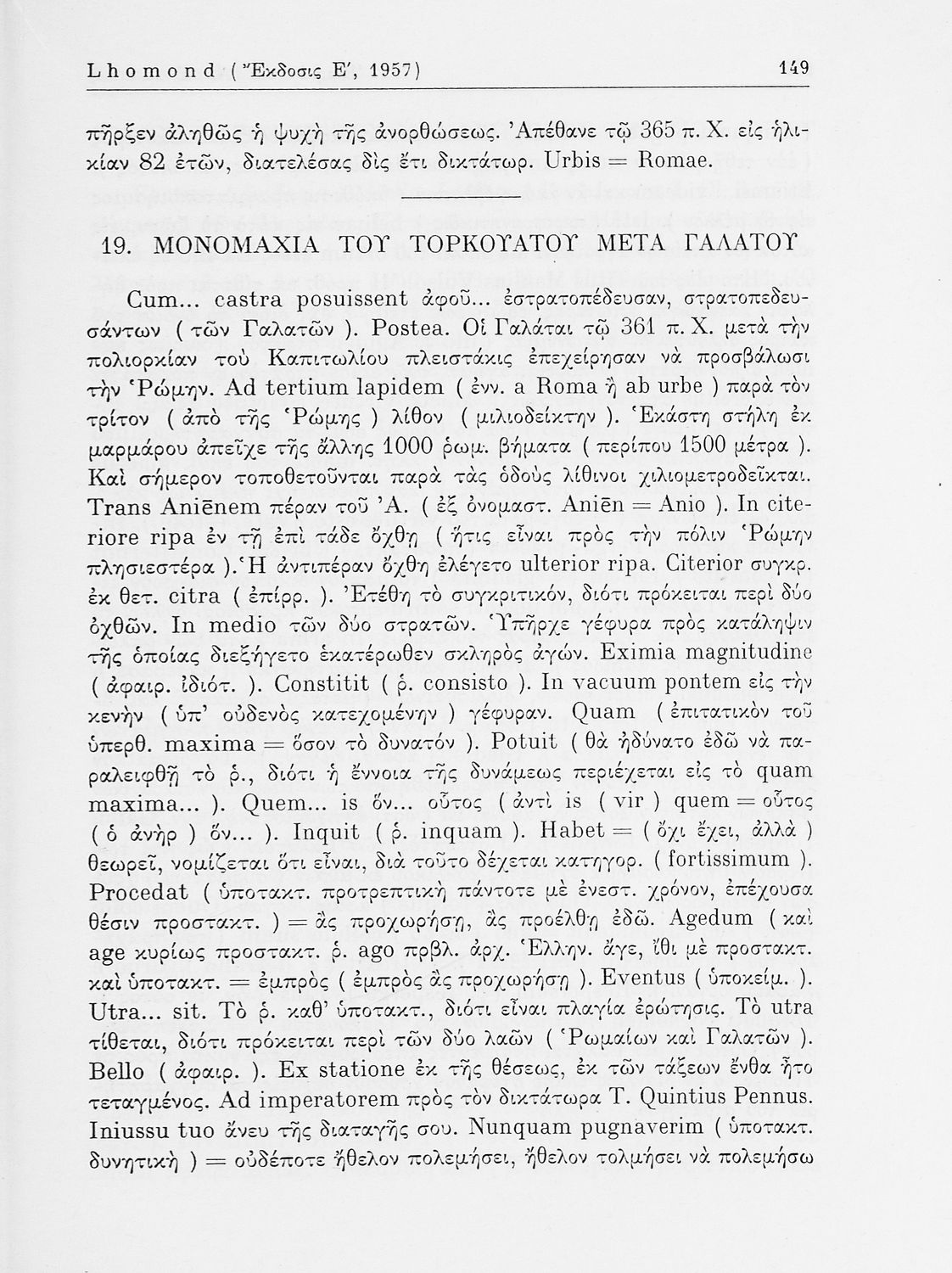 Αναγνωστικό Λατινικών για τη Γ΄ Γυμνασίου που περιέχει 54 κείμενα/περικοπές στα λατινικά, ερμηνευτικά υπομνήματα, λεξιλόγιο και κατάλογο με τα συντακτικά φαινόμενα (αφαιρετική, προθέσεις, σύνδεσμοι) που διδάσκονται με βάση τις περικοπές. Αναγνωστικό Λατινικών που περιέχει σύντομο βιογραφικό σημείωμα του Lhomond, 64 αποσπάσματα από το βιβλίο του, ερμηνευτικές σημειώσεις και λεξιλόγιο. Παρουσιάζει βίους επιφανών Ρωμαίων από το 753 π.Χ μέχρι το 14 μ.Χ. Ο επιμελητής ήταν καθηγητής της Λατινικής Φιλολογίας στο Πανεπιστήμιο Αθηνών.