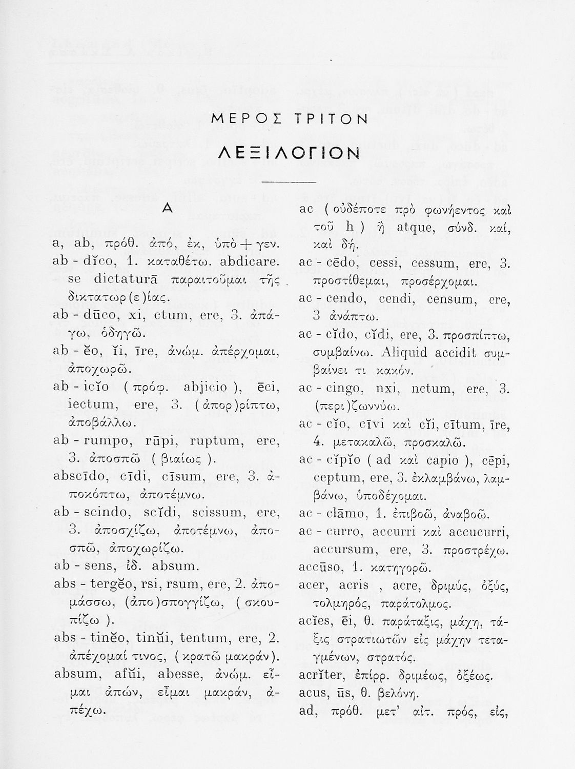 Σχολικό εγχειρίδιο Λατινικών για τη Γ΄ Γυμνασίου που περιέχει 54 κείμενα/περικοπές στα λατινικά, ερμηνευτικά υπομνήματα, λεξιλόγιο και κατάλογο με τα συντακτικά φαινόμενα (αφαιρετική, προθέσεις, σύνδεσμοι) που