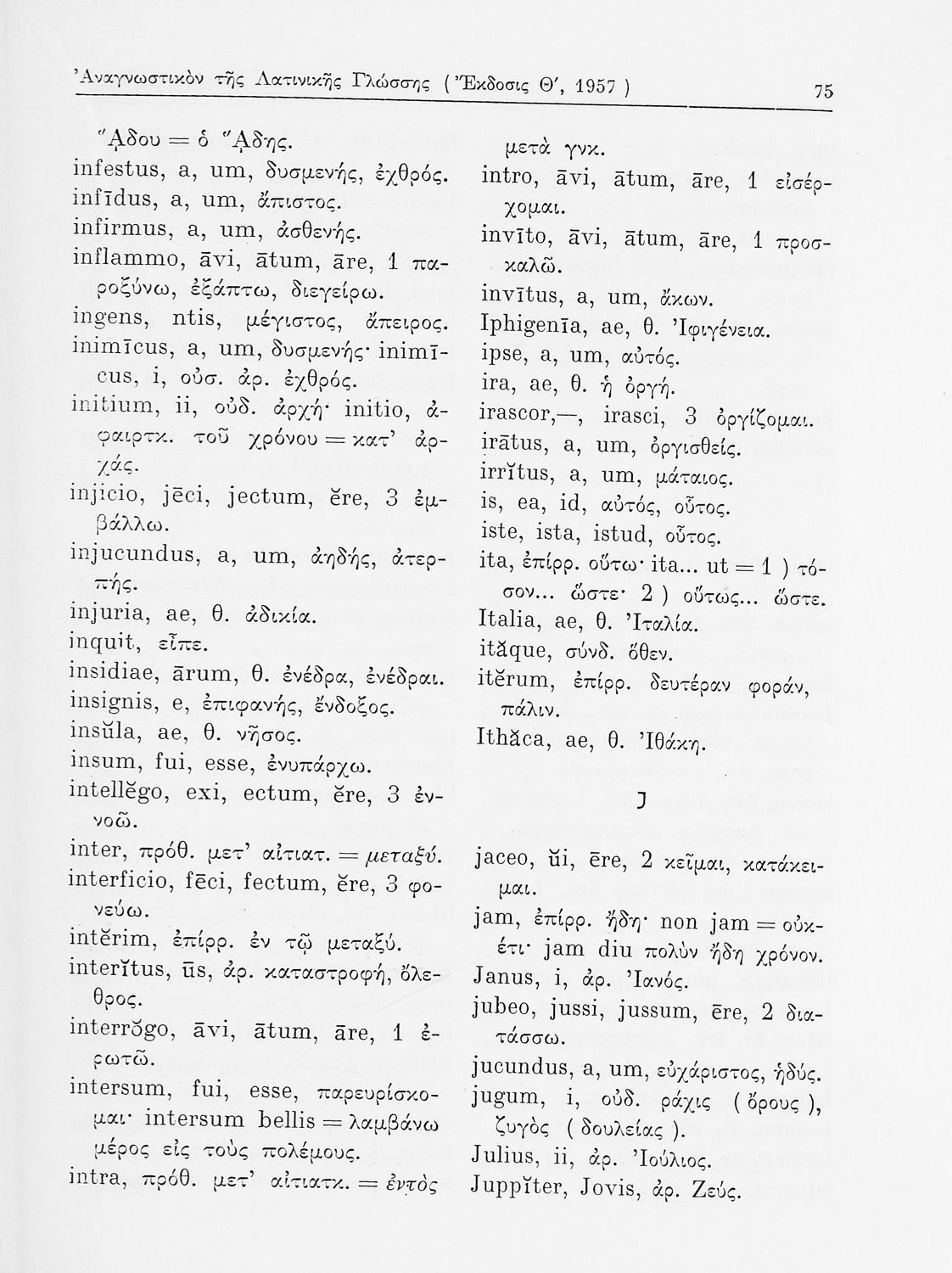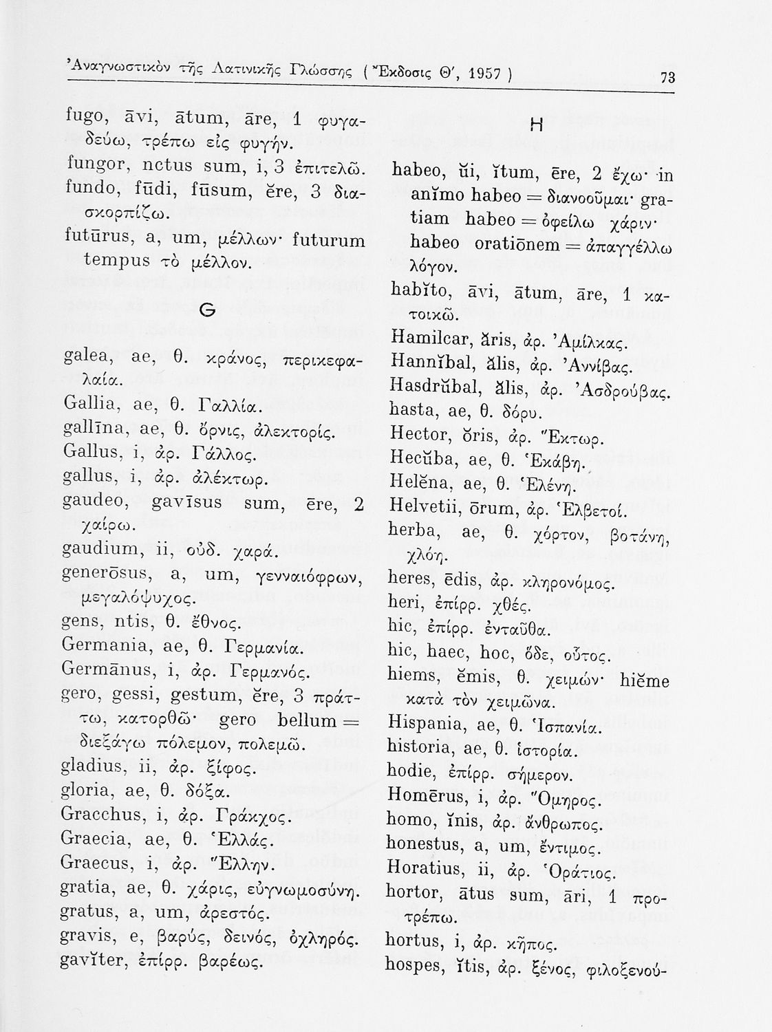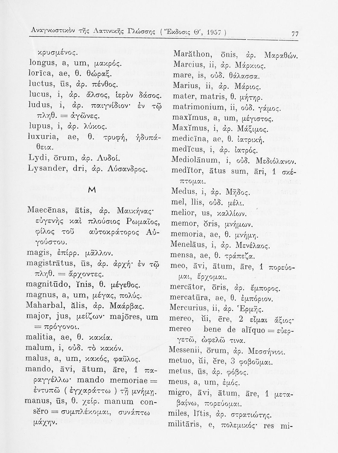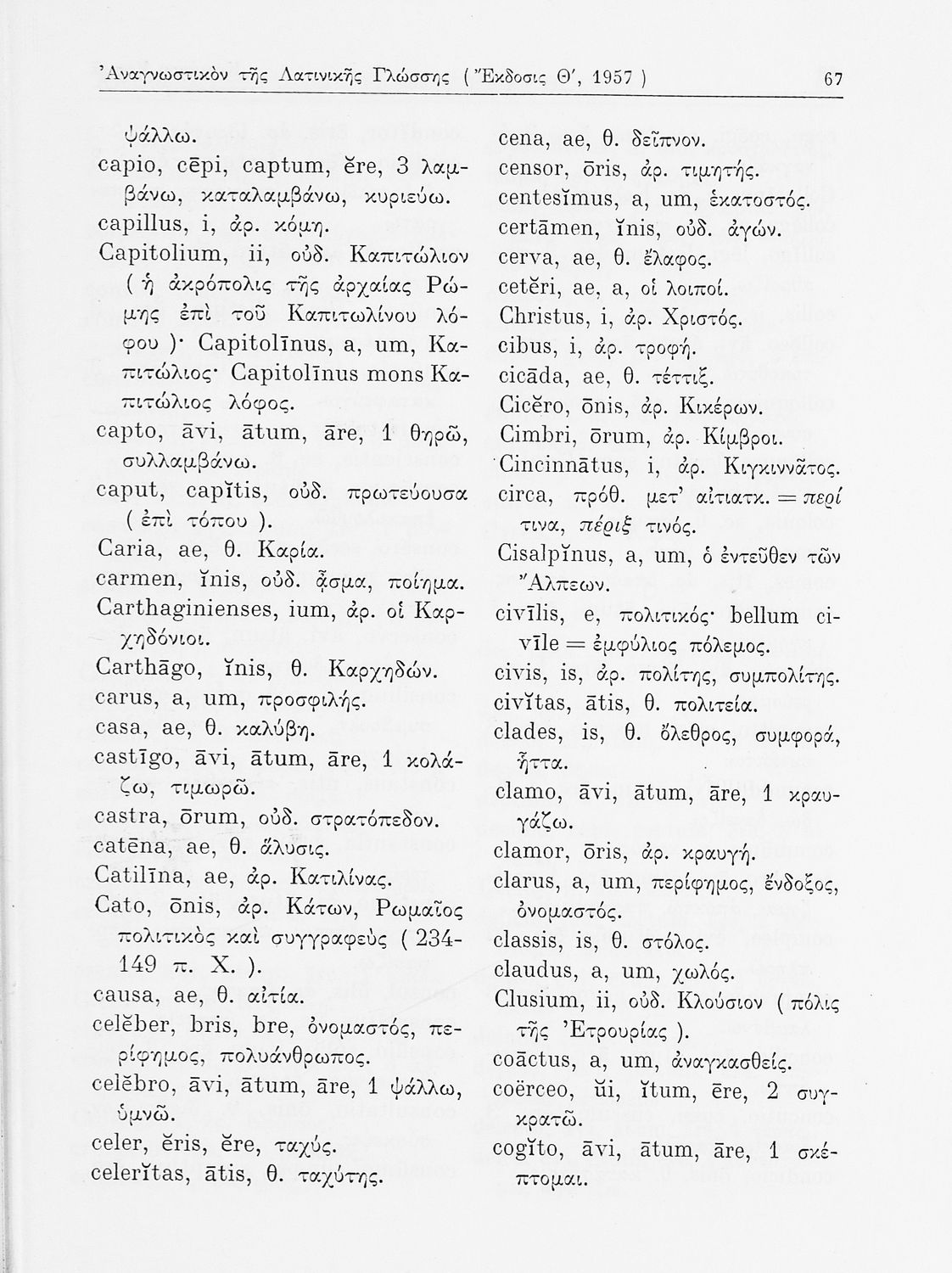 Σχολικό εγχειρίδιο Λατινικών για τη Γ΄ Γυμνασίου που περιέχει 54 κείμενα/περικοπές στα λατινικά, ερμηνευτικά υπομνήματα, λεξιλόγιο και κατάλογο με τα συντακτικά φαινόμενα (αφαιρετική, προθέσεις, σύνδεσμοι) που