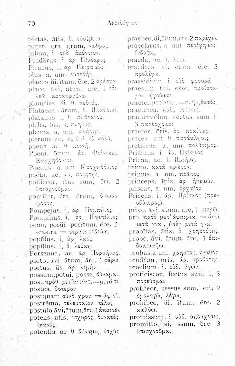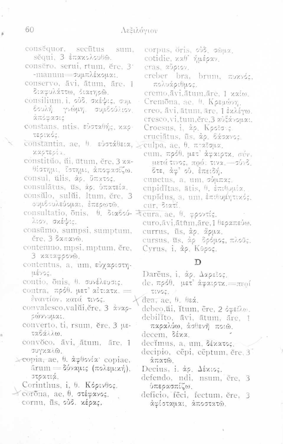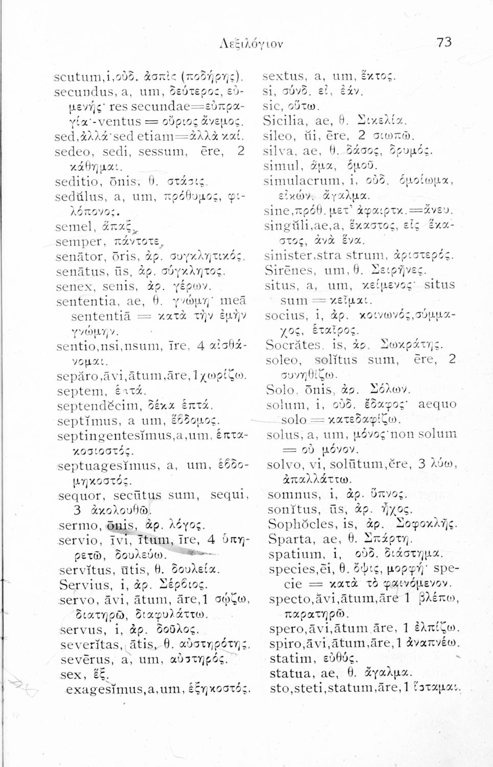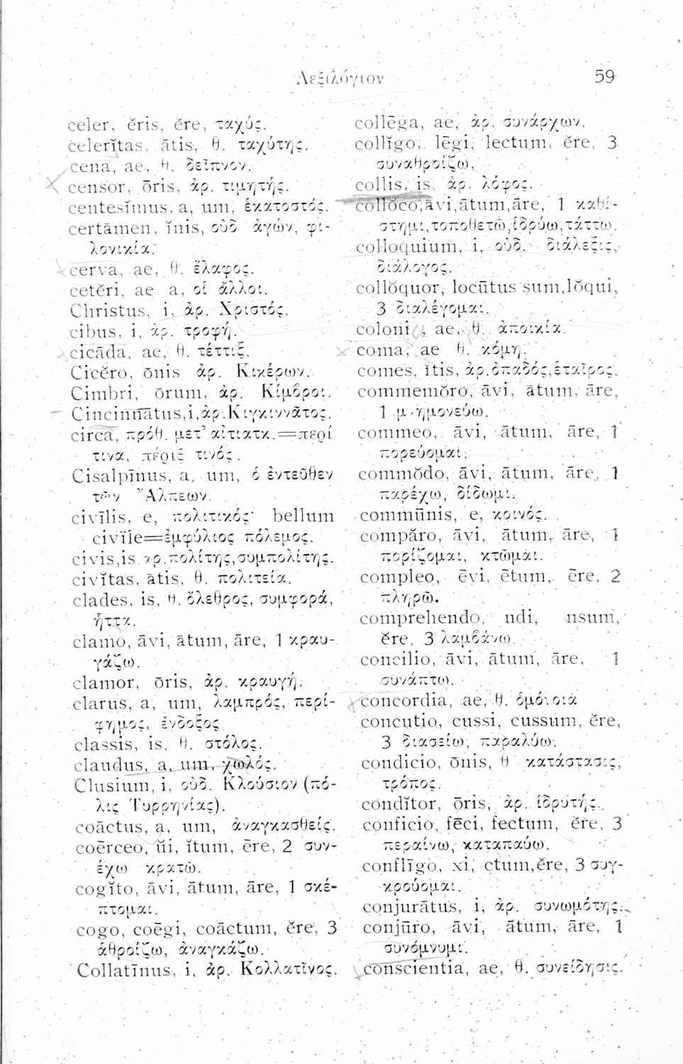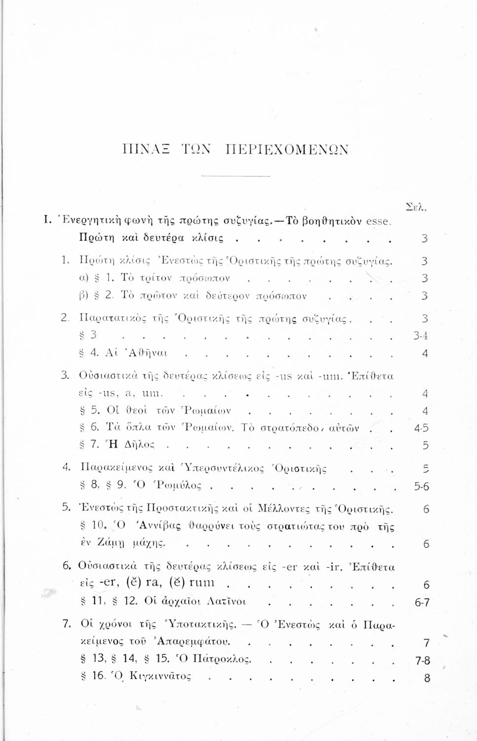 Σχολικό εγχειρίδιο Λατινικών για τη Γ΄ Γυμνασίου που περιέχει 54 κείμενα/περικοπές στα λατινικά, ερμηνευτικά υπομνήματα, λεξιλόγιο και κατάλογο με τα συντακτικά φαινόμενα (αφαιρετική, προθέσεις, σύνδεσμοι) που