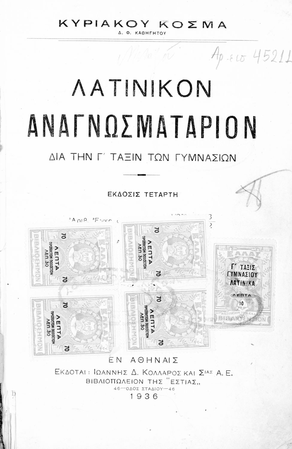 Τίτλος: Λατινικόν αναγνωσματάριον δια την Γ΄ τάξιν των Γυμνασίων