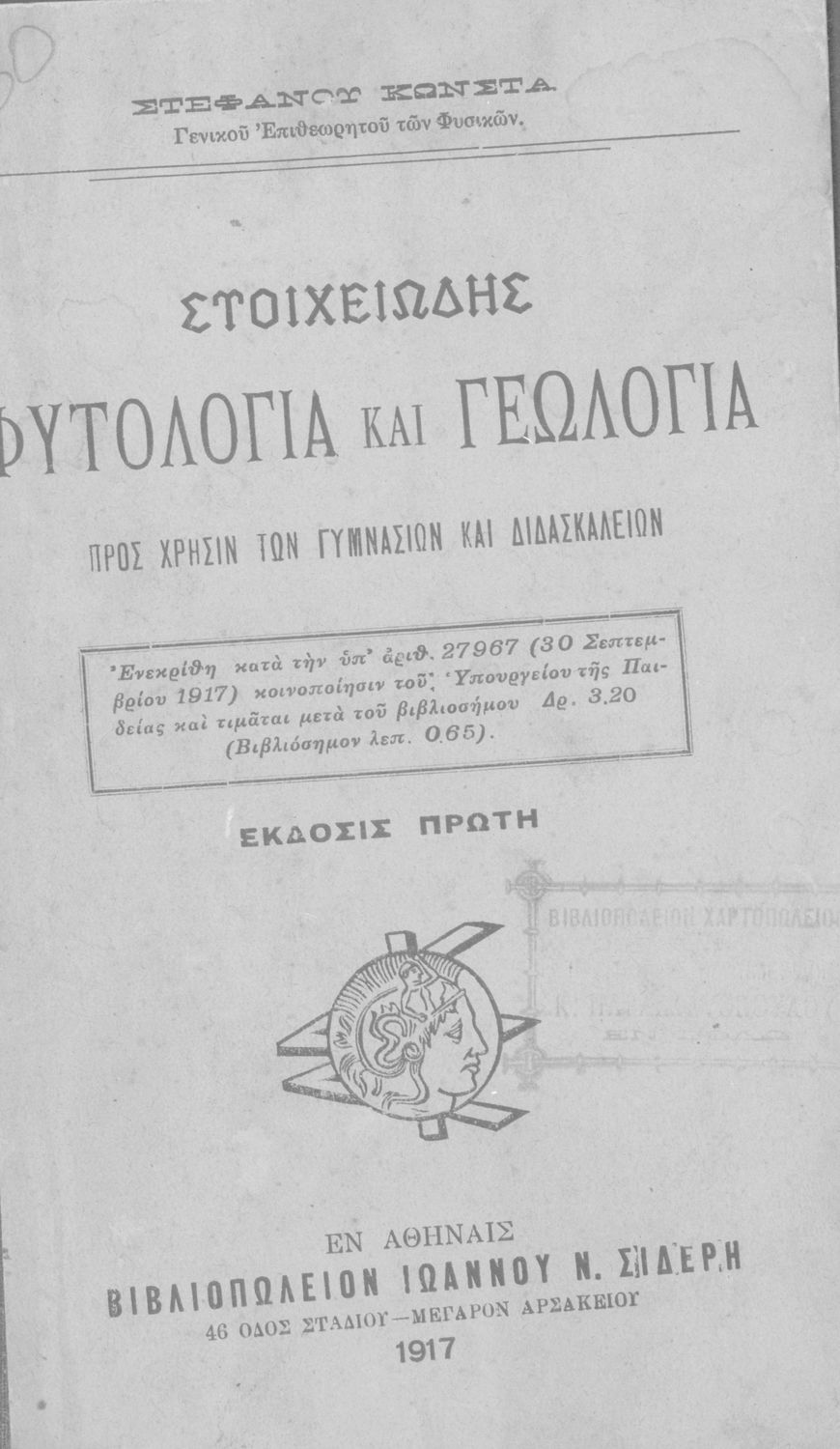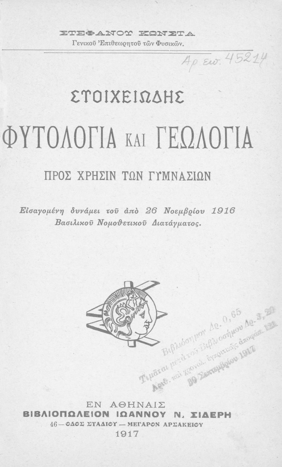 Κωδικός αναγνώρισης: 01-45214 Τίτλος: Στοιχειώδης Φυτολογία και Γεωλογία προς χρήσιν των Γυμνασίων Συγγραφέας: Στέφανος Κώνστας Μέγεθος και υπόστρωμα: Σχολικό εγχειρίδιο, σκληρό εξώφυλλο, 192 σελίδες. Σχέδια (ασπρόμαυρο). |
