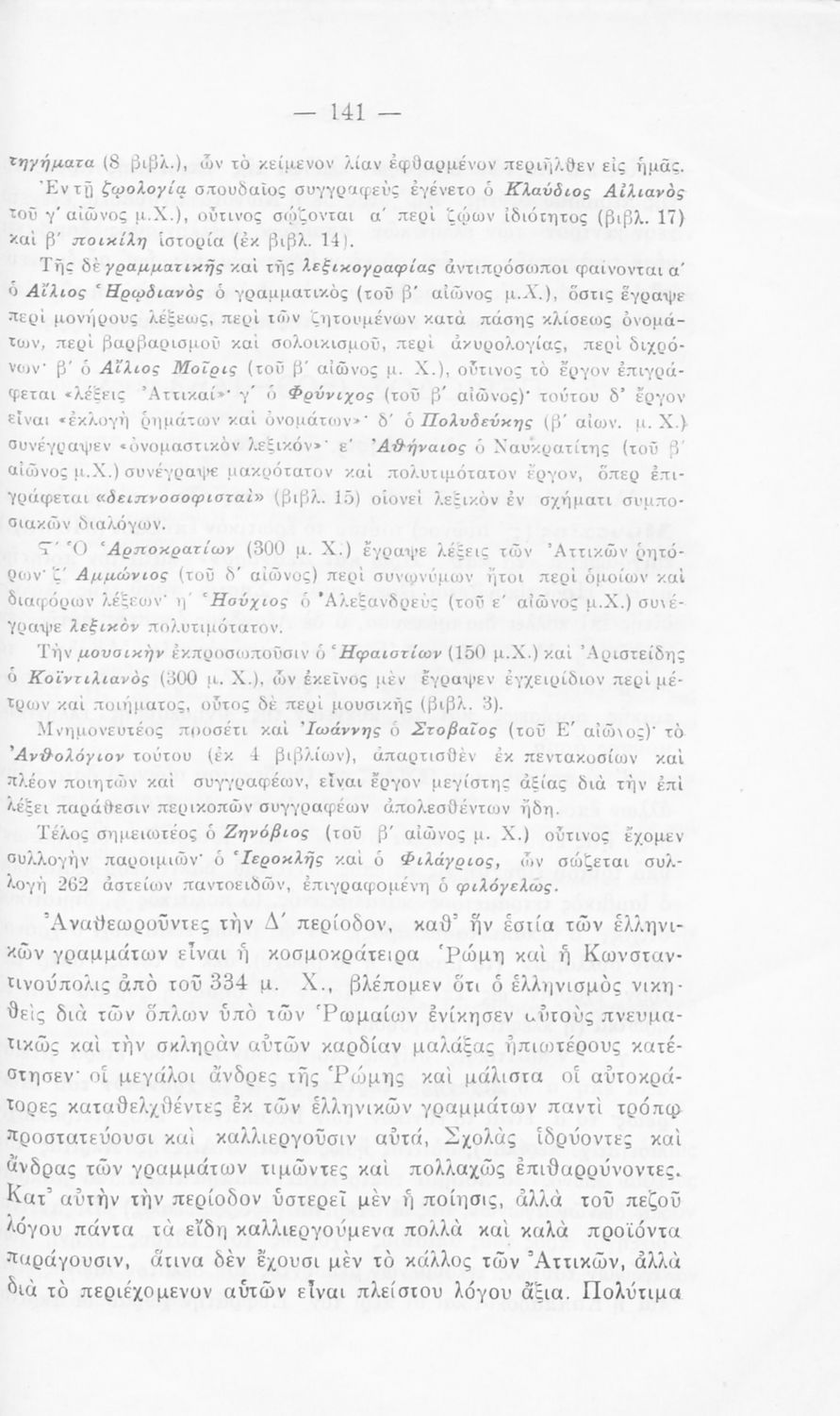Σχολικό εγχειρίδιο Αρχαίων και Νέων Ελληνικών για τις Γ΄, Δ΄, Ε΄, ΣΤ΄ Γυμνασίου που παρουσιάζει τα είδη λογοτεχνίας και την εξέλιξη της ελληνικής γλώσσας από την εποχή του Όμηρου μέχρι την Ελληνική Επανάσταση. Περιέχει και αναφορά στα δημοτικά τραγούδια και σύντομα βιογραφικά σημειώματα επιφανών λογοτεχνών. Ο συγγραφέας ήταν Καθηγητής Ελληνικών Γραμμάτων στο Εθνικό Πανεπιστήμιο και Γυμνασιάρχης στο Αρσάκειο.