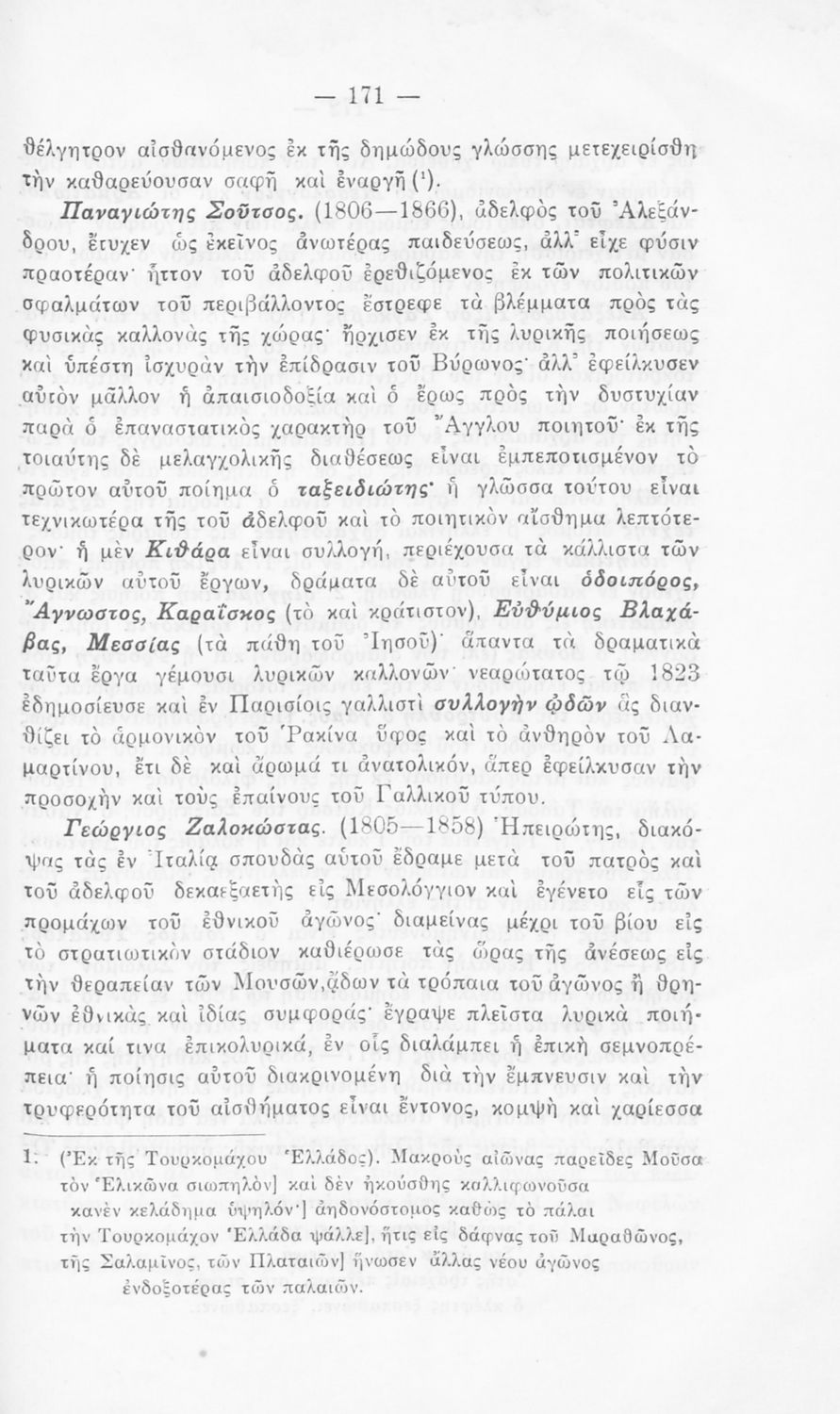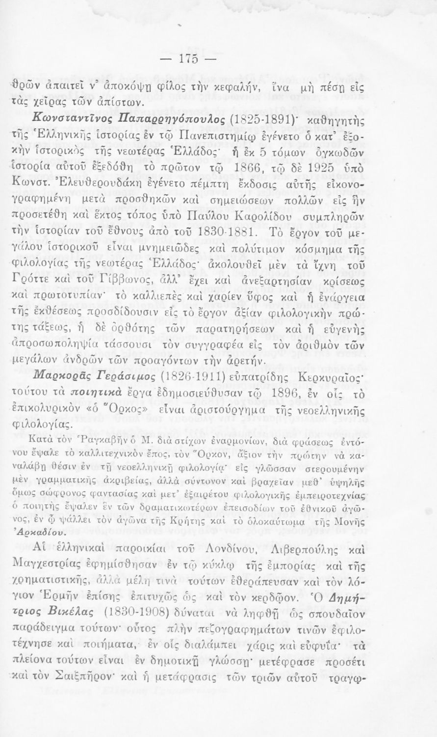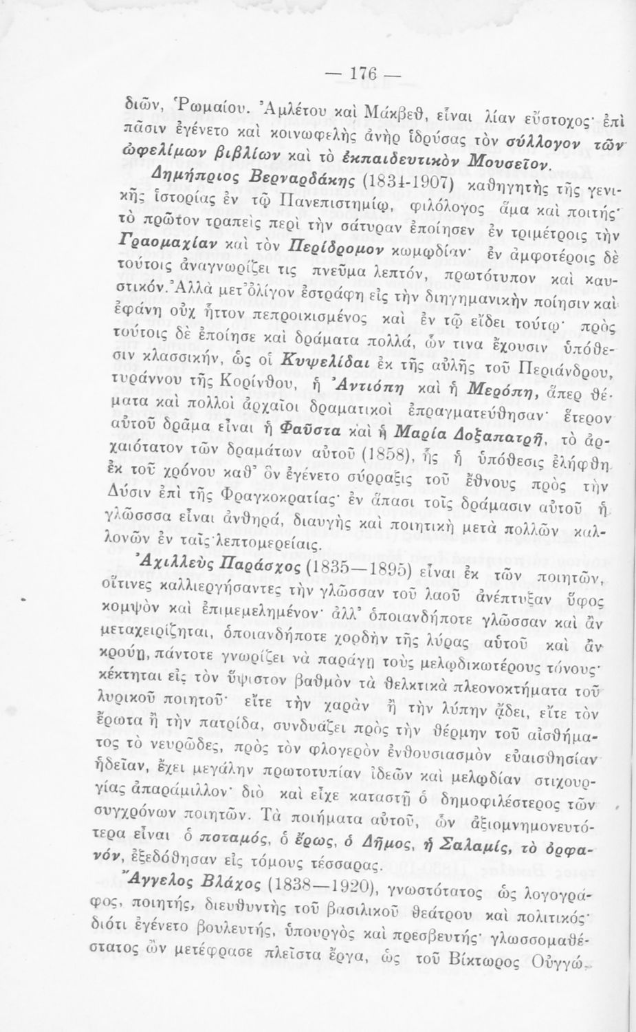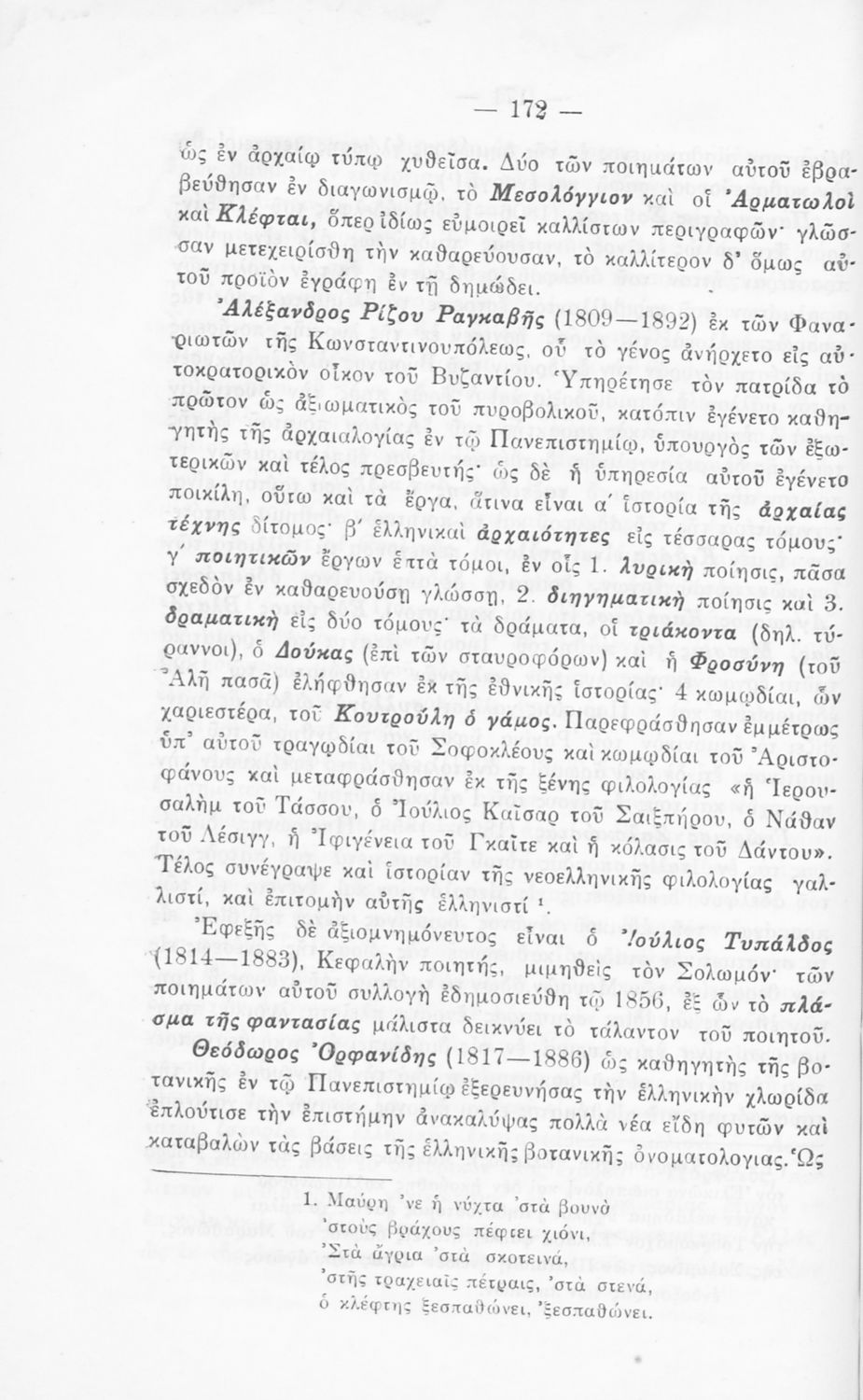 Σχολικό εγχειρίδιο Αρχαίων και Νέων Ελληνικών για τις Γ΄, Δ΄, Ε΄, ΣΤ΄ Γυμνασίου που παρουσιάζει τα είδη λογοτεχνίας και την εξέλιξη της ελληνικής γλώσσας από την εποχή του Όμηρου μέχρι την Ελληνική Επανάσταση. Περιέχει και αναφορά στα δημοτικά τραγούδια και σύντομα βιογραφικά σημειώματα επιφανών λογοτεχνών. Ο συγγραφέας ήταν Καθηγητής Ελληνικών Γραμμάτων στο Εθνικό Πανεπιστήμιο και Γυμνασιάρχης στο Αρσάκειο.