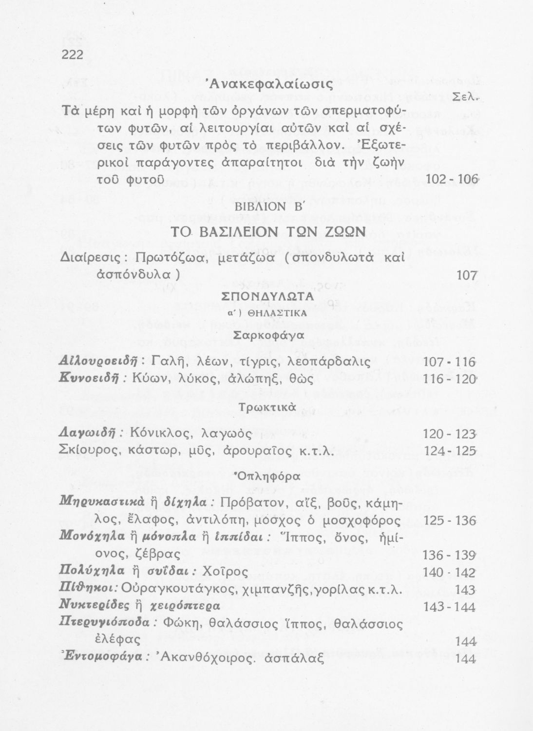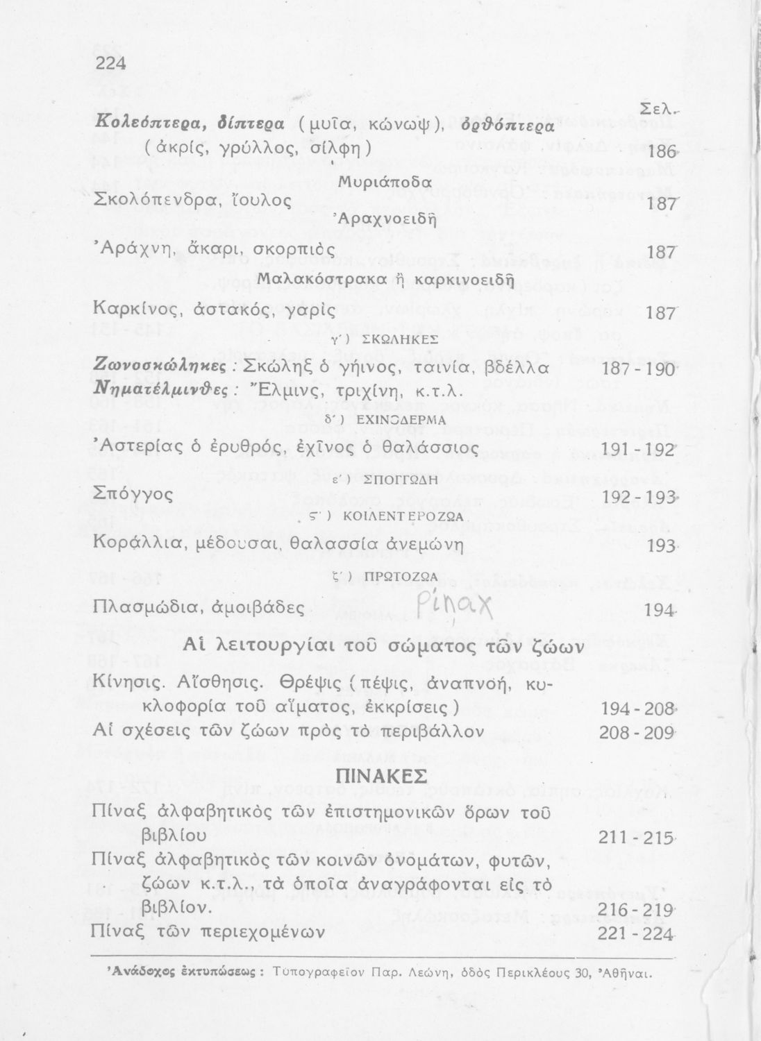 Σχολικό εγχειρίδιο Ζωολογίας/Φυτολογίας για τα Γυμνάσια και Αστικά Σχολεία που παρουσιάζει διάφορα ζώα και φυτά ανάλογα με τη συνομοταξία στην οποία ανήκουν.