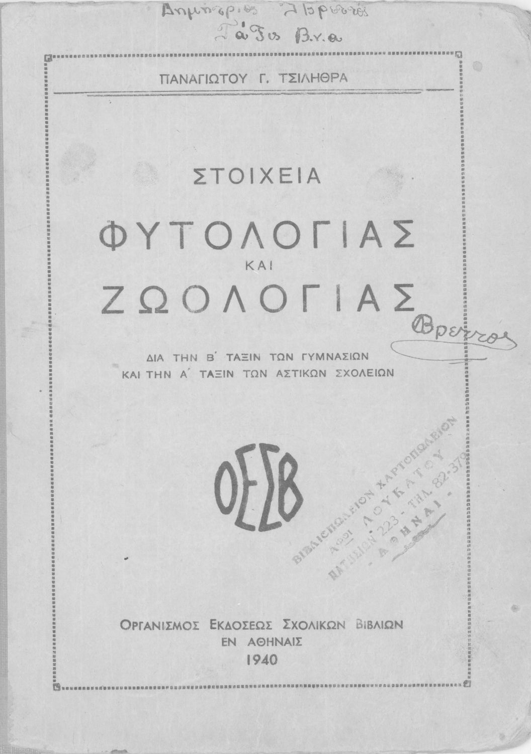 Σχολικό εγχειρίδιο Φυτολογίας για τη Β΄ Γυμνασίου που περιέχει πληροφορίες για τα φυτά της Ελλάδας καθώς και στοιχεία Ζωολογίας για ζώα διαφόρων τόπων.