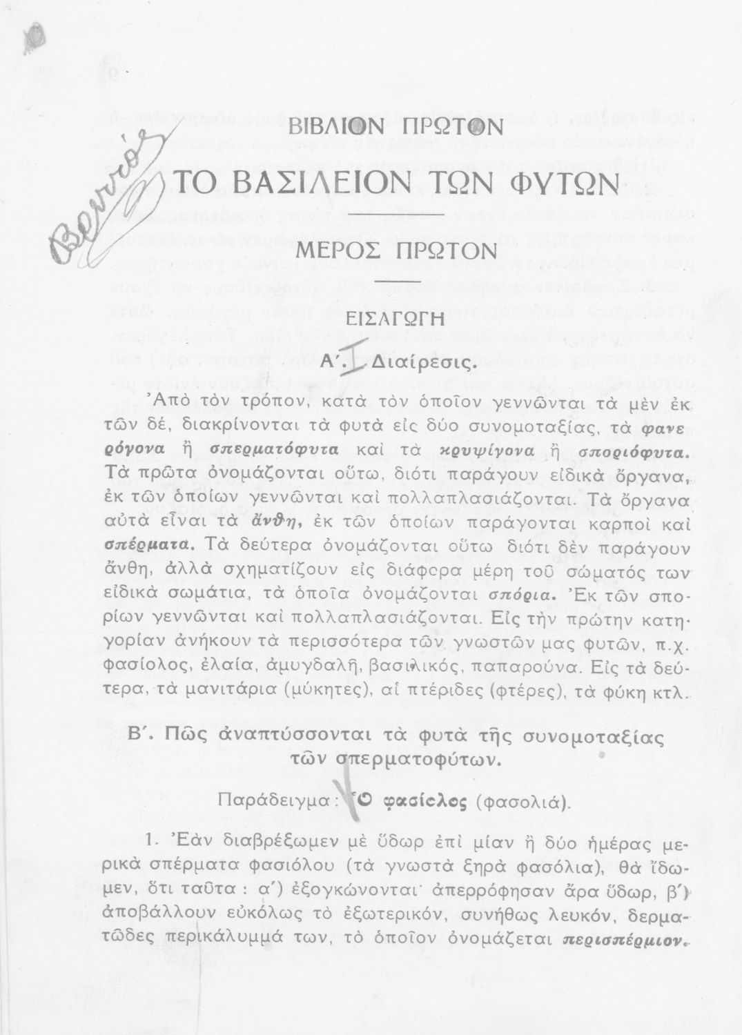 Σχολικό εγχειρίδιο Φυτολογίας για τη Γ΄ Γυμνασίου και τη Β΄ τάξη των Αστικών σχολείων που περιέχει πληροφορίες για τα φυτά της Ελλάδας καθώς και στοιχεία Ζωολογίας για ζώα διαφόρων τόπων. Σχέδια και ζωγραφιές ...