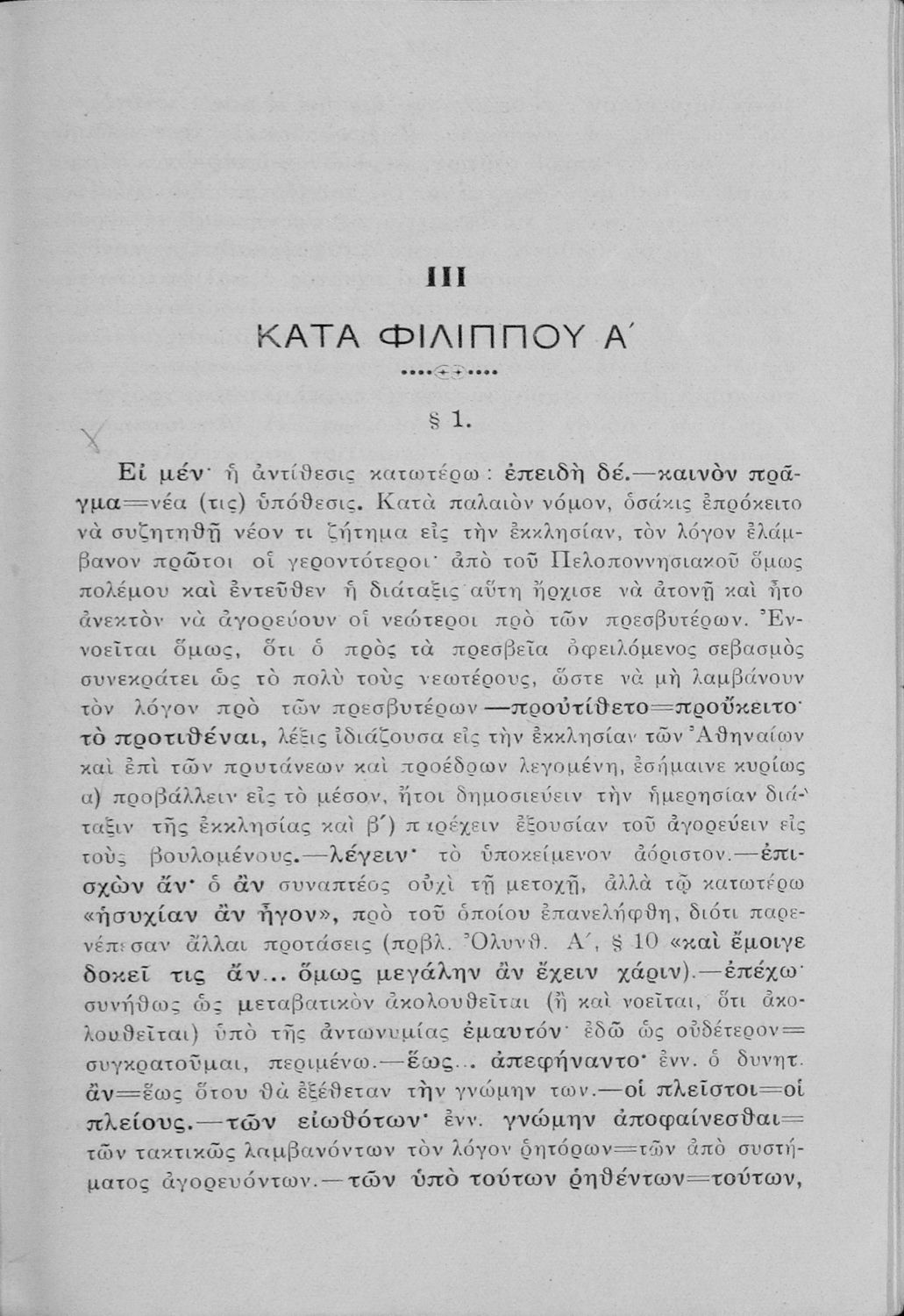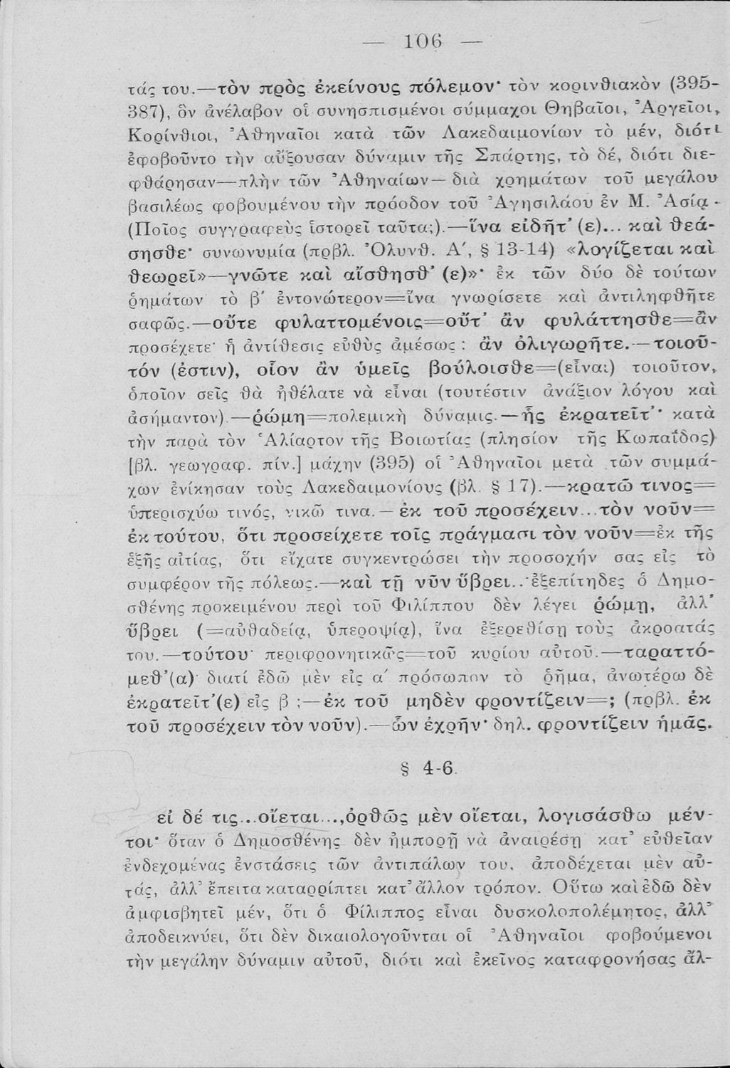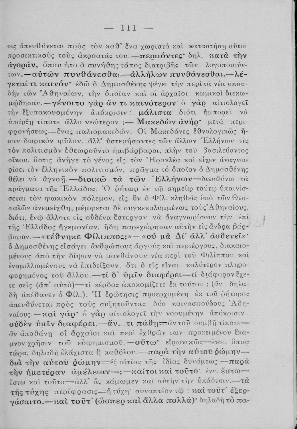 Μαθητικό βοήθημα Αρχαίων Ελληνικών της τρίτης τάξης των τετρατάξιων Γυμνασίων. Το βιβλίο περιέχει τα έργα του Δημοσθένη, Περί της ειρήνης και Α΄ Φιλιππικός από μετάφραση.