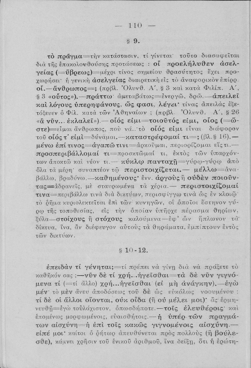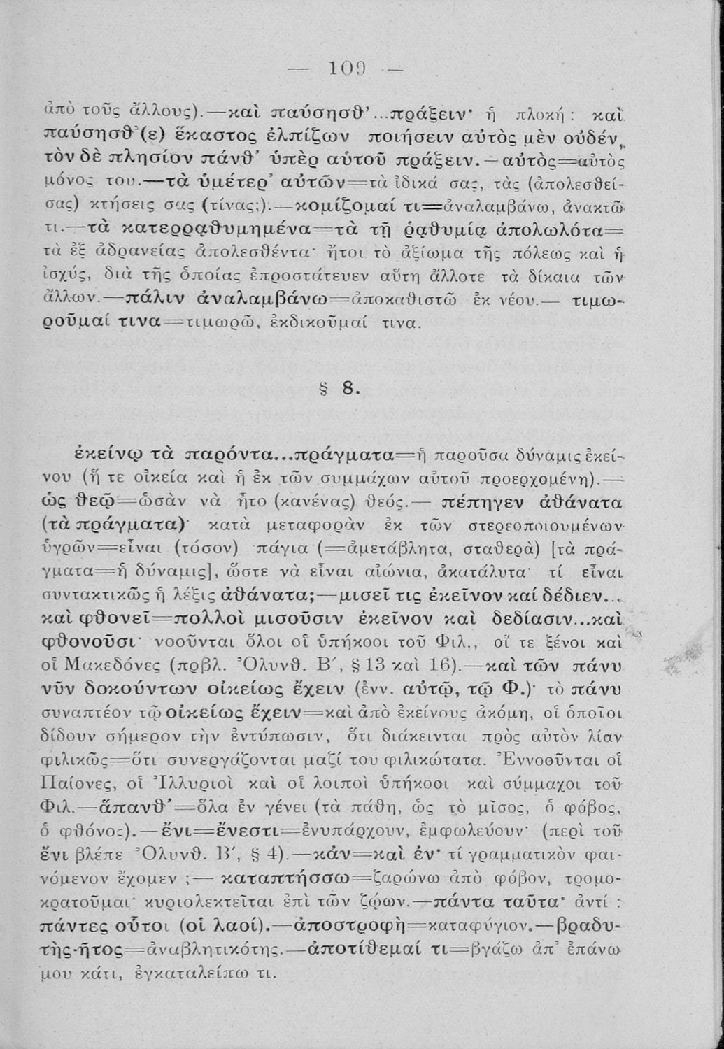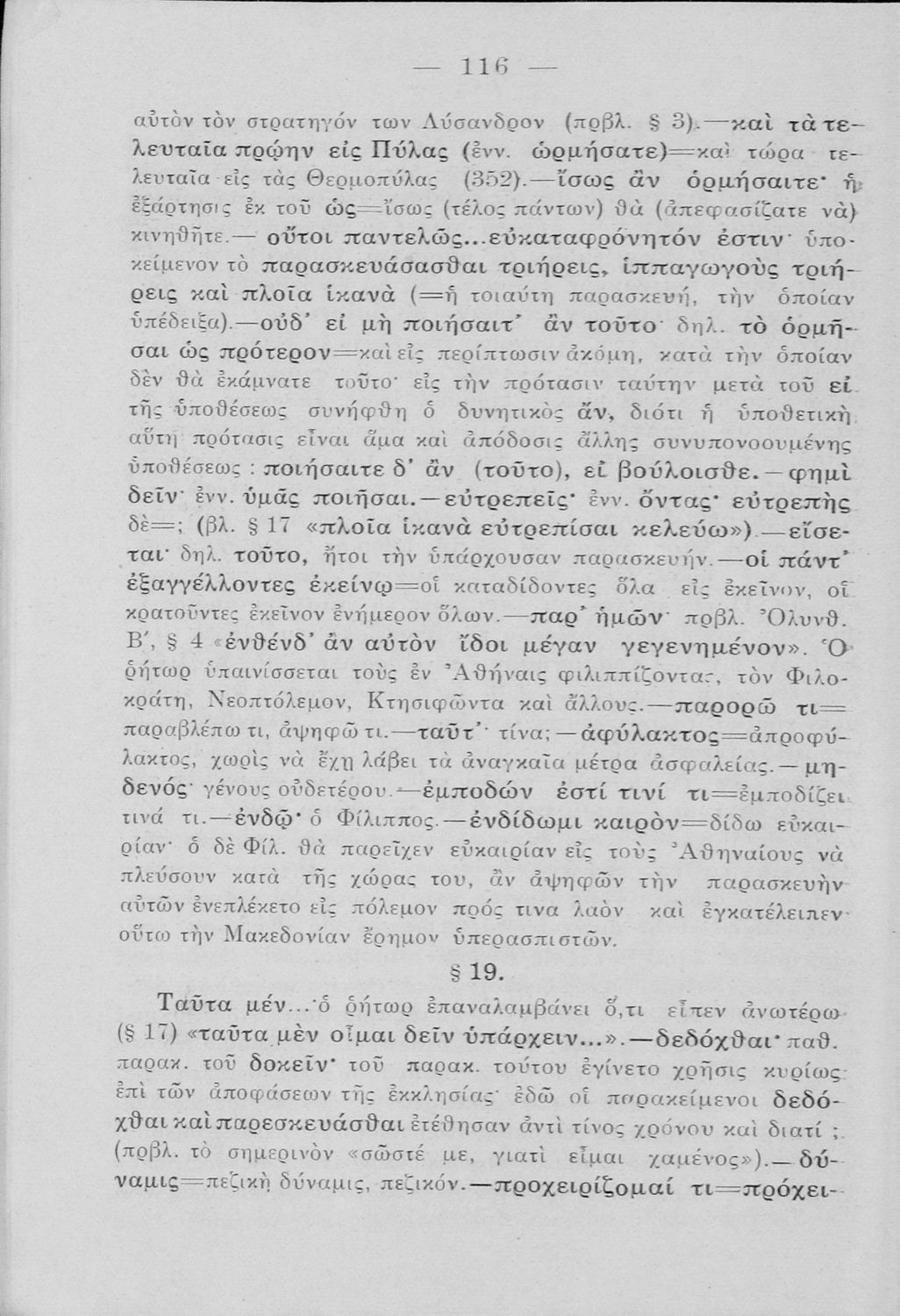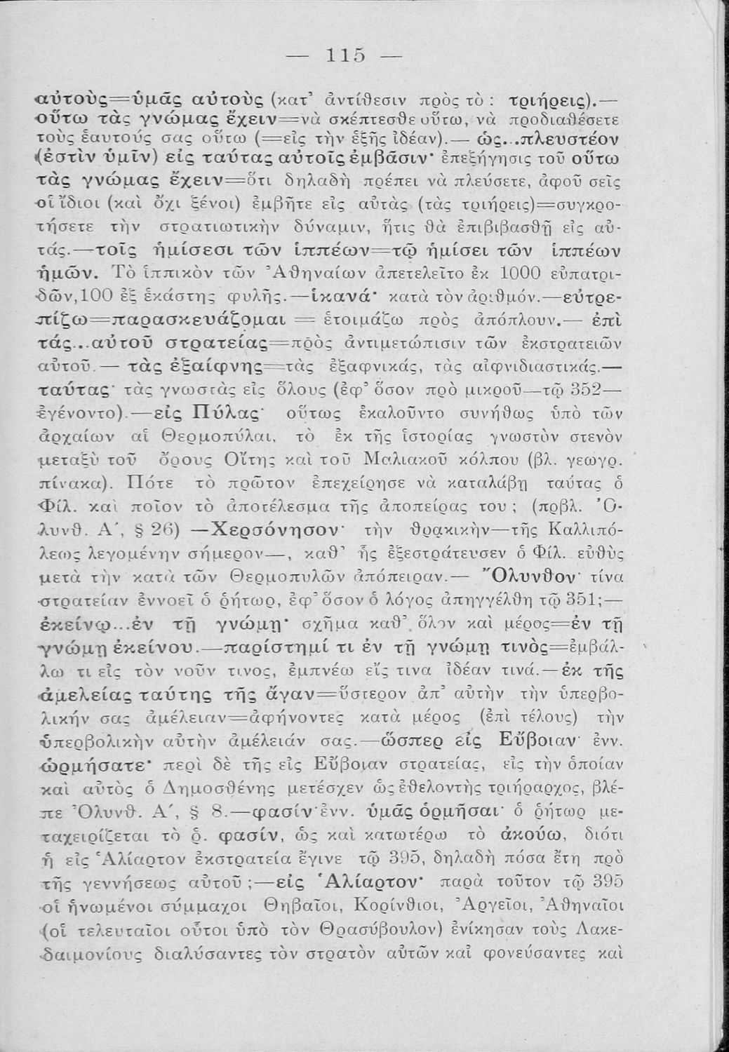 Μαθητικό βοήθημα Αρχαίων Ελληνικών της τρίτης τάξης των τετρατάξιων Γυμνασίων. Το βιβλίο περιέχει τα έργα του Δημοσθένη, Περί της ειρήνης και Α΄ Φιλιππικός από μετάφραση.