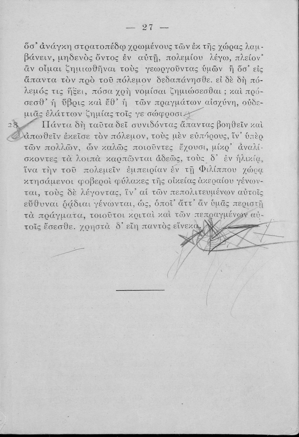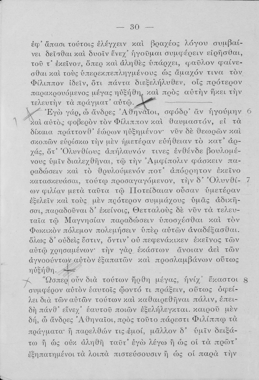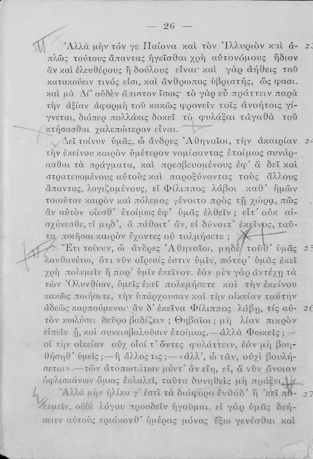 Μαθητικό βοήθημα Αρχαίων Ελληνικών της τρίτης τάξης των τετρατάξιων Γυμνασίων. Το βιβλίο περιέχει τα έργα του Δημοσθένη, Περί της ειρήνης και Α΄ Φιλιππικός από μετάφραση.