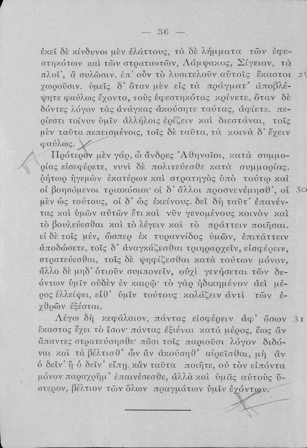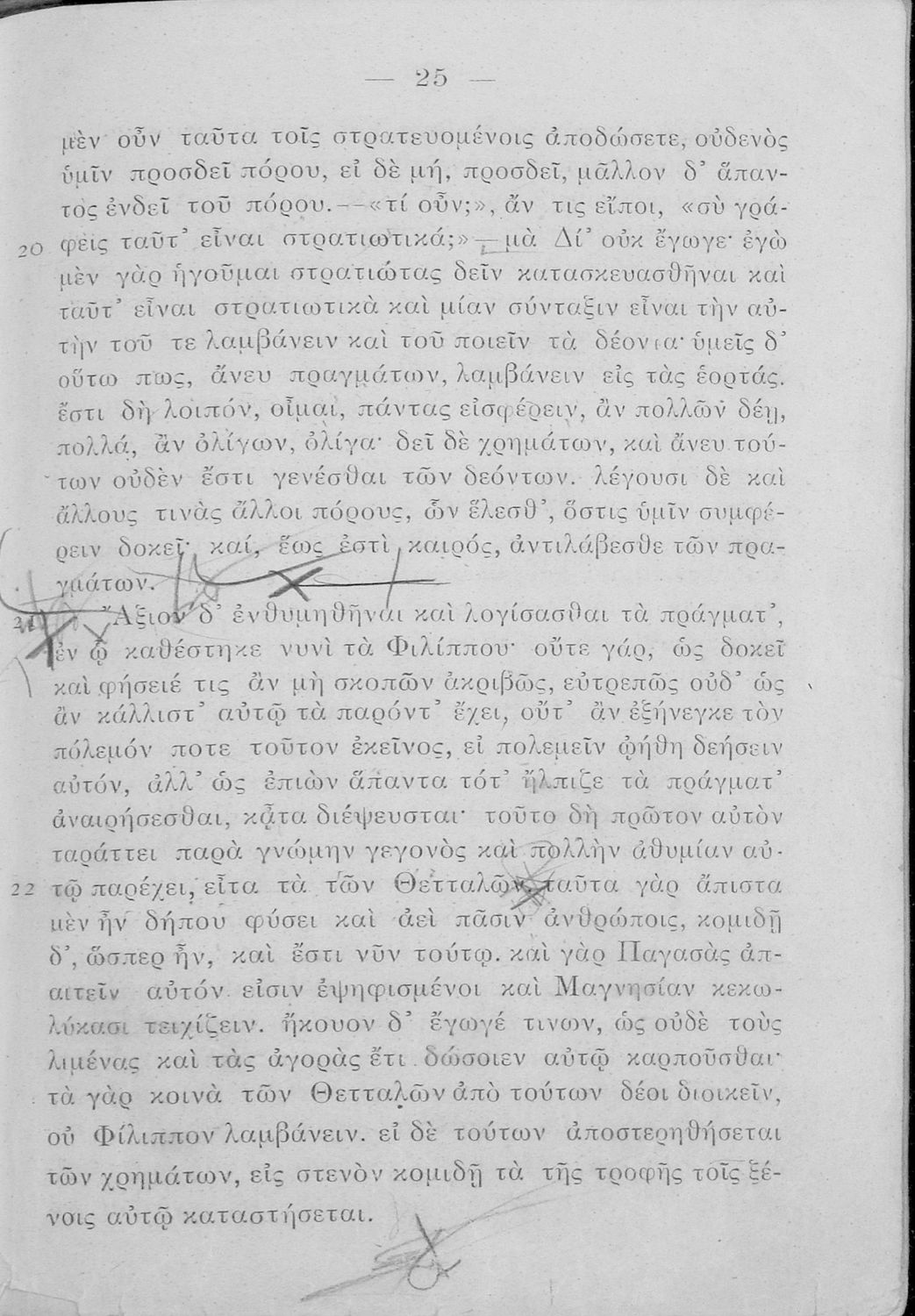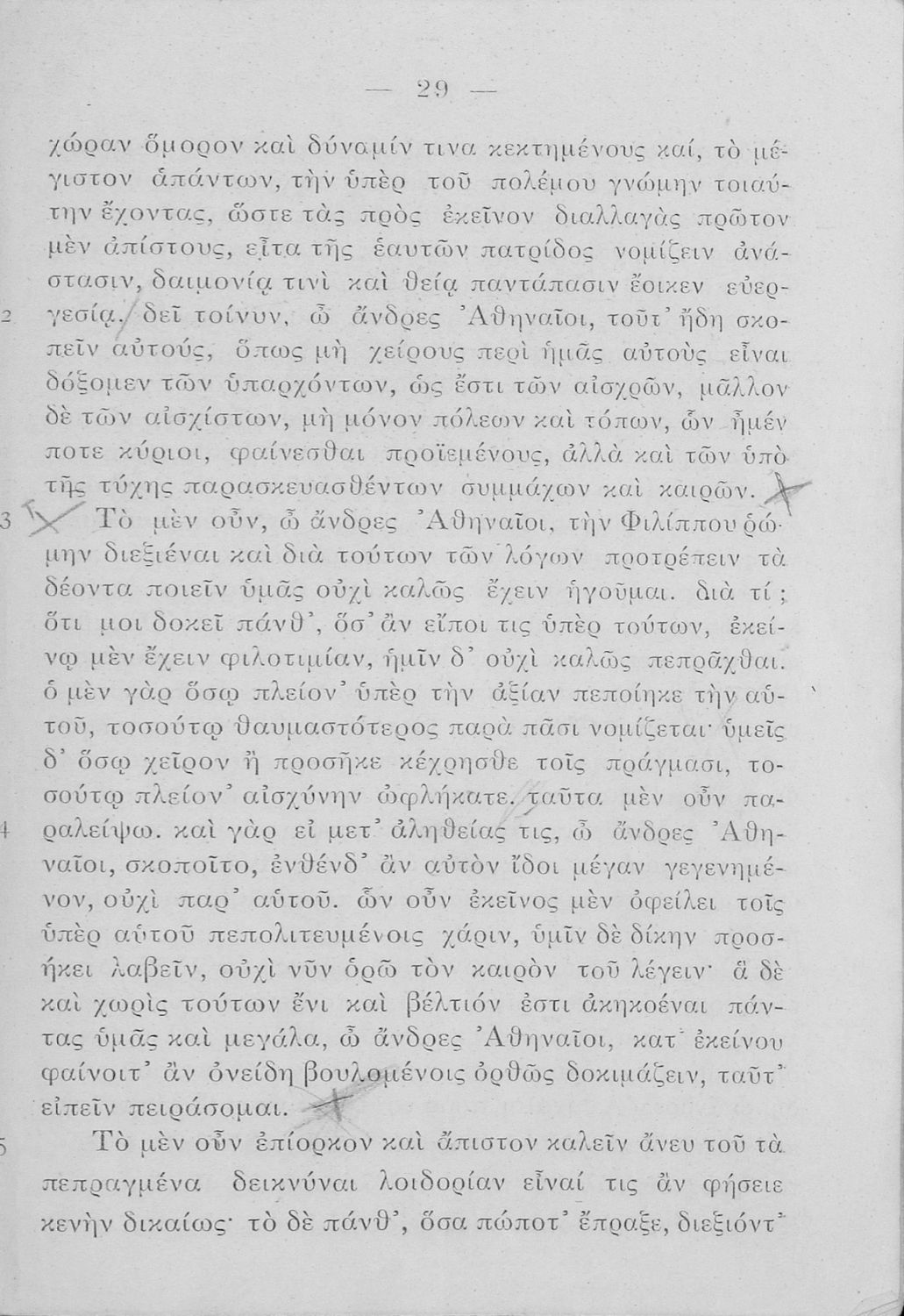 Μαθητικό βοήθημα Αρχαίων Ελληνικών της τρίτης τάξης των τετρατάξιων Γυμνασίων. Το βιβλίο περιέχει τα έργα του Δημοσθένη, Περί της ειρήνης και Α΄ Φιλιππικός από μετάφραση.