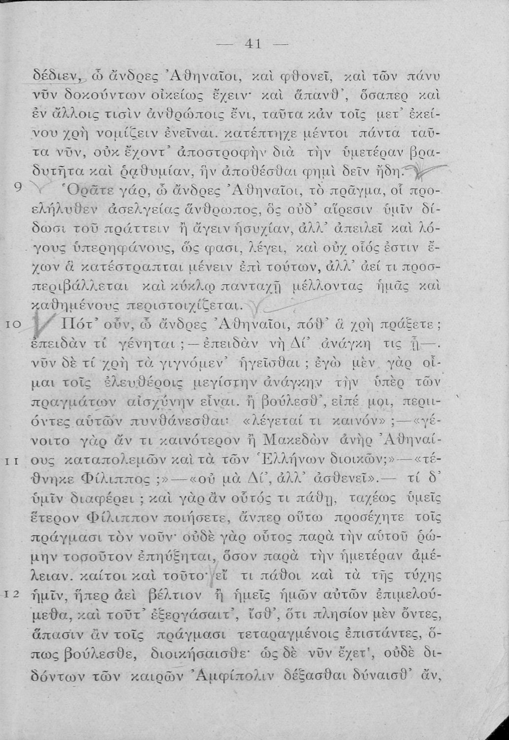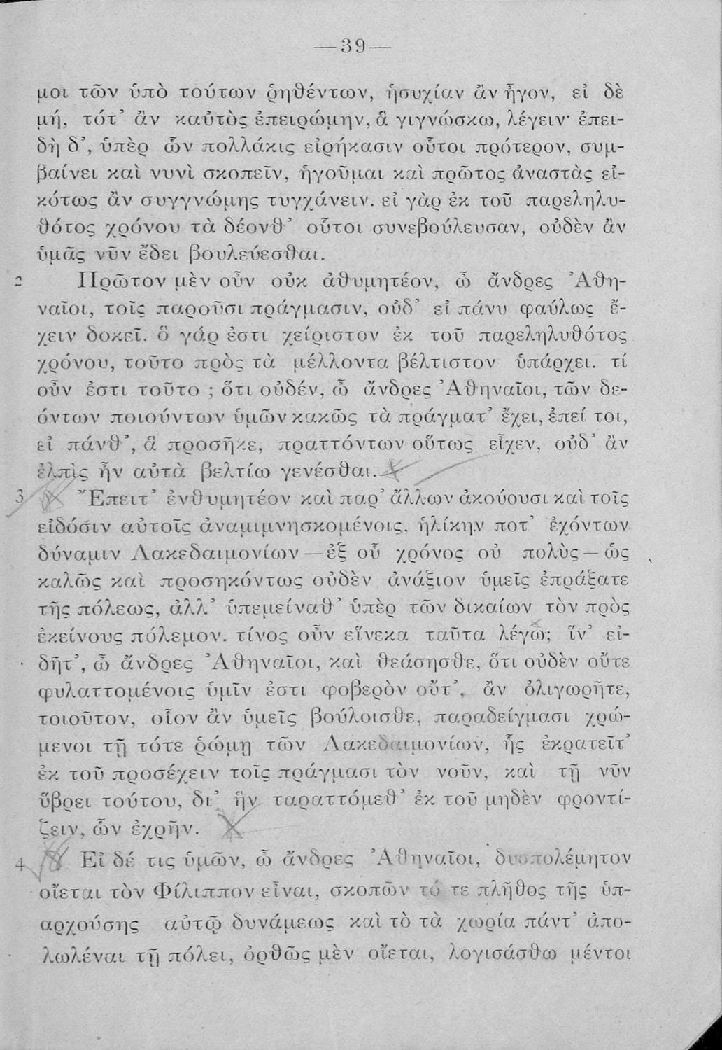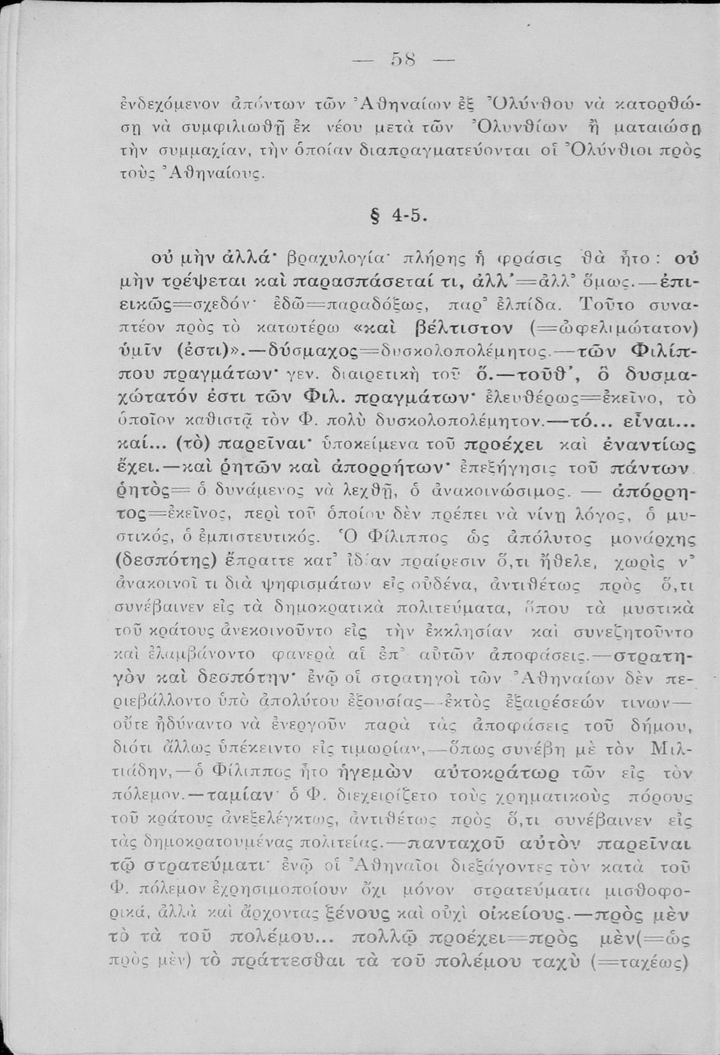 Σχολικό εγχειρίδιο Αρχαίων Ελληνικών Δ΄ Γυμνασίου που περιλαμβάνει εισαγωγή στη ζωή και στο έργο του Δημοσθένη, τον Α΄ κατά Φιλίππου, και τους Α΄ και Β΄ Ολυνθιακούς και ερμηνευτικά και ετυμολογικά σχόλια.