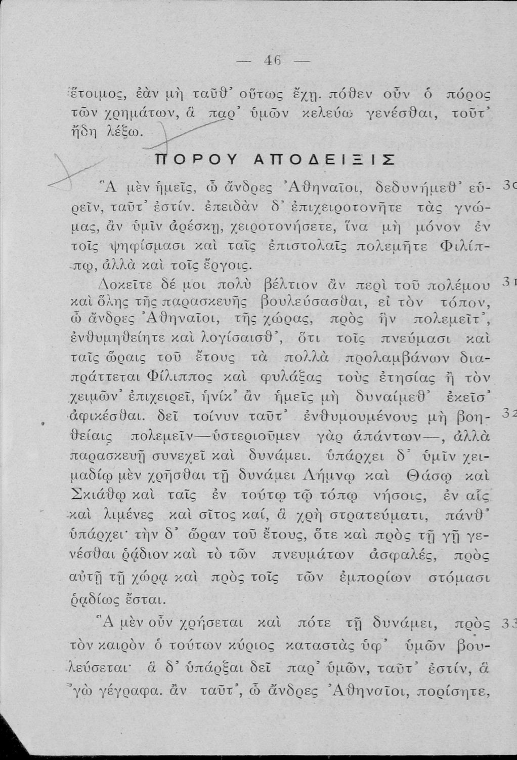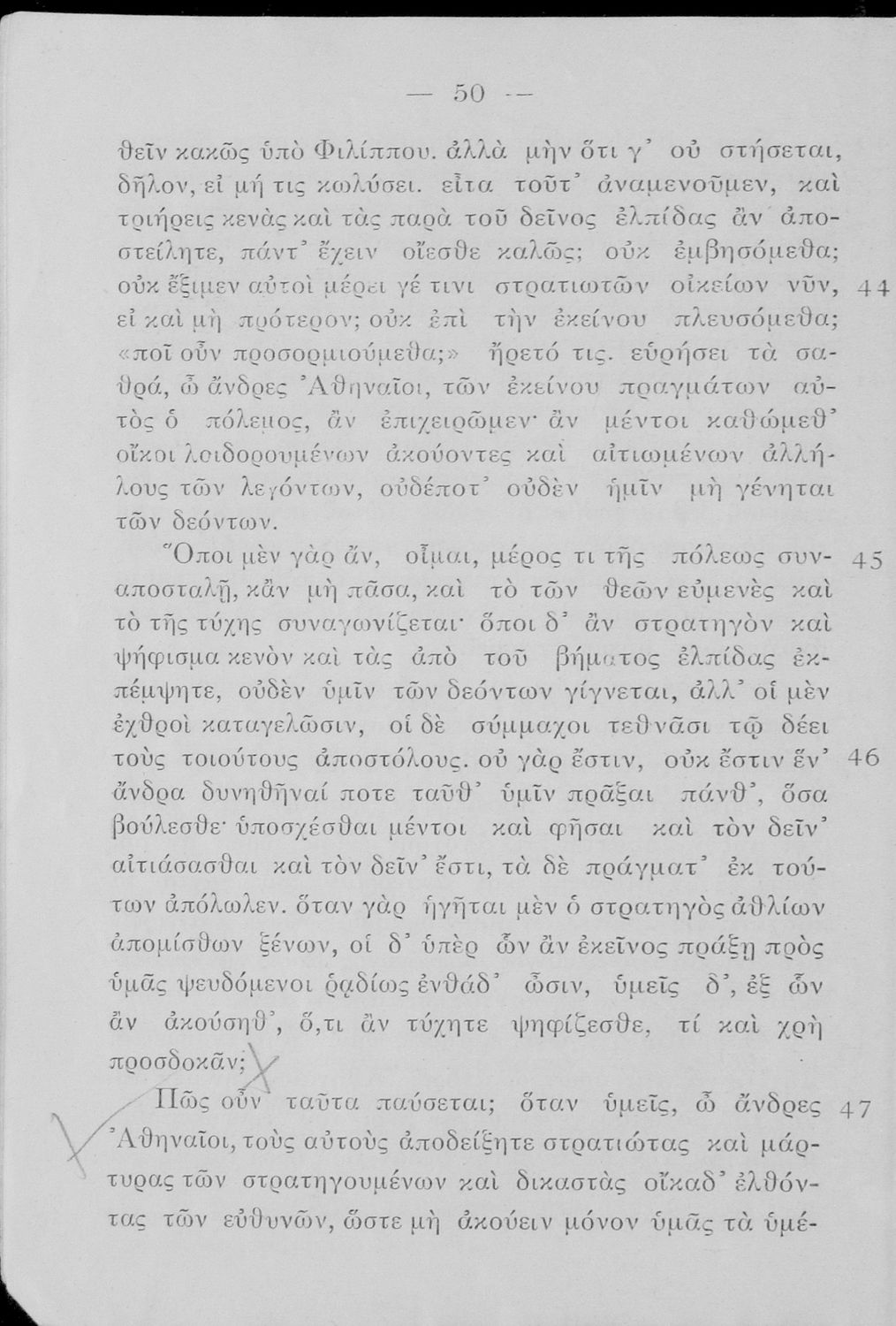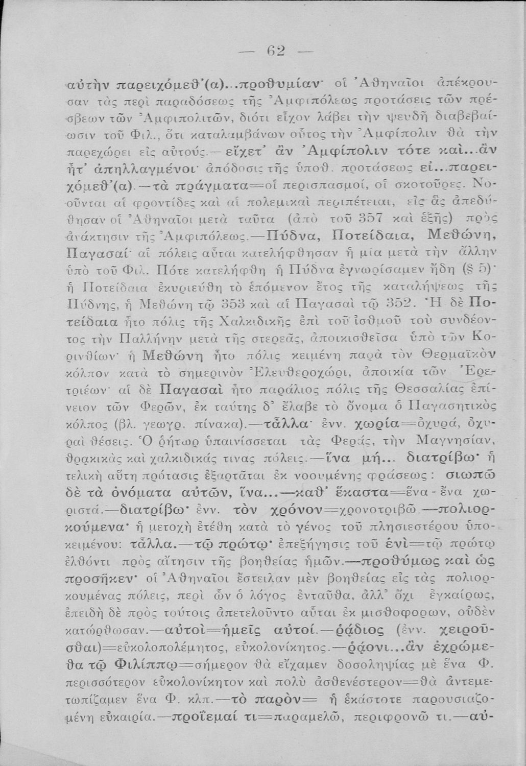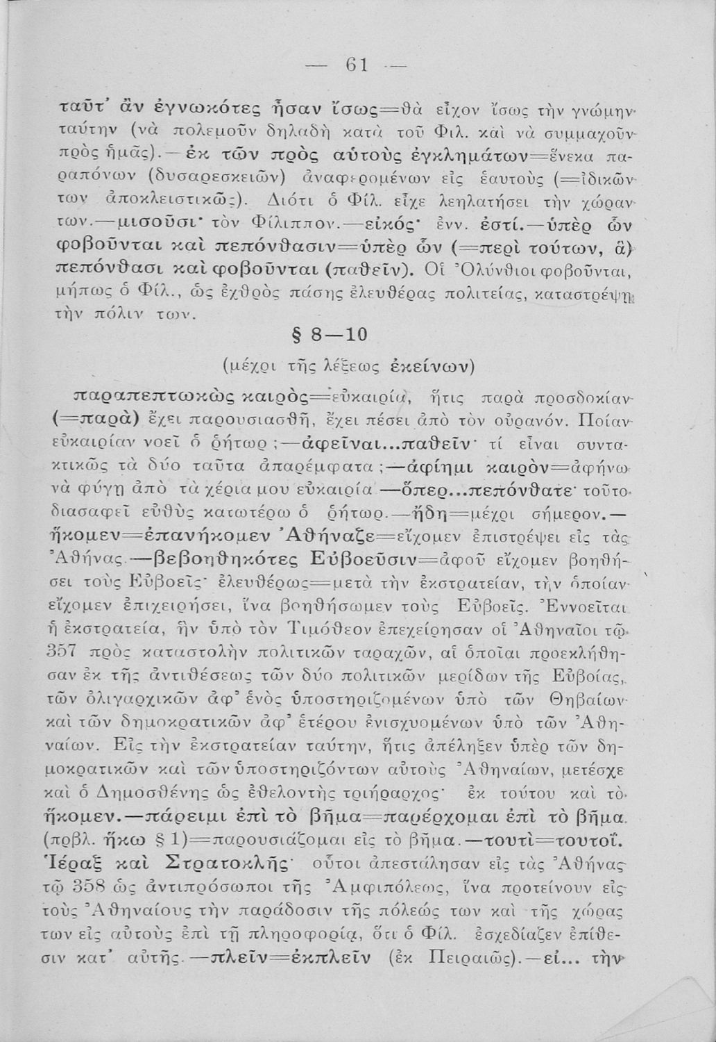 Μαθητικό βοήθημα Αρχαίων Ελληνικών της τρίτης τάξης των τετρατάξιων Γυμνασίων. Το βιβλίο περιέχει τα έργα του Δημοσθένη, Περί της ειρήνης και Α΄ Φιλιππικός από μετάφραση.
