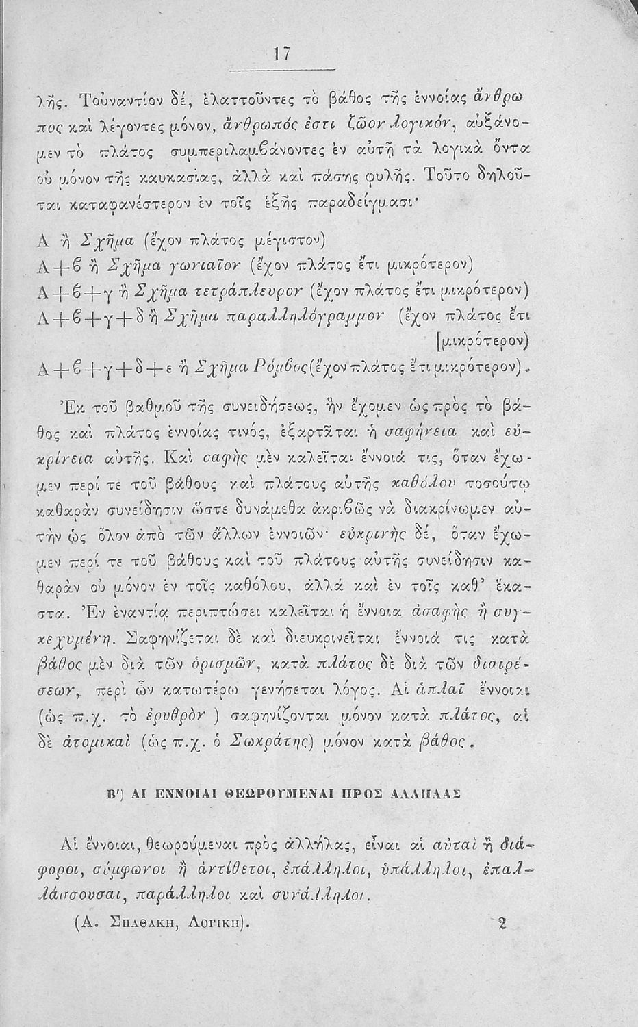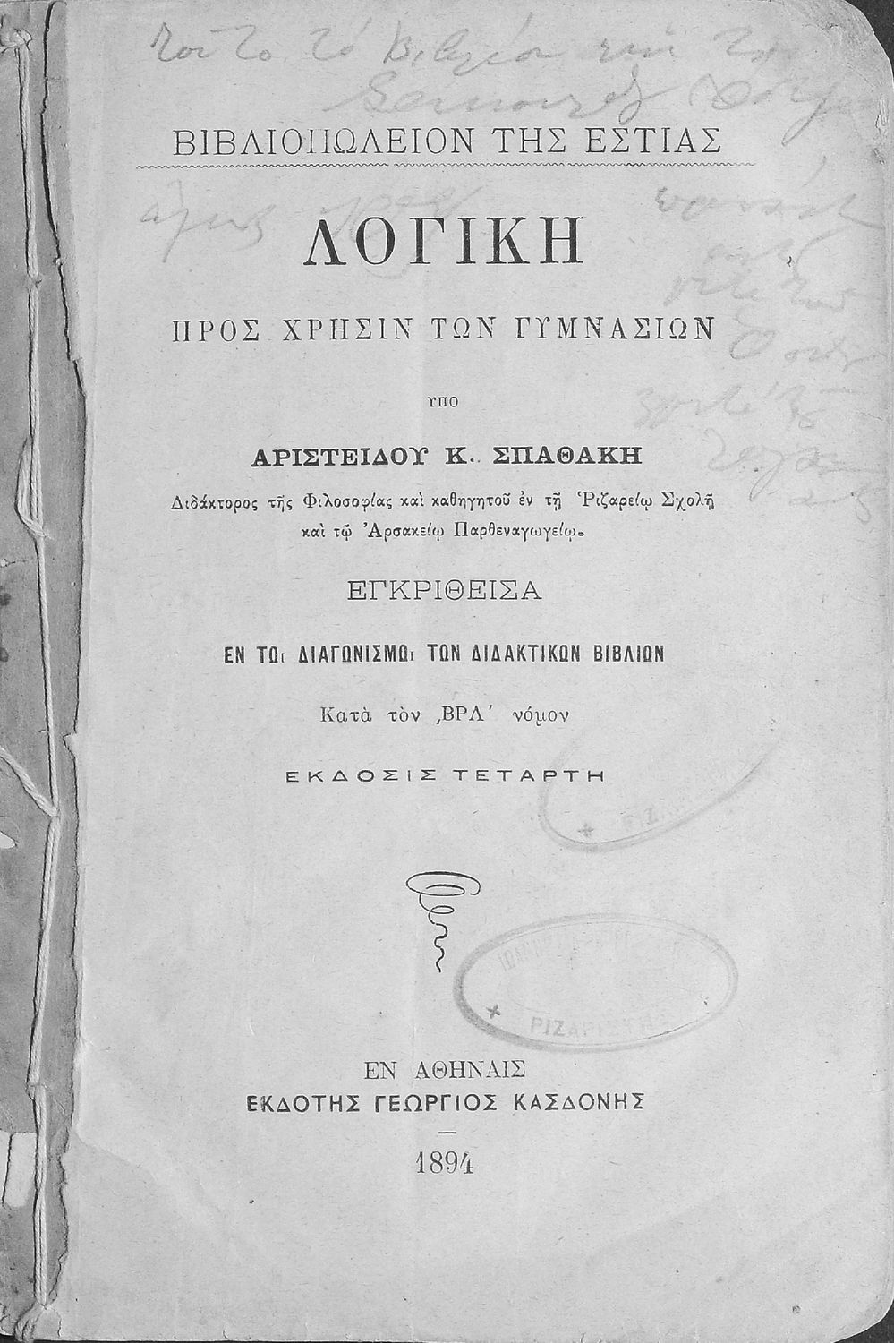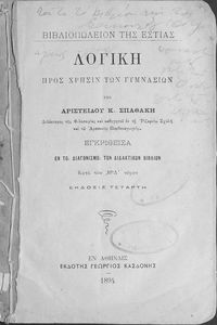 Σχολικό εγχειρίδιο Λογικής Γυμνασίου που είναι χωρισμένο σε στοιχειολογία και μεθοδολογία. Ο συγγραφέας ήταν Δρ Φιλοσοφίας και καθηγητής στη Ριζάρειο Σχολή και το Αρσάκειο Παρθεναγωγείο.