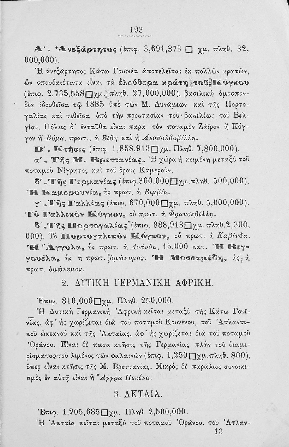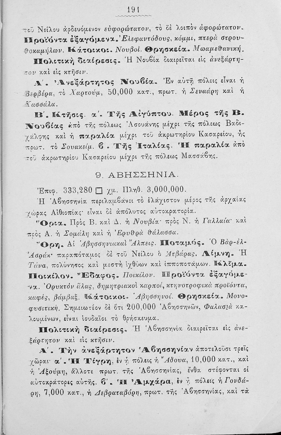 Σχολικό εγχειρίδιο Γεωγραφίας για τους μαθητές των Ελληνικών Σχολείων και Παρθεναγωγείων που περιλαμβάνει μια γενική επισκόπηση της πολιτικής, οικονομικής και φυσικής γεωγραφίας της Ελλάδας και ενδεικτικών ...