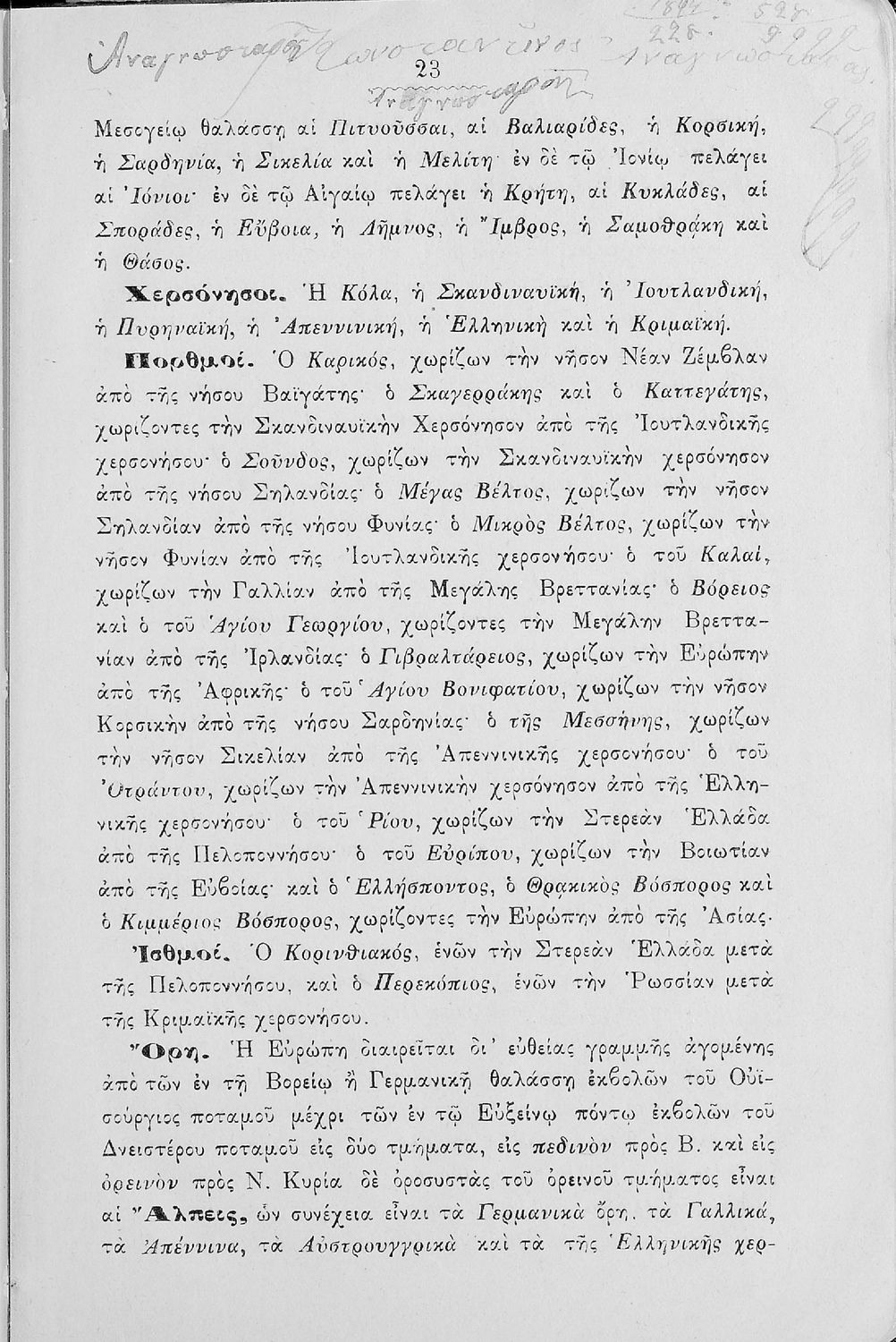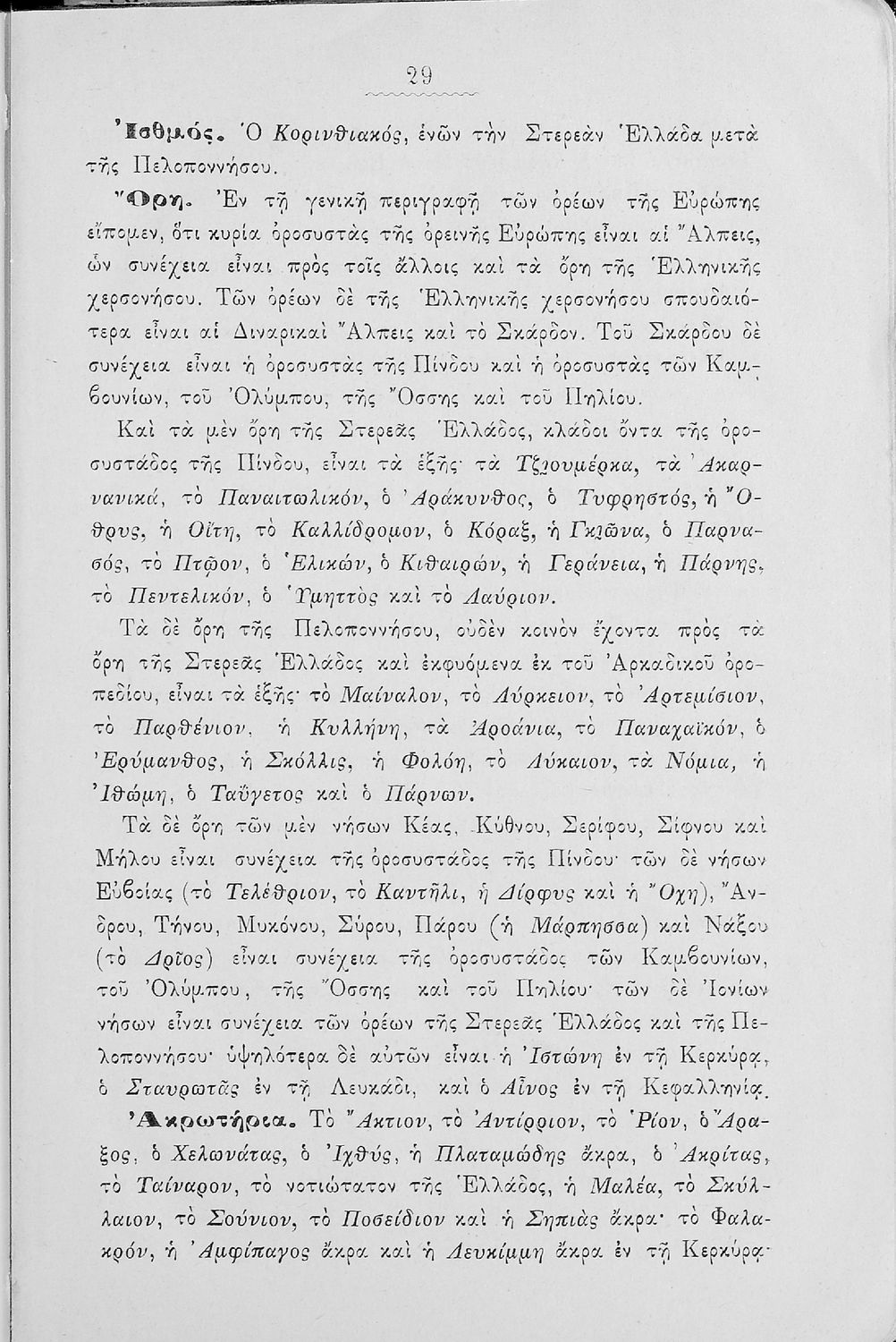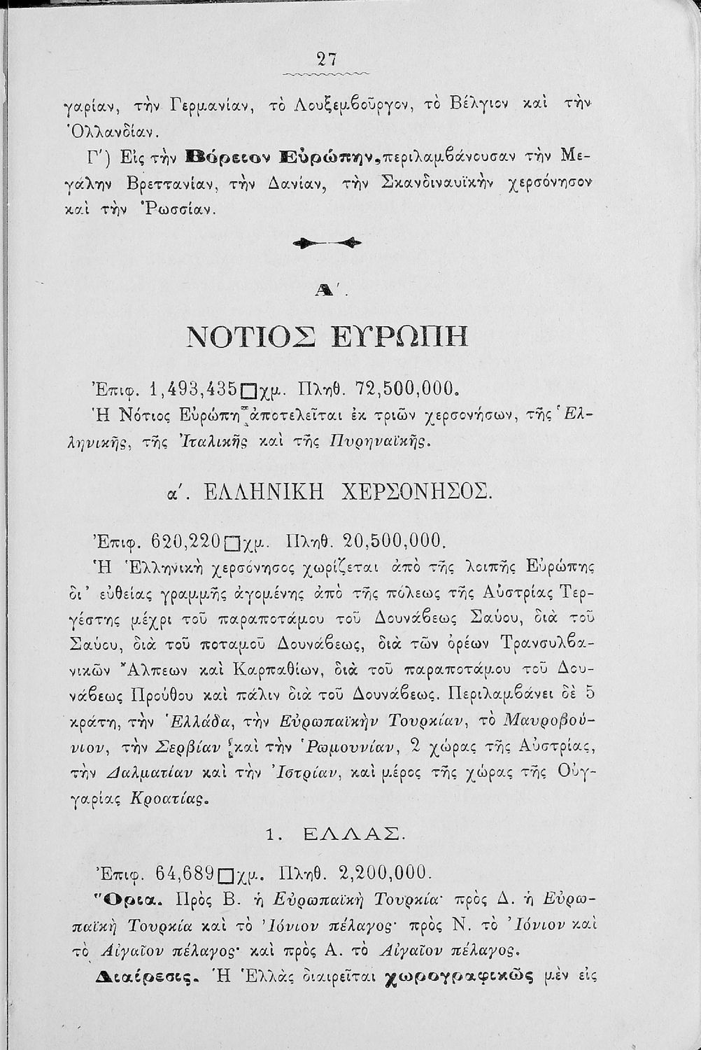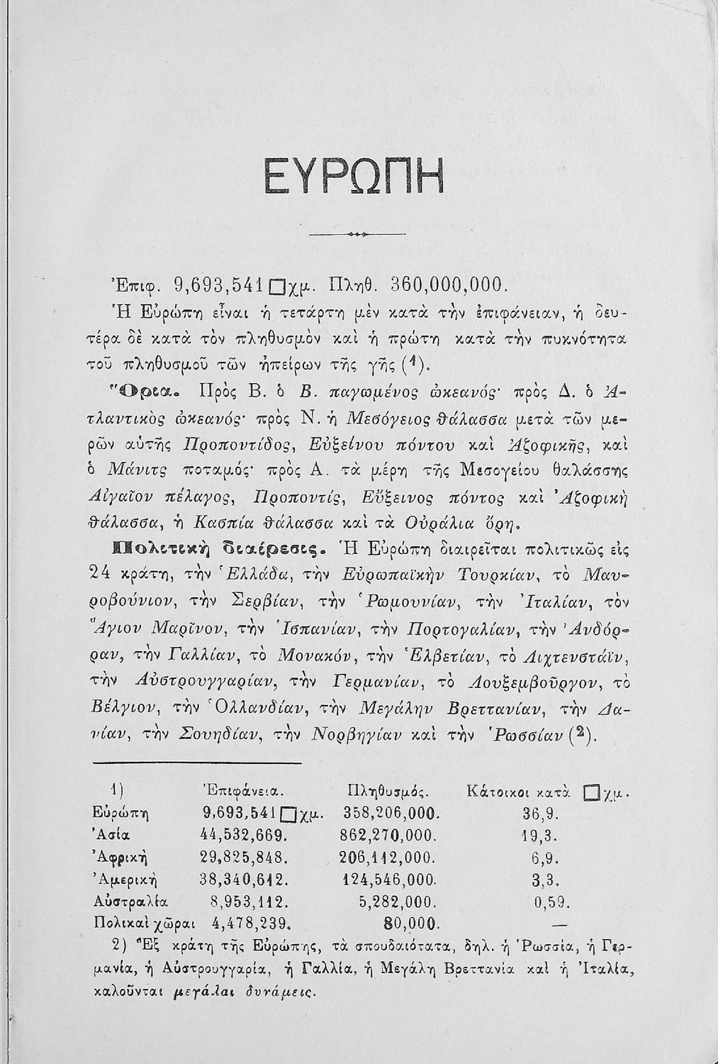 Σχολικό εγχειρίδιο Γεωγραφίας για τα Παρθεναγωγεία και τα Ελληνικά Σχολεία που περιλαμβάνει εισαγωγή στη φυσική, μαθηματική και πολιτική γεωγραφία και εξετάζει την Ελλάδα και ενδεικτικές χώρες και περιοχές από τις πέντε ηπείρους.