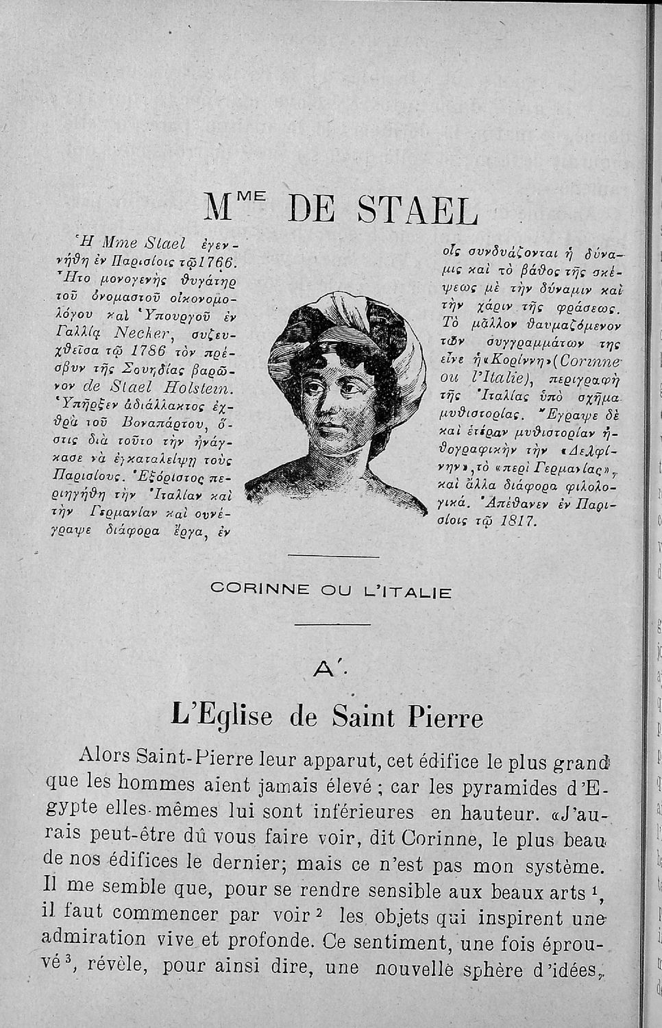 Σχολικό εγχειρίδιο Γαλλικών Γ΄ Γυμνασίου που περιλαμβάνει κείμενα των Bernadin de st. Pierre, Mme Stael, E. Renan, Prosper Merimme, Corneille, Racine, Boileau, A. Chenier, Beranger, Lamartine, Delavigne, V. Hugo και επεξηγηματικές σημειώσεις.
