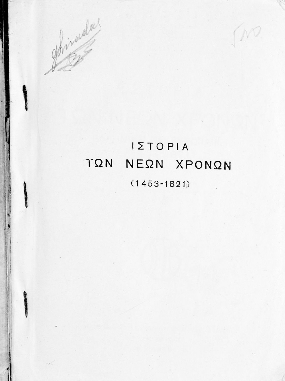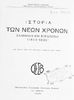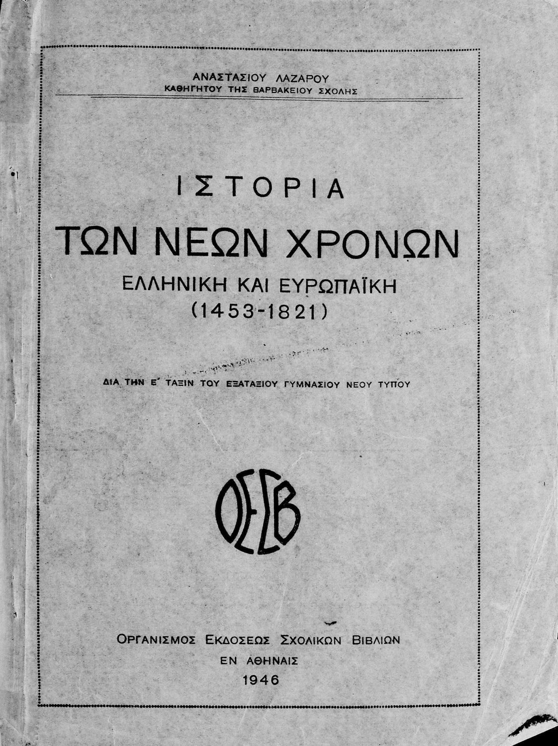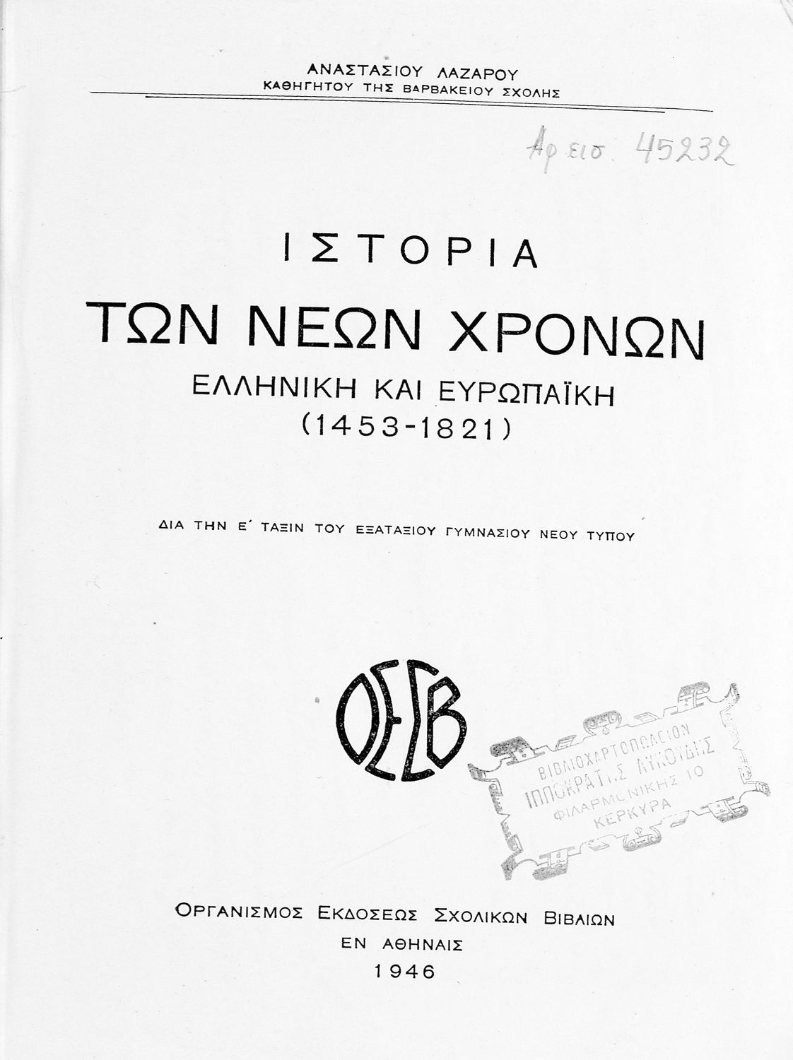 Κωδικός αναγνώρισης: 01-45232 Τίτλος: Ιστορία των νεότερων χρόνων. Ελληνική και Ευρωπαϊκή (1453-1821). Δια την Ε΄ Τάξιν του Εξατάξιου Γυμνασίου Νέου Τύπου Συγγραφέας: Αναστ. Λαζάρου Μέγεθος και υπόστρωμα: Σχολικό εγχειρίδιο, 262 σελίδες. Σκίτσα, χάρτης, εικόνες (ασπρόμαυρα). |