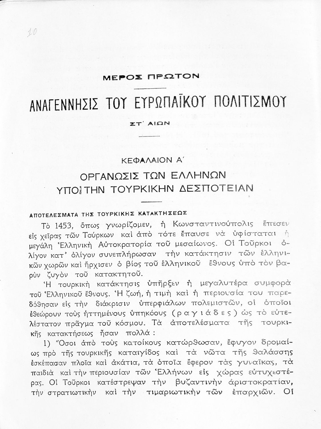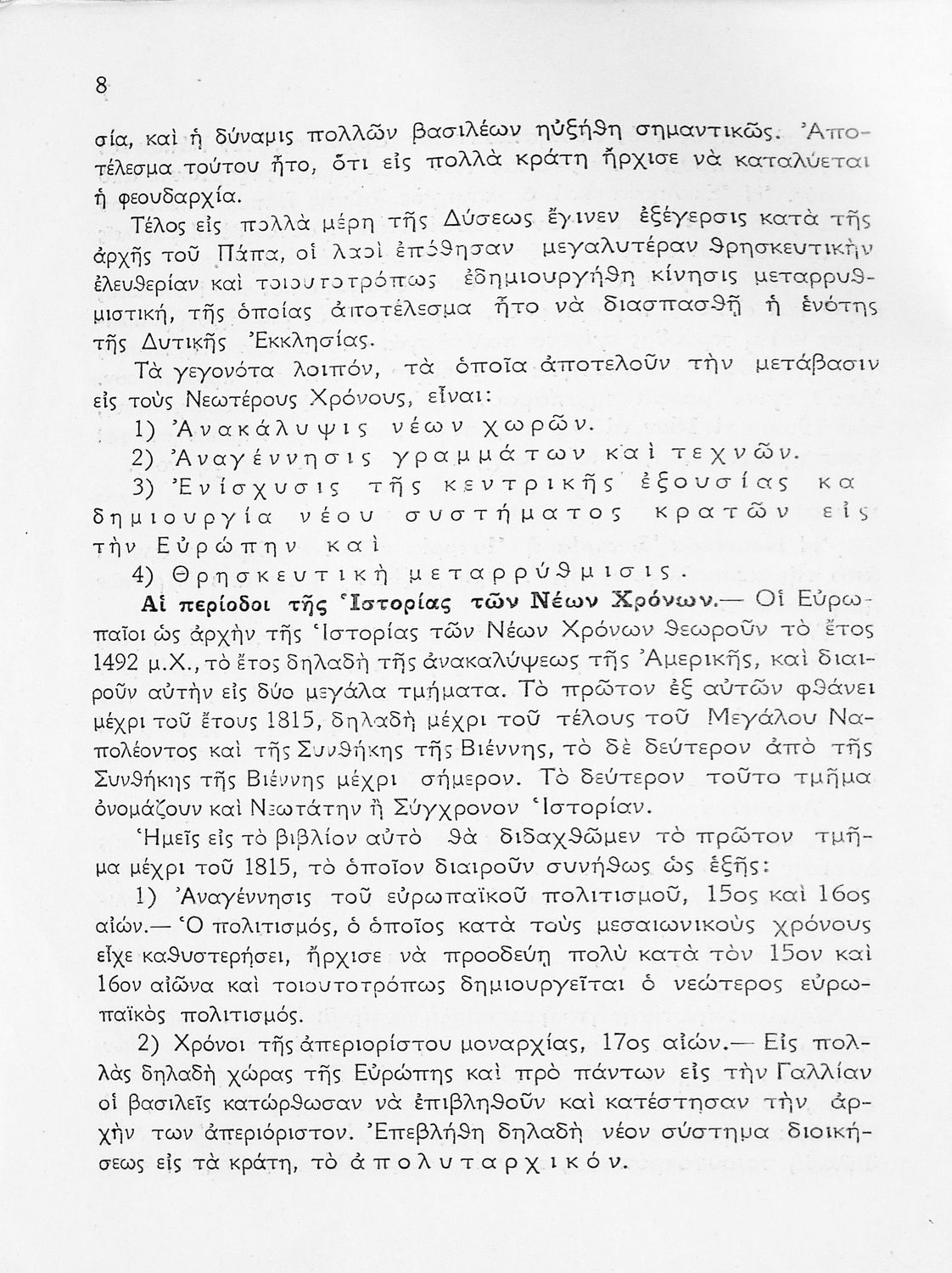 Βαθμίδα εκπαίδευσης: Δευτεροβάθμια Τάξη: Ε' Γυμνασίου Μάθημα: Ιστορία Γλώσσα: Απλή καθαρεύουσα Παρουσίαση περιεχομένου: Σχολικό εγχειρίδιο Ιστορίας Ε΄ Γυμνασίου που καλύπτει την περίοδο της Αναγέννησης και του Διαφωτισμού στην Ευρώπη και την προετοιμασία της Ελληνικής Επανάστασης. |