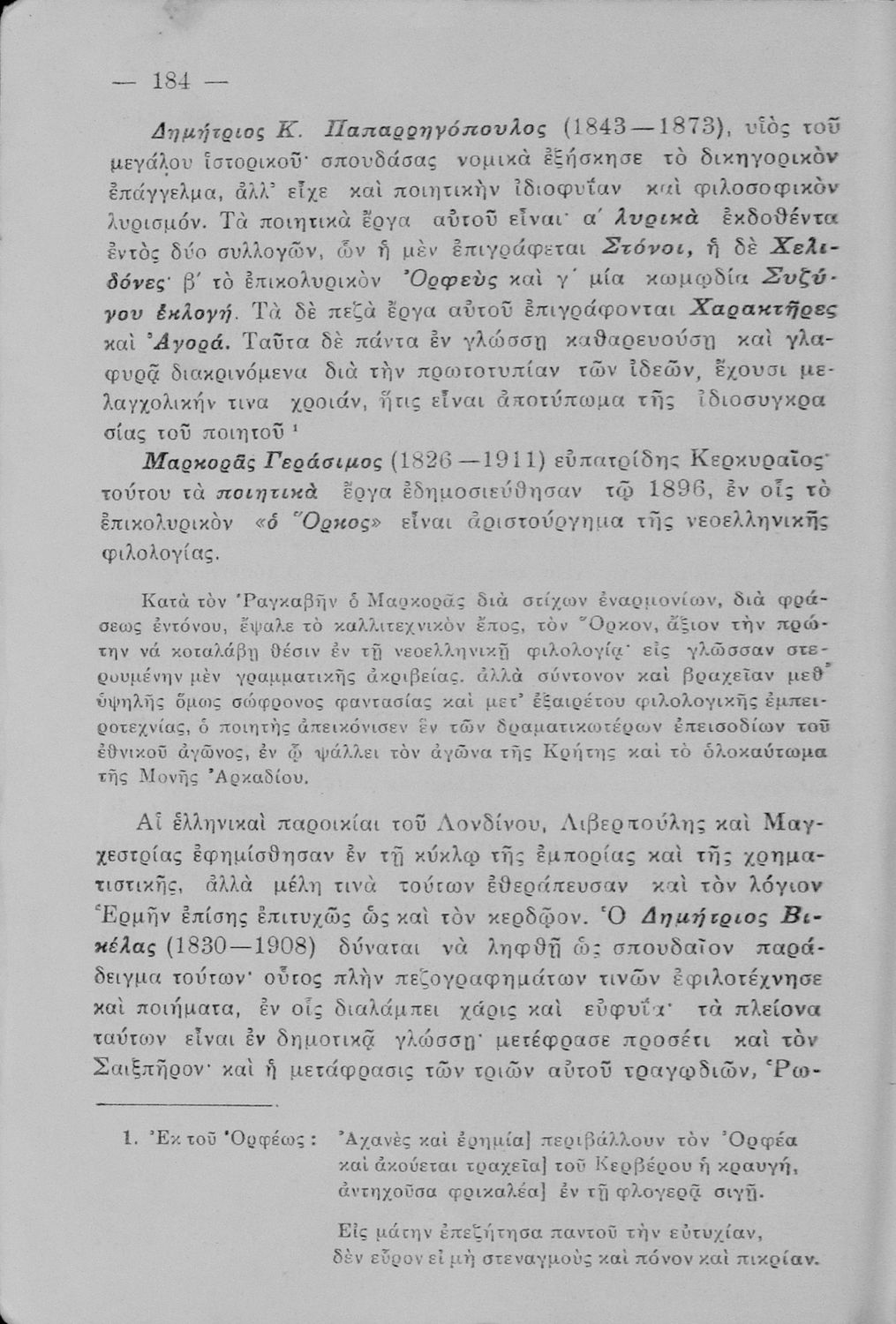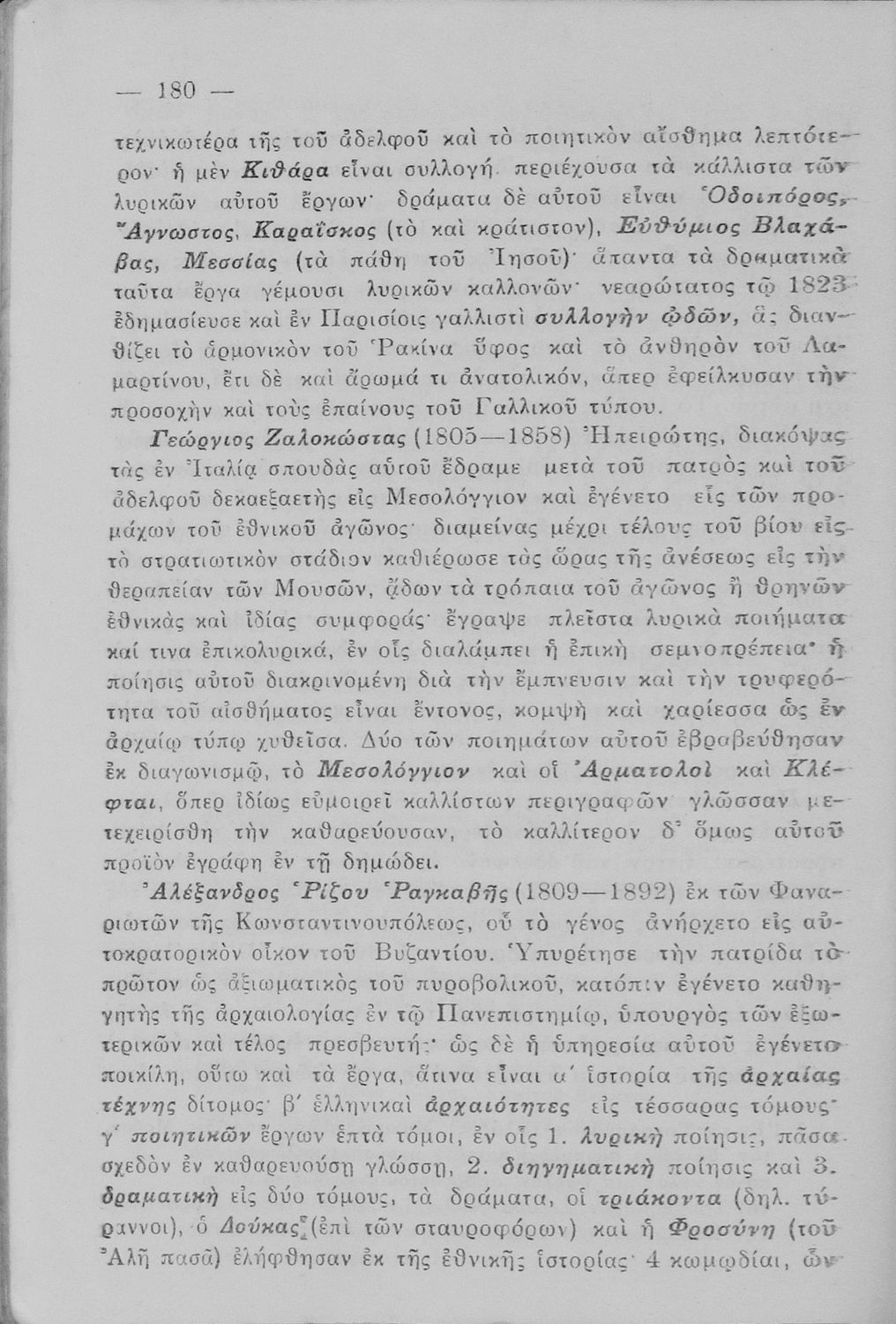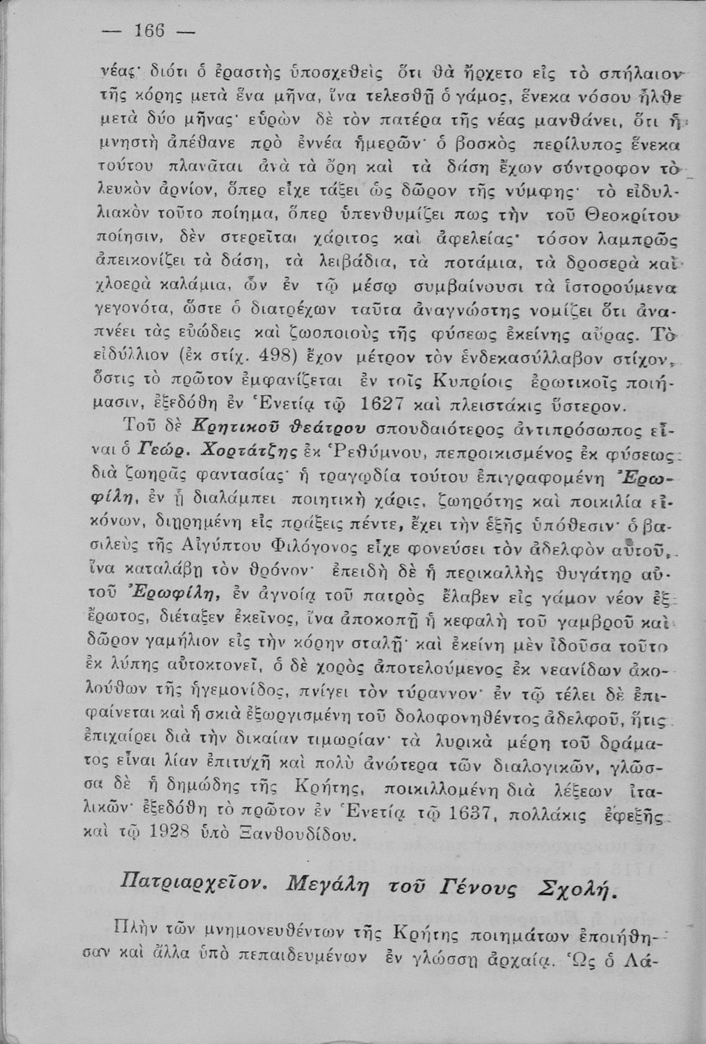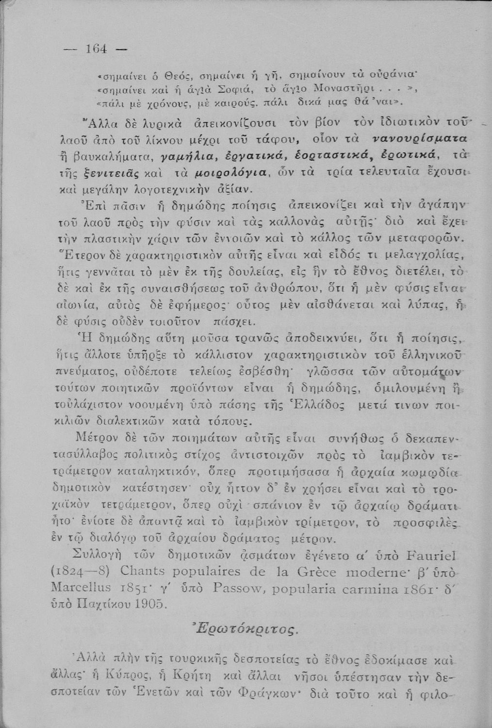 Σχολικό εγχειρίδιο Αρχαίων και Νέων Ελληνικών για τις Γ΄, Δ΄, Ε΄, ΣΤ΄ Γυμνασίου που παρουσιάζει τα είδη λογοτεχνίας και την εξέλιξη της ελληνικής γλώσσας από την εποχή του Όμηρου μέχρι την Ελληνική Επανάσταση. Περιέχει και αναφορά στα δημοτικά τραγούδια και σύντομα βιογραφικά σημειώματα επιφανών λογοτεχνών. Ο συγγραφέας ήταν Καθηγητής Ελληνικών Γραμμάτων στο Εθνικό Πανεπιστήμιο και Γυμνασιάρχης στο Αρσάκειο.