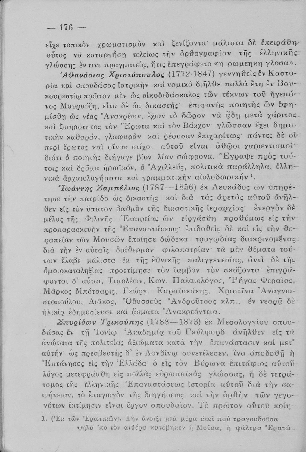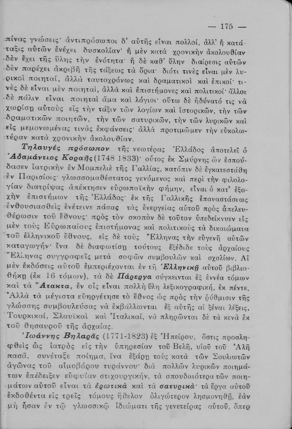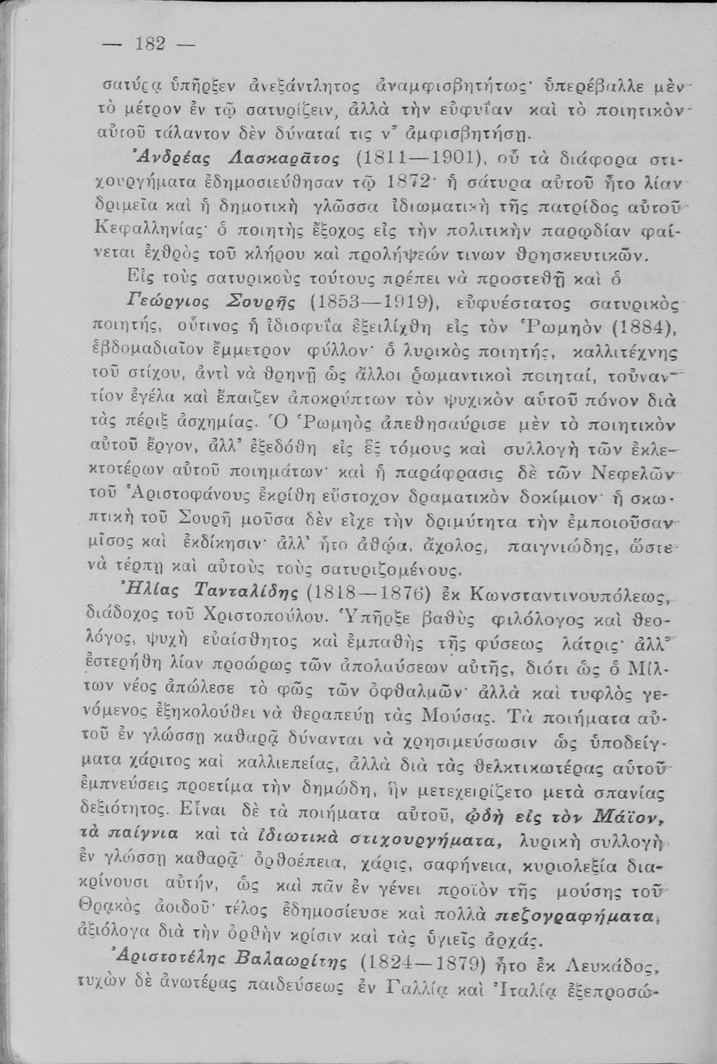 Σχολικό εγχειρίδιο Αρχαίων και Νέων Ελληνικών για τις Γ΄, Δ΄, Ε΄, ΣΤ΄ Γυμνασίου που παρουσιάζει τα είδη λογοτεχνίας και την εξέλιξη της ελληνικής γλώσσας από την εποχή του Όμηρου μέχρι την Ελληνική Επανάσταση. Περιέχει και αναφορά στα δημοτικά τραγούδια και σύντομα βιογραφικά σημειώματα επιφανών λογοτεχνών. Ο συγγραφέας ήταν Καθηγητής Ελληνικών Γραμμάτων στο Εθνικό Πανεπιστήμιο και Γυμνασιάρχης στο Αρσάκειο.