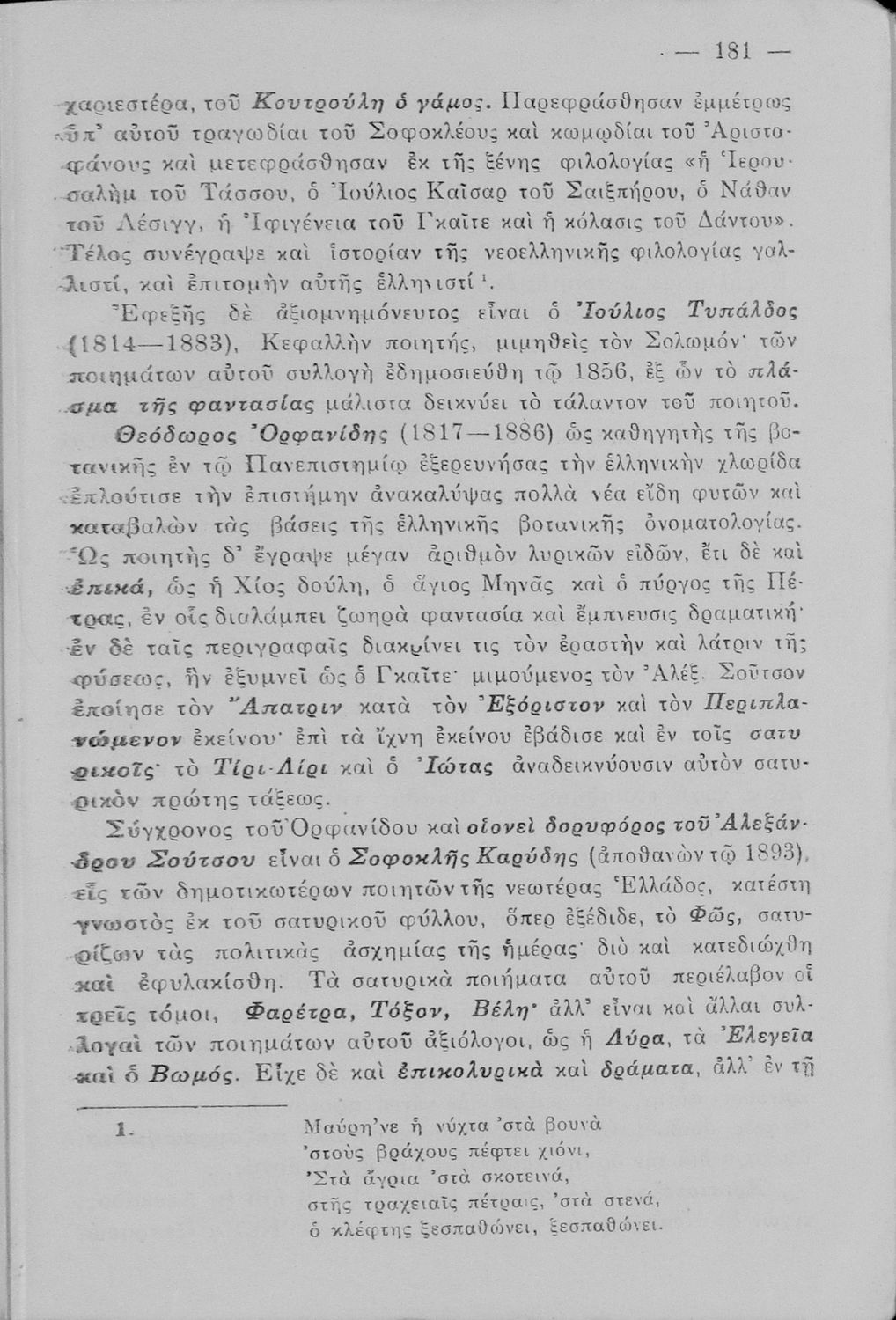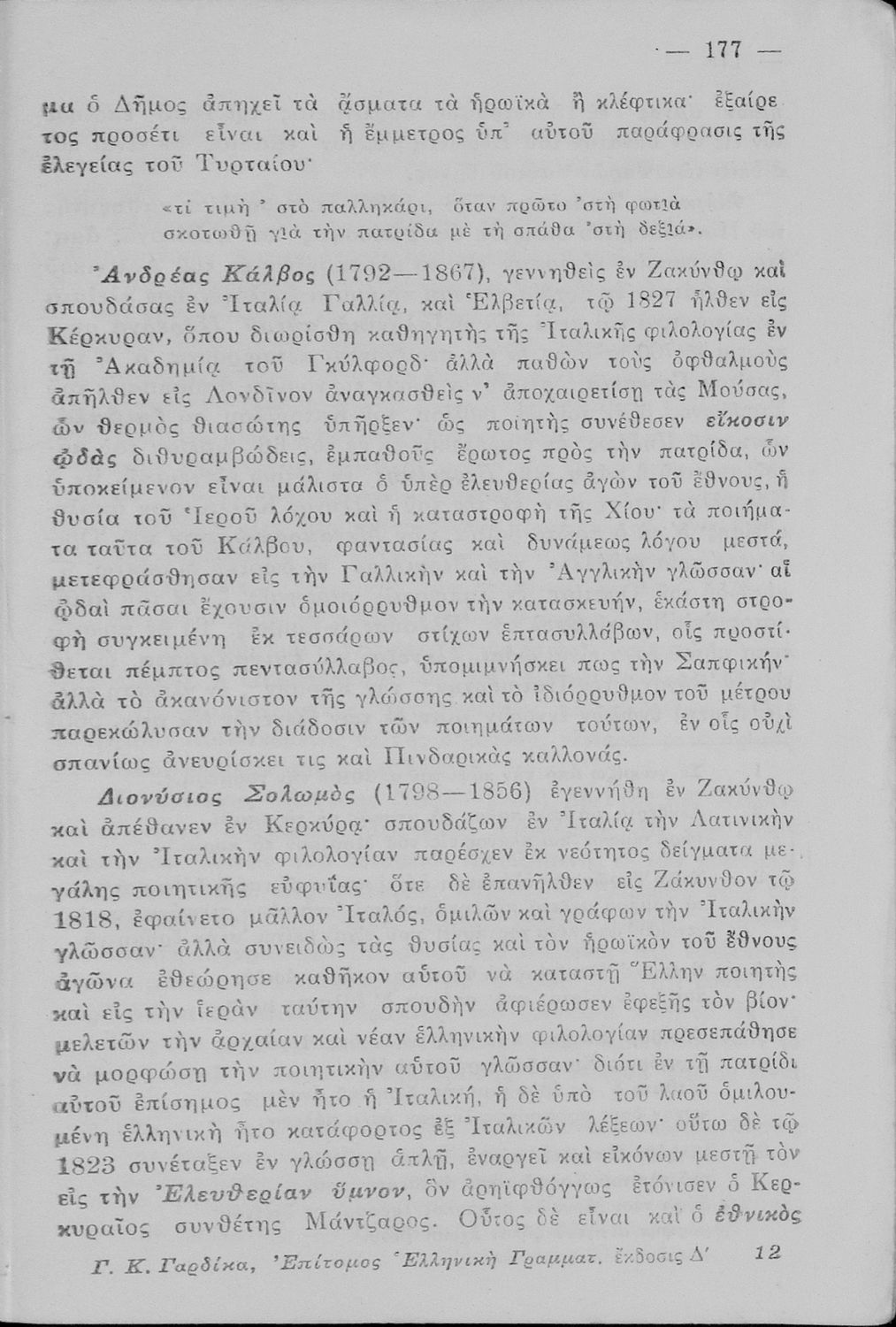 Παρουσίαση περιεχομένου: Σχολικό εγχειρίδιο Αρχαίων και Νέων Ελληνικών για τις Γ΄, Δ΄, Ε΄, ΣΤ΄ Γυμνασίου που παρουσιάζει τα είδη λογοτεχνίας και την εξέλιξη της ελληνικής γλώσσας από την εποχή του Όμηρου μέχρι την Ελληνική Επανάσταση. Περιέχει και αναφορά στα δημοτικά τραγούδια και σύντομα βιογραφικά σημειώματα επιφανών λογοτεχνών. Ο συγγραφέας ήταν Καθηγητής Ελληνικών Γραμμάτων στο Εθνικό Πανεπιστήμιο και Γυμνασιάρχης στο Αρσάκειο.