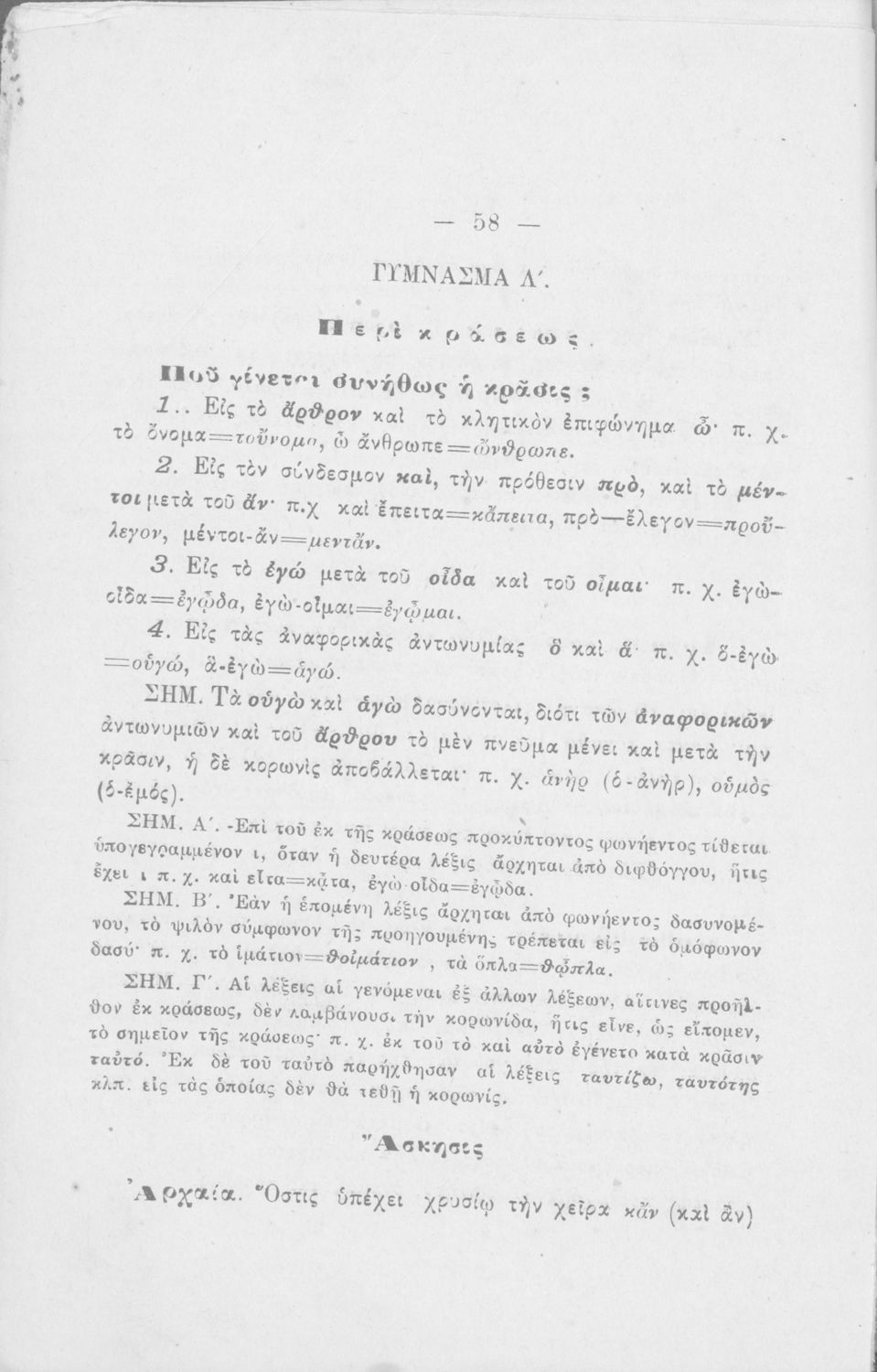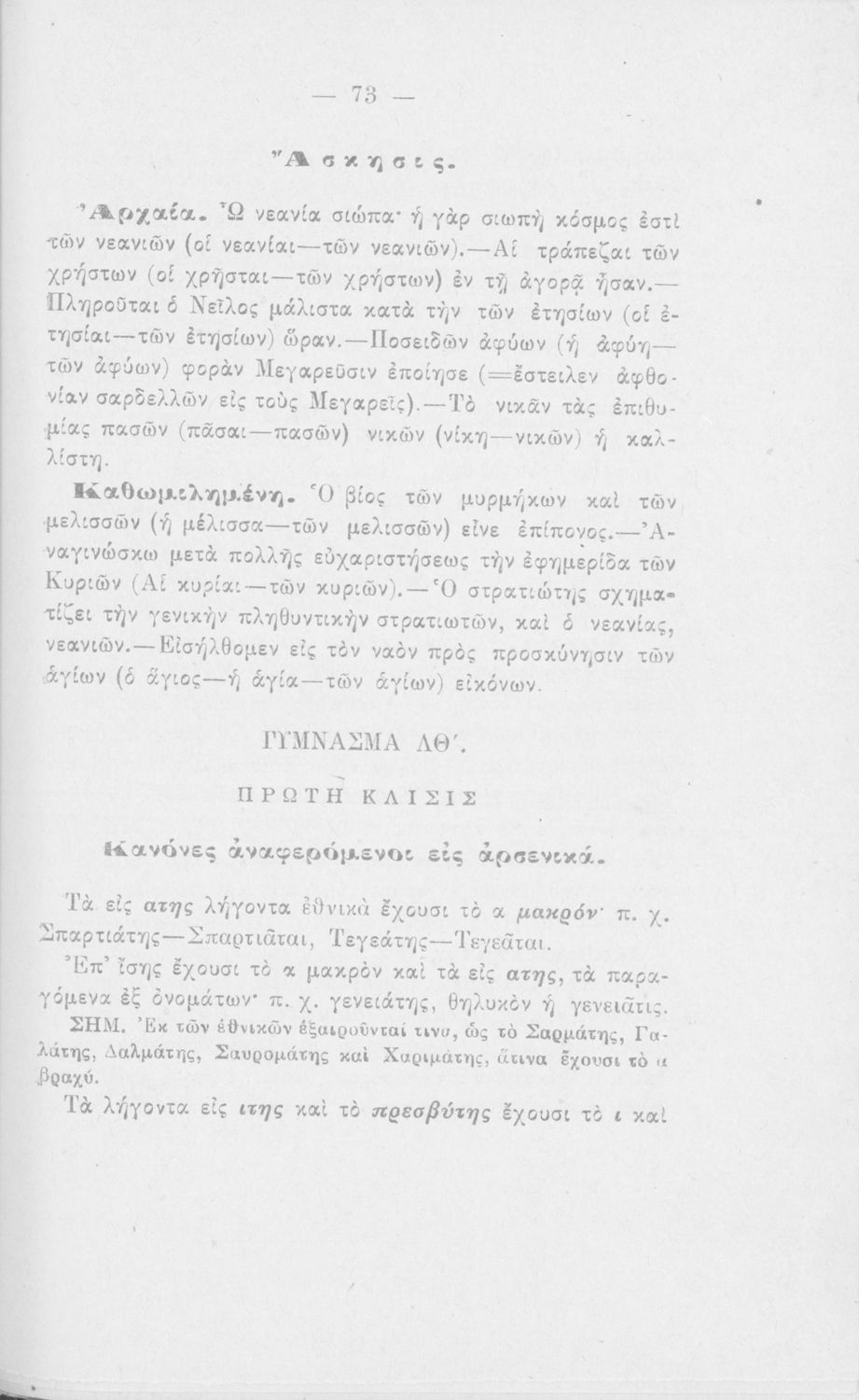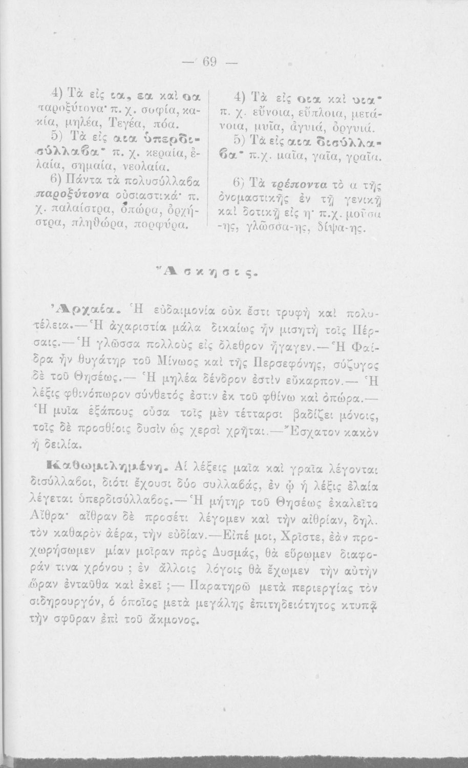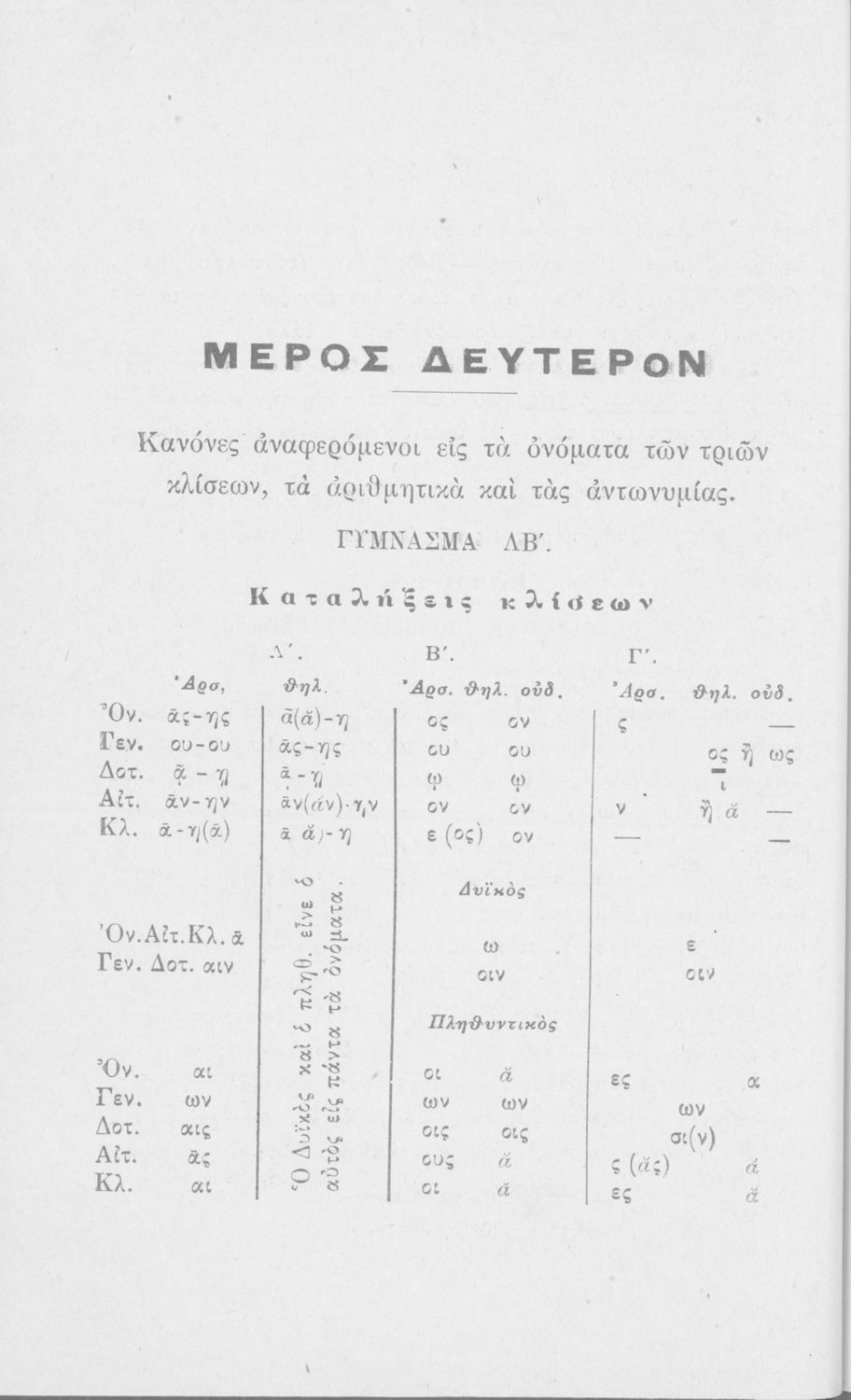 Σχολικό εγχειρίδιο Αρχαίων Ελληνικών για τους μαθητές των Ελληνικών Σχολείων και Παρθεναγωγείων που εξετάζει τα μέρη του λόγου και την σύνταξή τους.