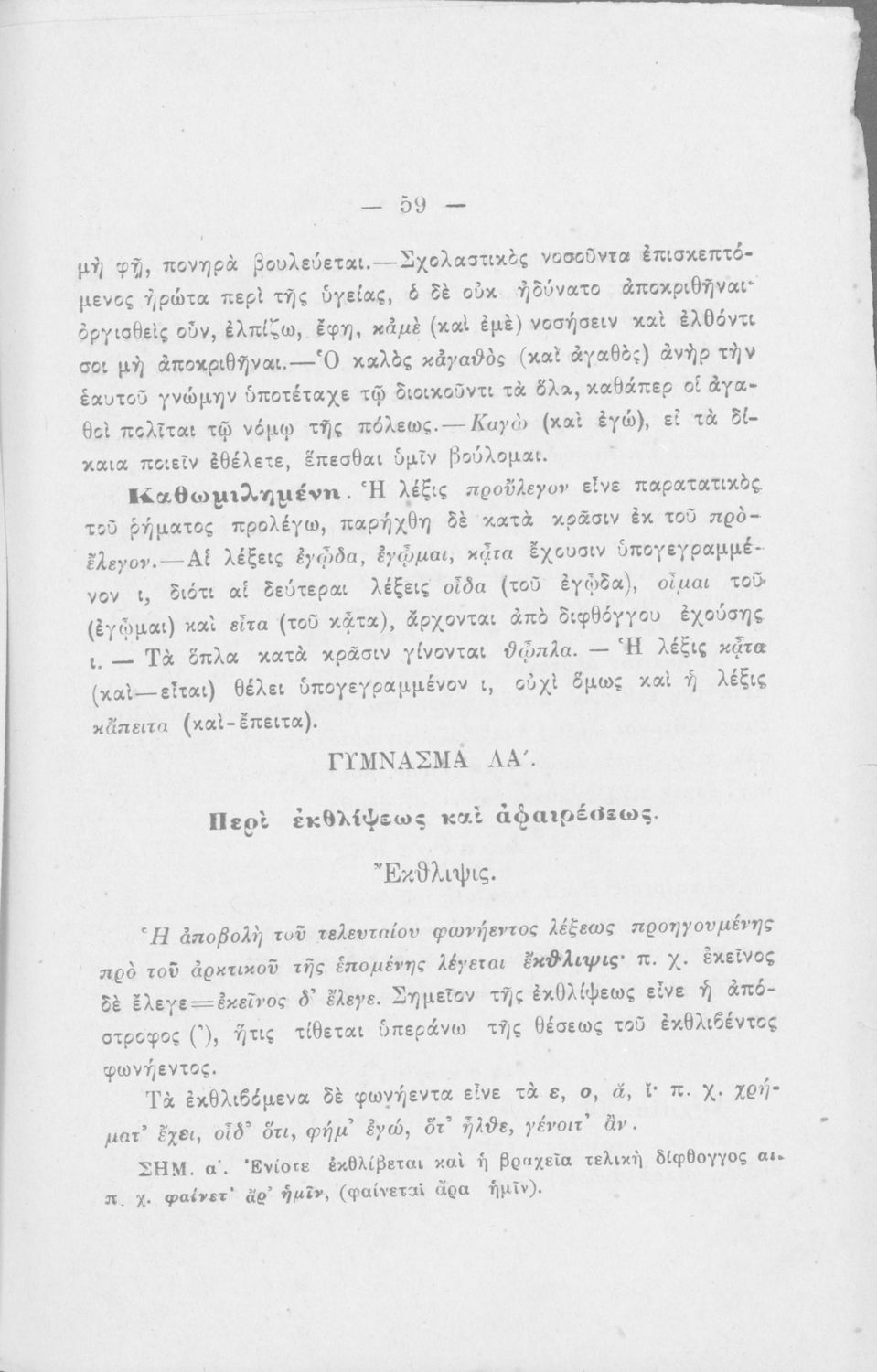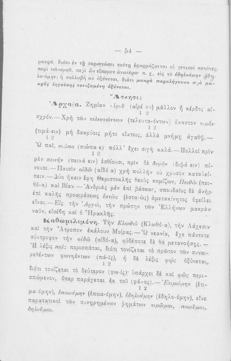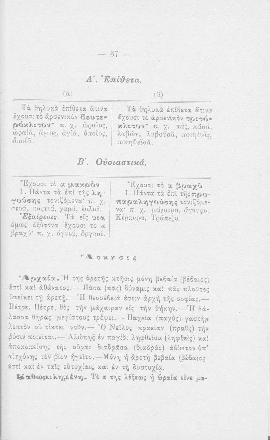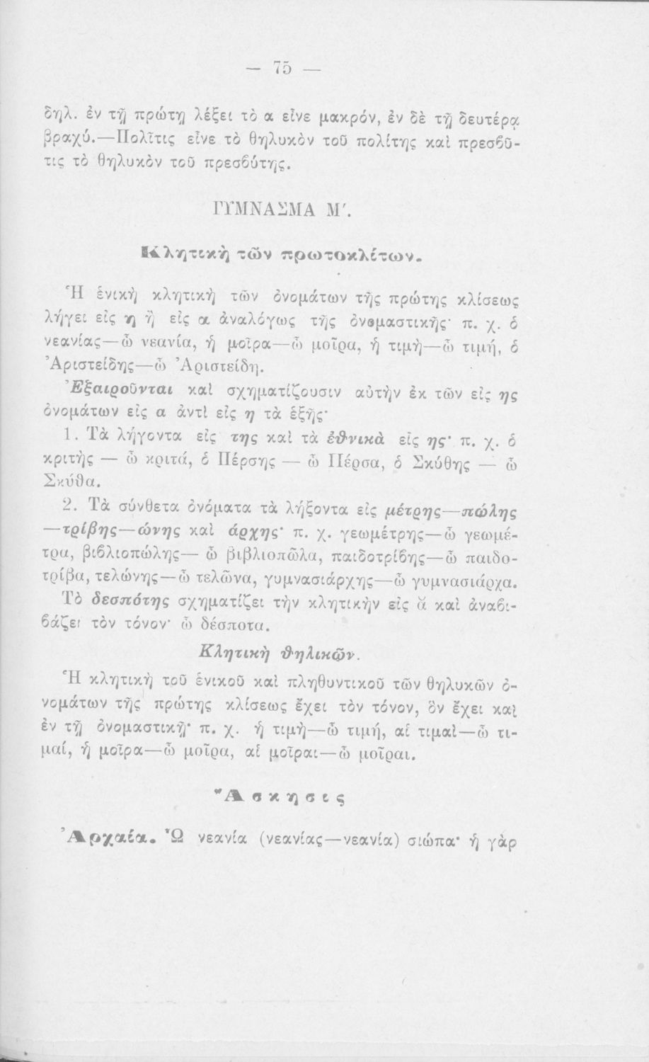 Σχολικό εγχειρίδιο Αρχαίων Ελληνικών για τους μαθητές των Ελληνικών Σχολείων και Παρθεναγωγείων που εξετάζει τα μέρη του λόγου και την σύνταξή τους.