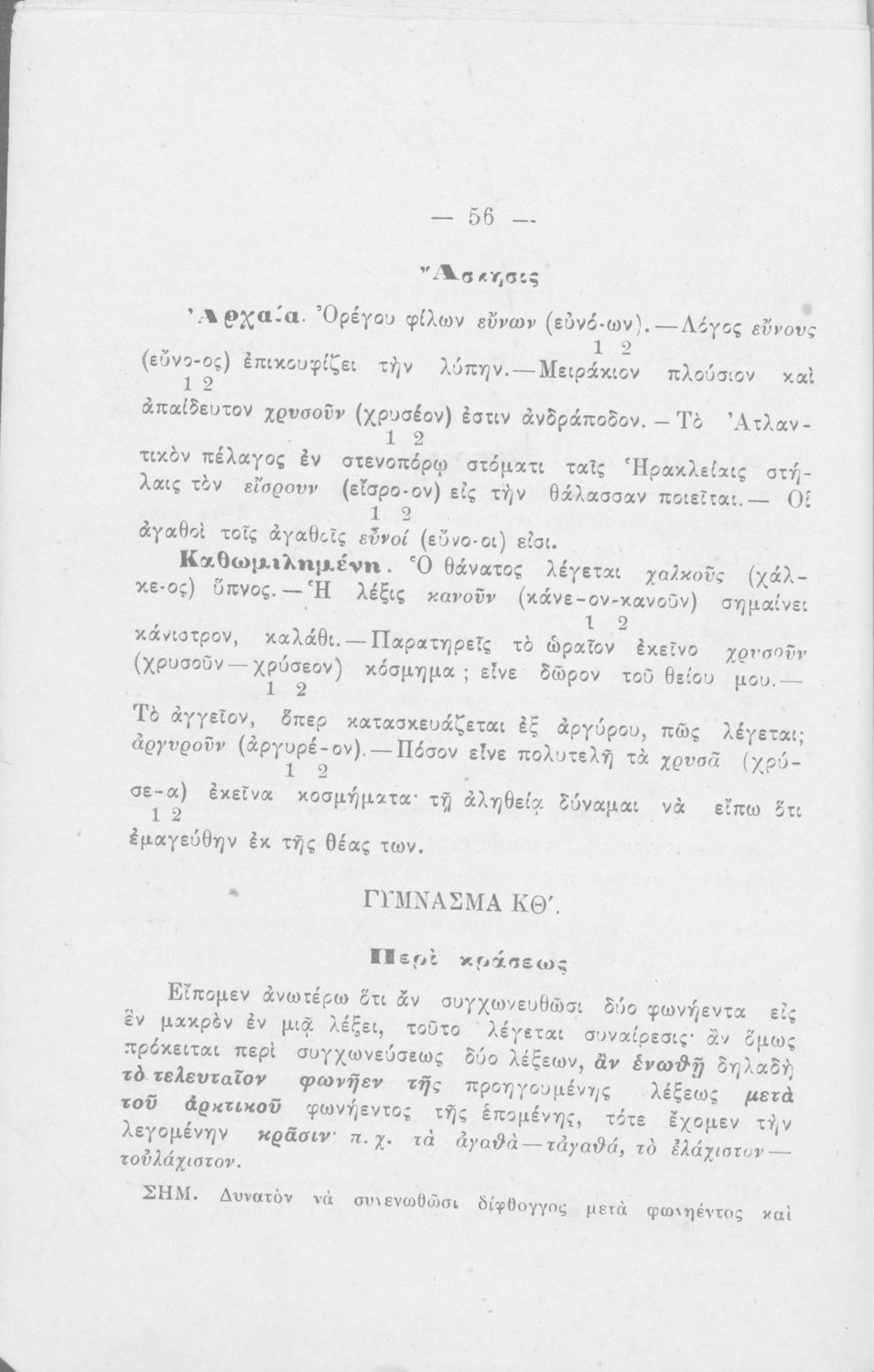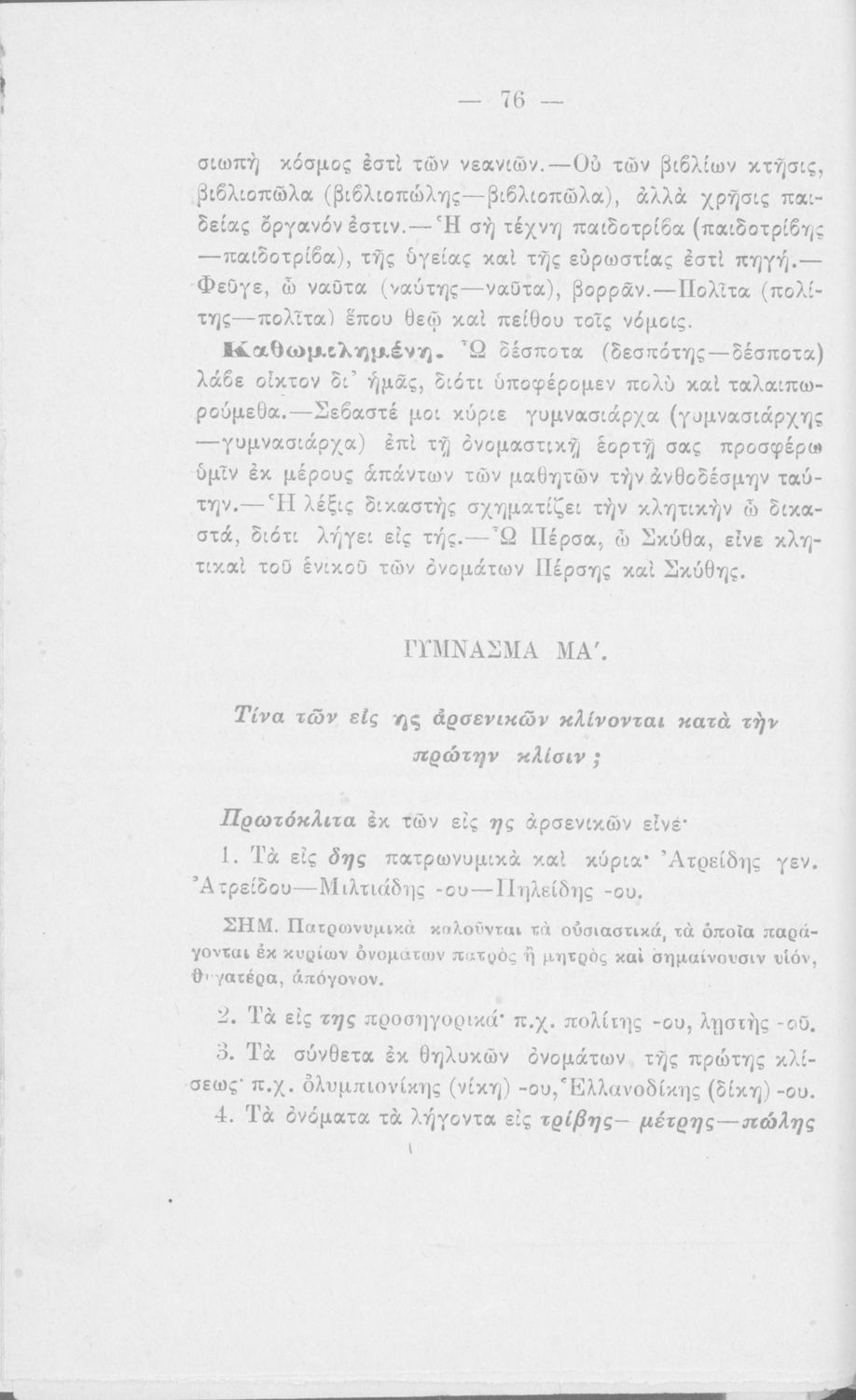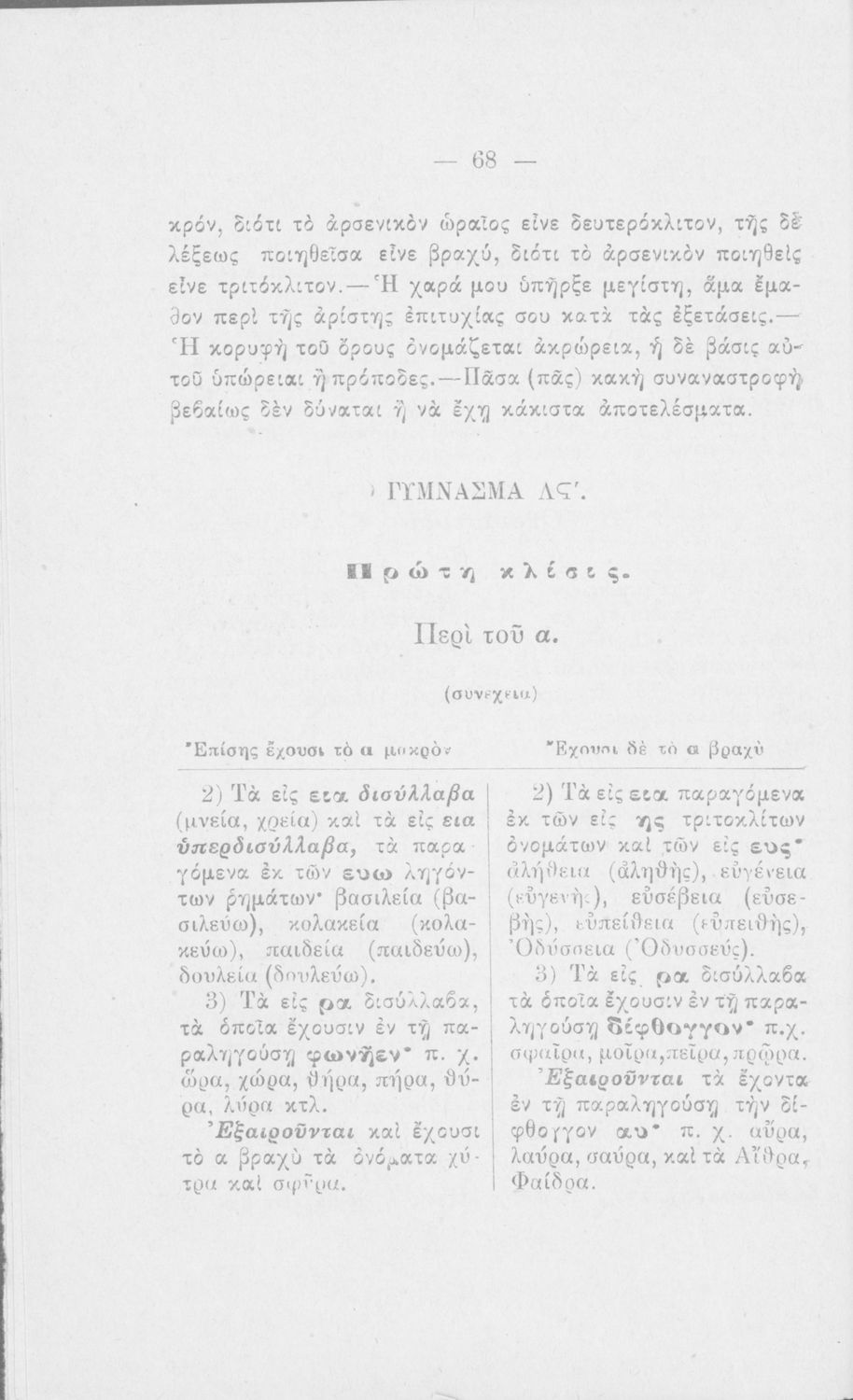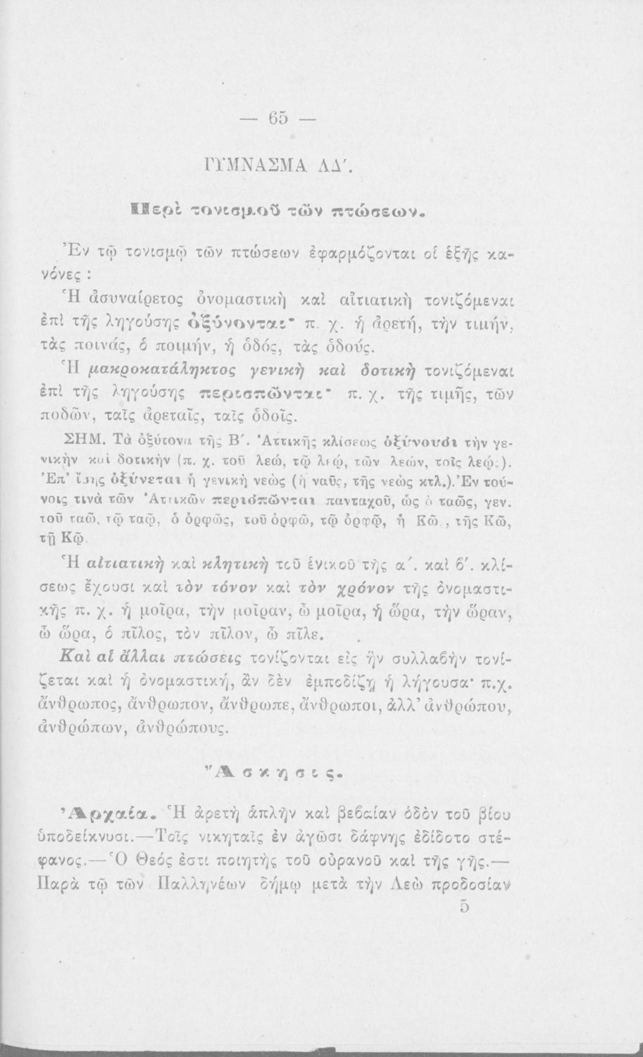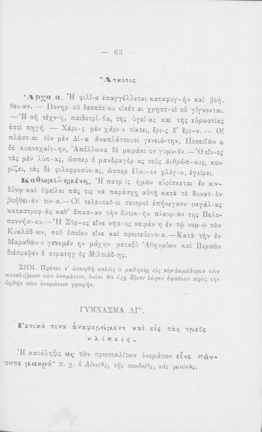 Σχολικό εγχειρίδιο Αρχαίων Ελληνικών για τους μαθητές των Ελληνικών Σχολείων και Παρθεναγωγείων που εξετάζει τα μέρη του λόγου και την σύνταξή τους.