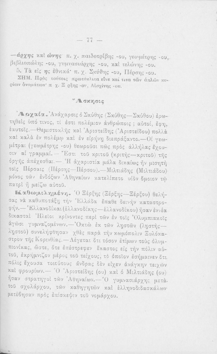 Σχολικό Εγχειρίδιο Αρχαίων Ελληνικών που περιλαμβάνει κείμενα προσαρμοσμένα στη διδασκαλία των γραμματικών και συντακτικών φαινομένων, και ερμηνευτικές και λεξιλογικές σημειώσεις.