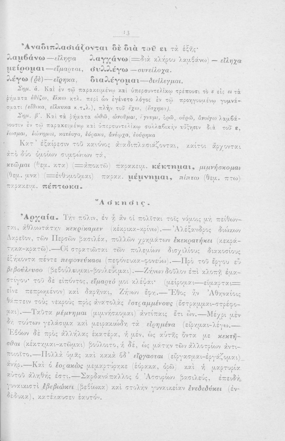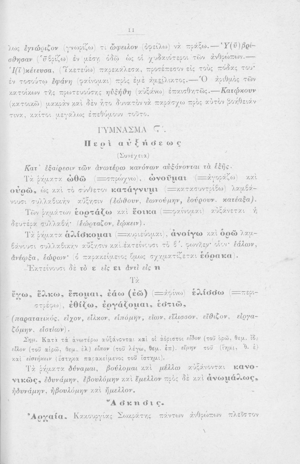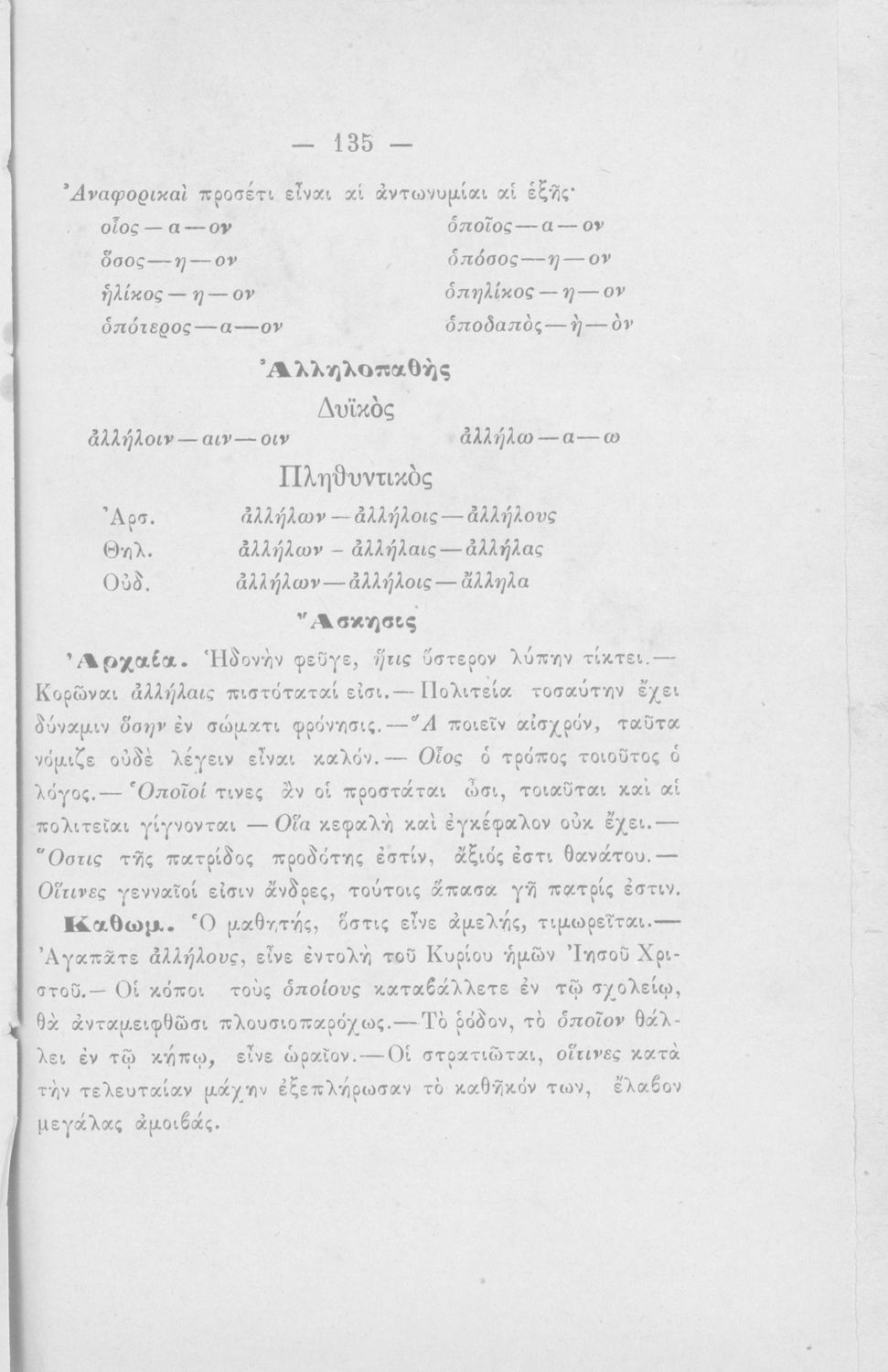 Σχολικό εγχειρίδιο Αρχαίων Ελληνικών για τους μαθητές των Ελληνικών Σχολείων και Παρθεναγωγείων που εξετάζει τα μέρη του λόγου και την σύνταξή τους.