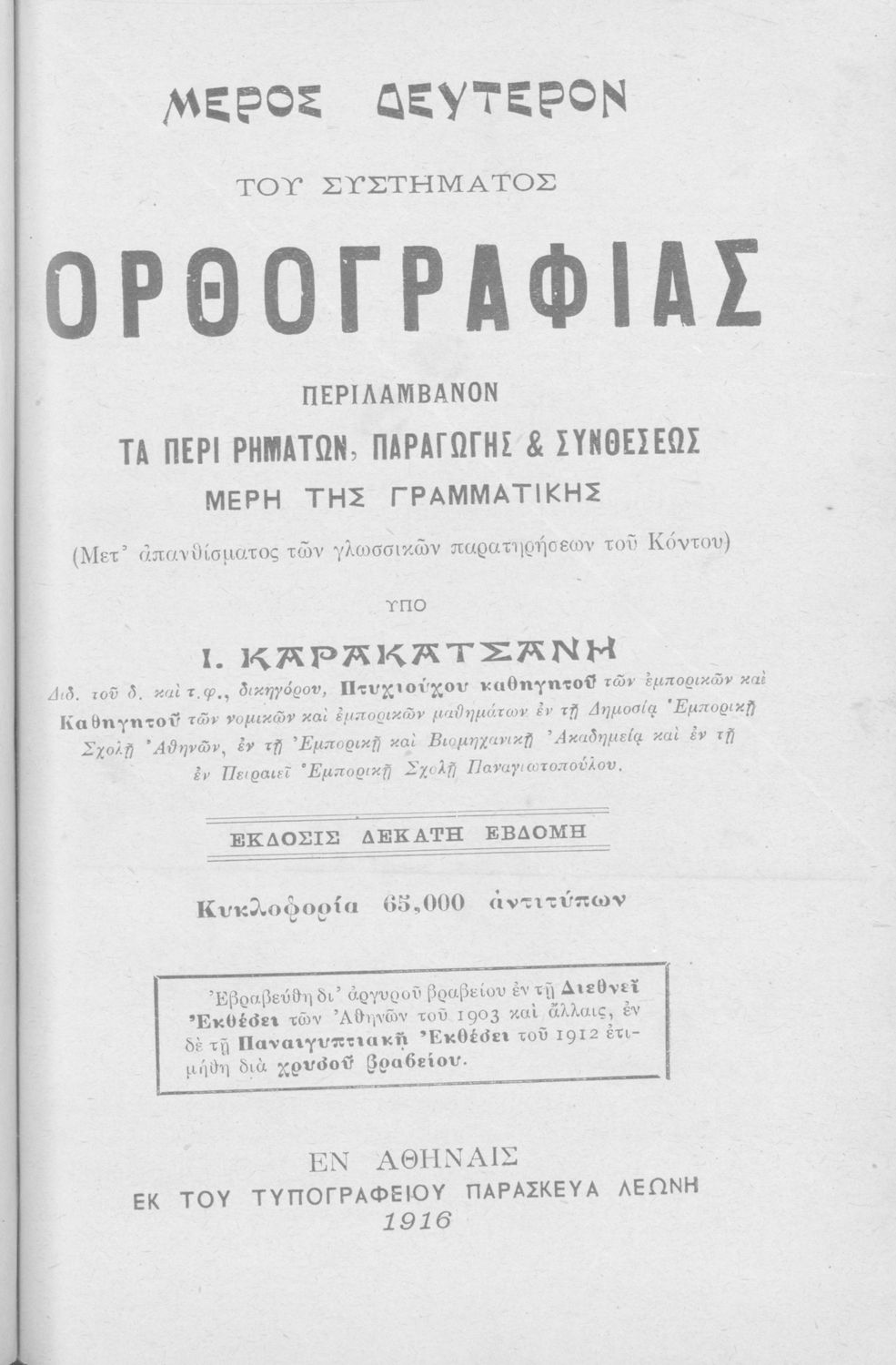 Τίτλος: Επίτομον Συντακτικόν της ελληνικής γλώσσης προς διδαχήν εν Ελληνικοίς σχολείοις και Παρθεναγωγείοις