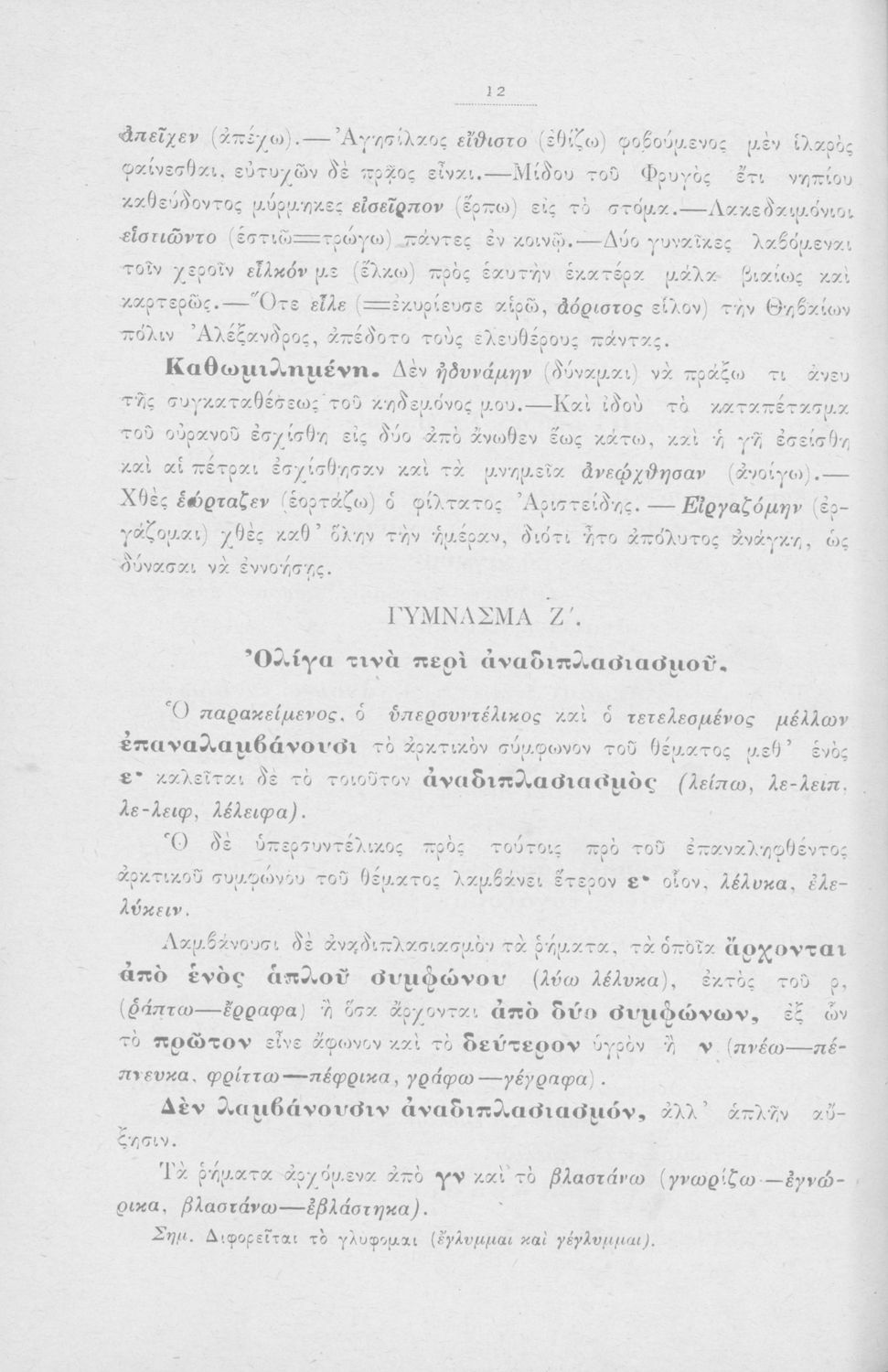 Σχολικό Εγχειρίδιο Αρχαίων Ελληνικών που περιλαμβάνει κείμενα προσαρμοσμένα στη διδασκαλία των γραμματικών και συντακτικών φαινομένων, και ερμηνευτικές και λεξιλογικές σημειώσεις.