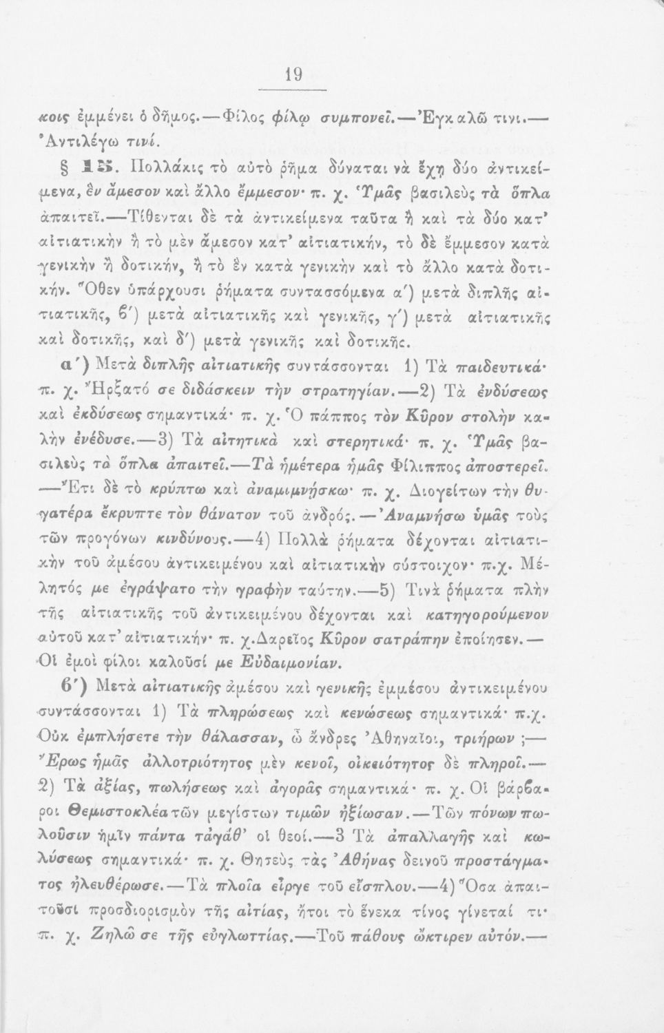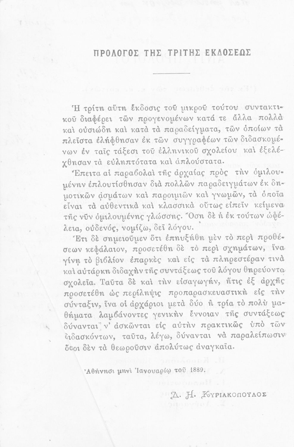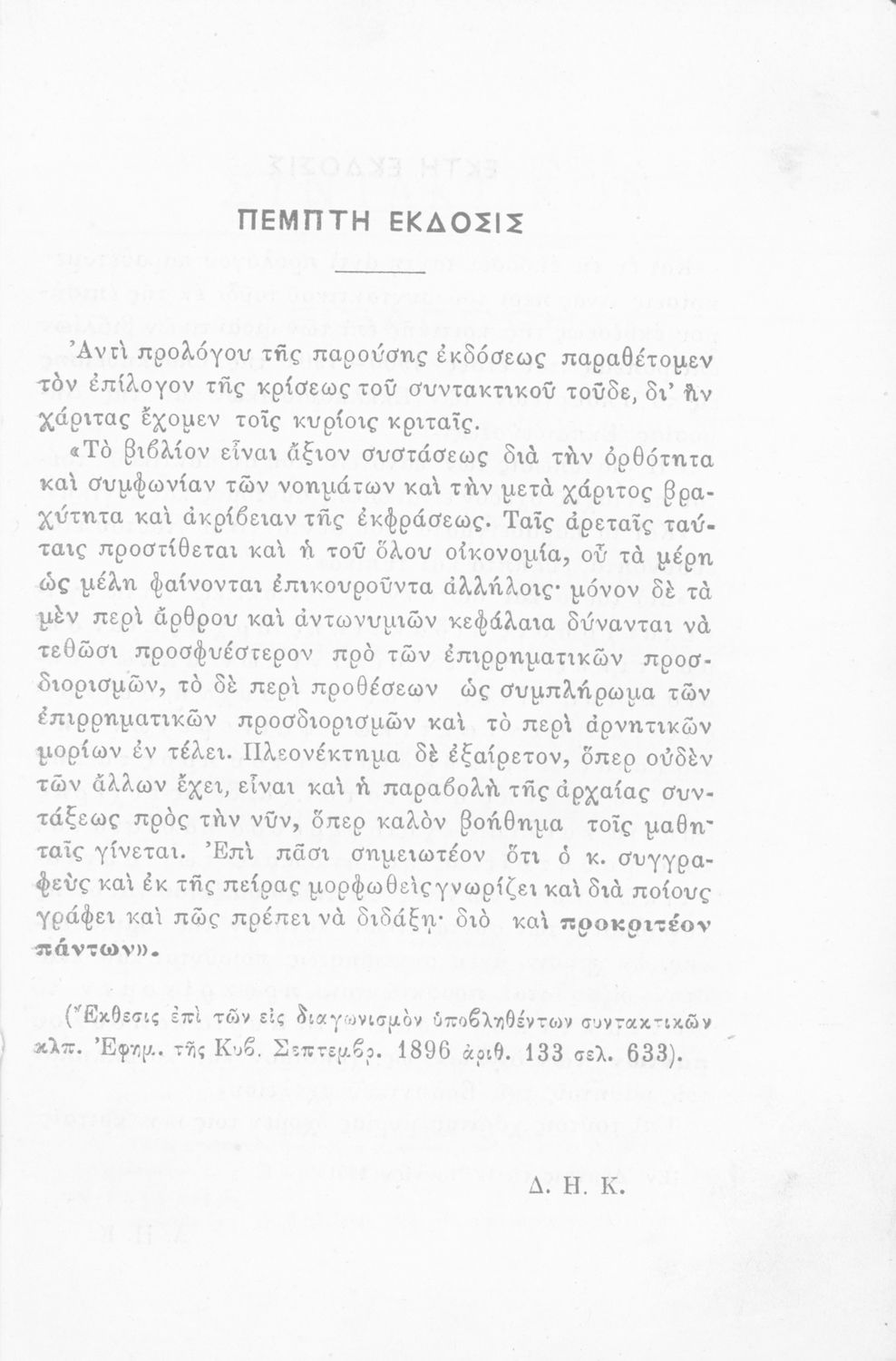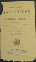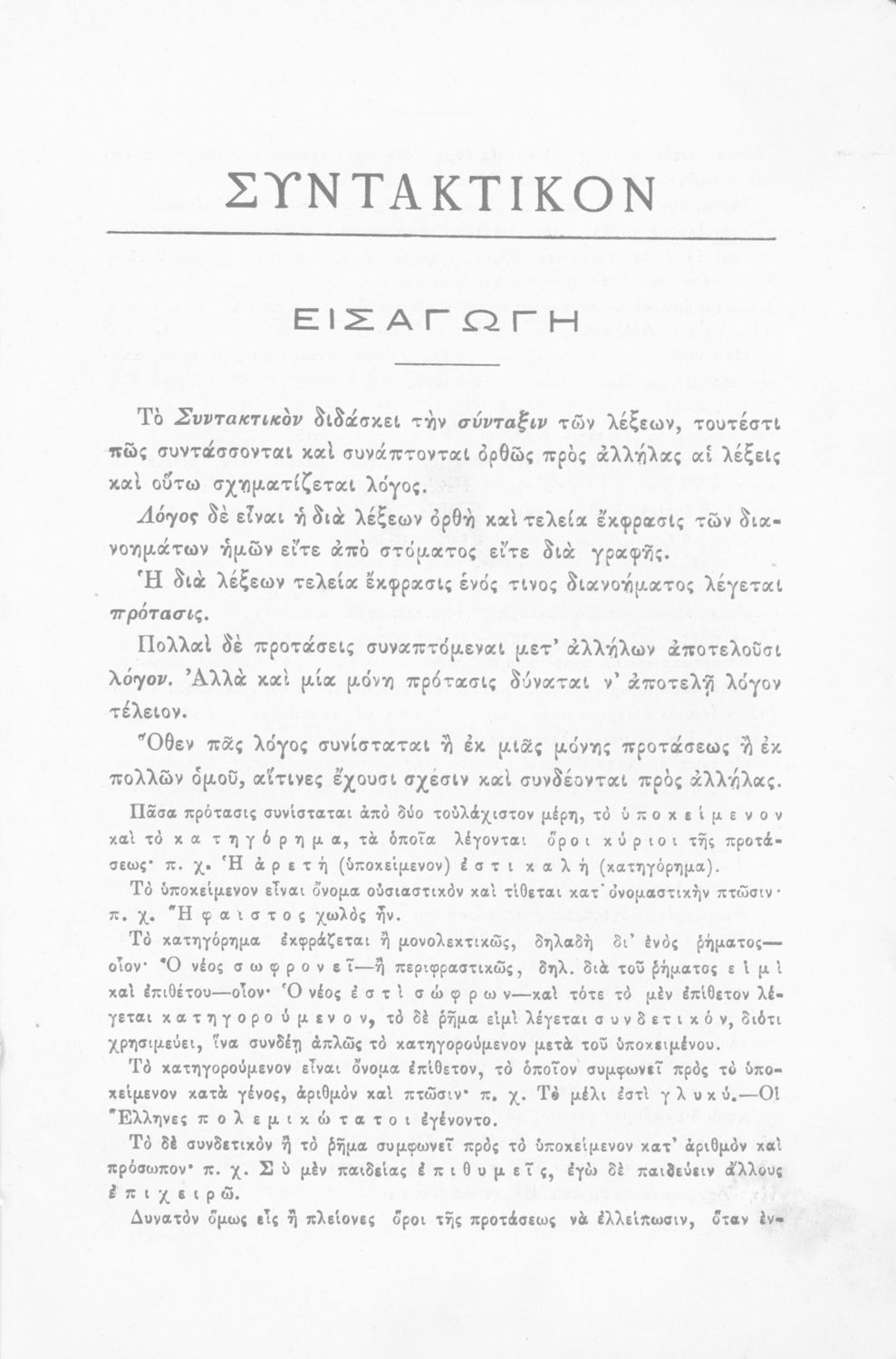 Σχολικό εγχειρίδιο Αρχαίων Ελληνικών για τους μαθητές των Ελληνικών Σχολείων και Παρθεναγωγείων που εξετάζει τα μέρη του λόγου και την σύνταξή τους.